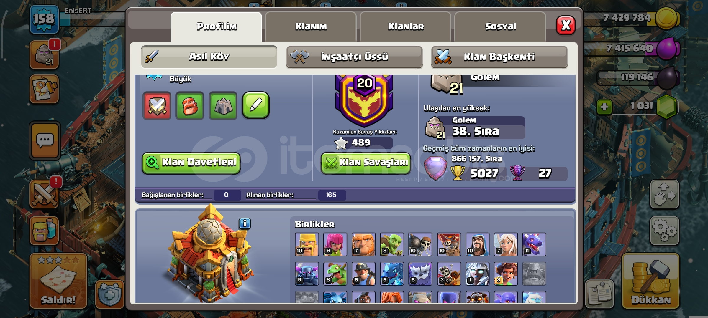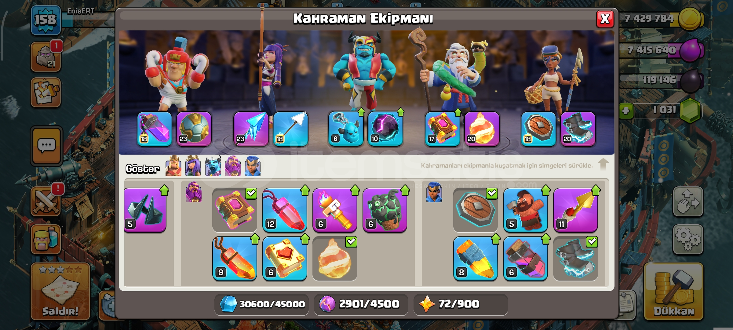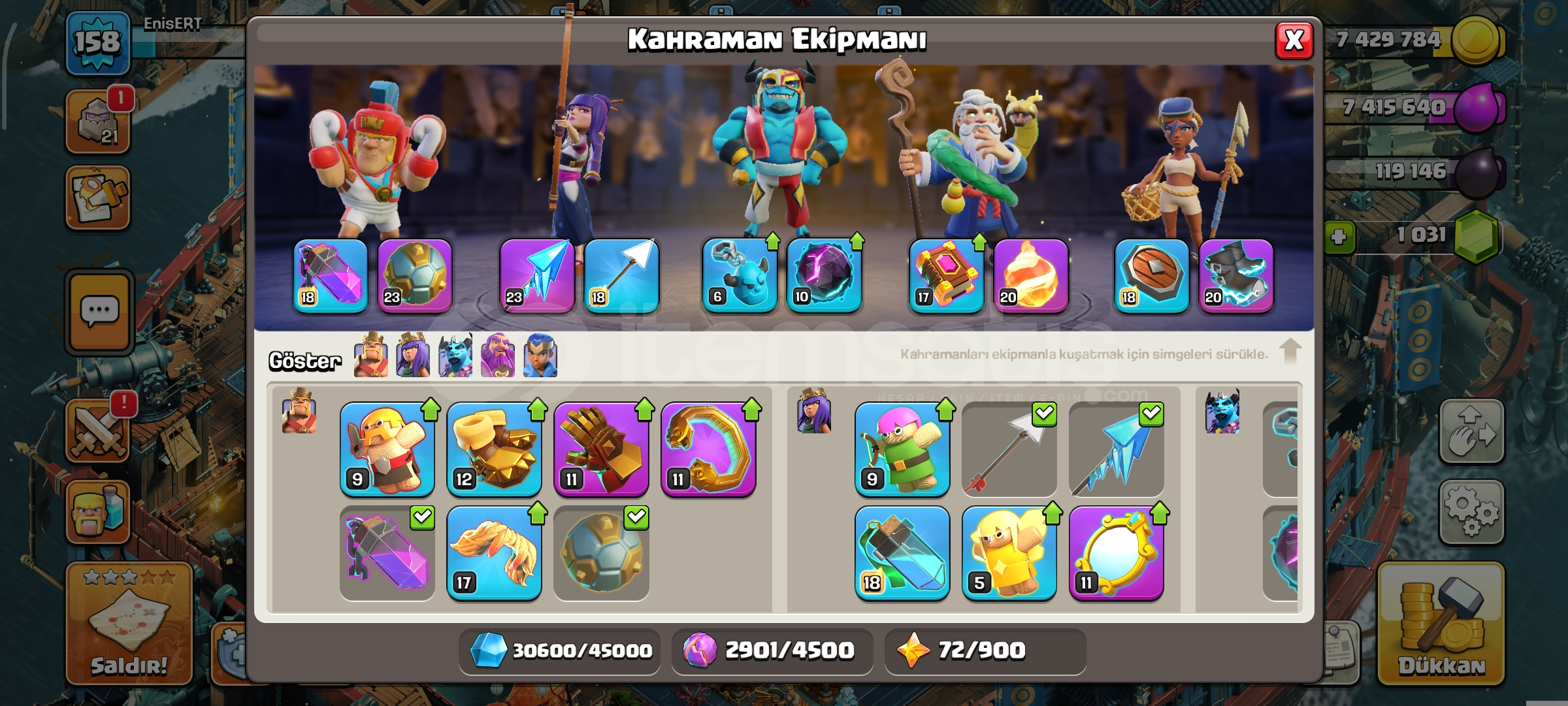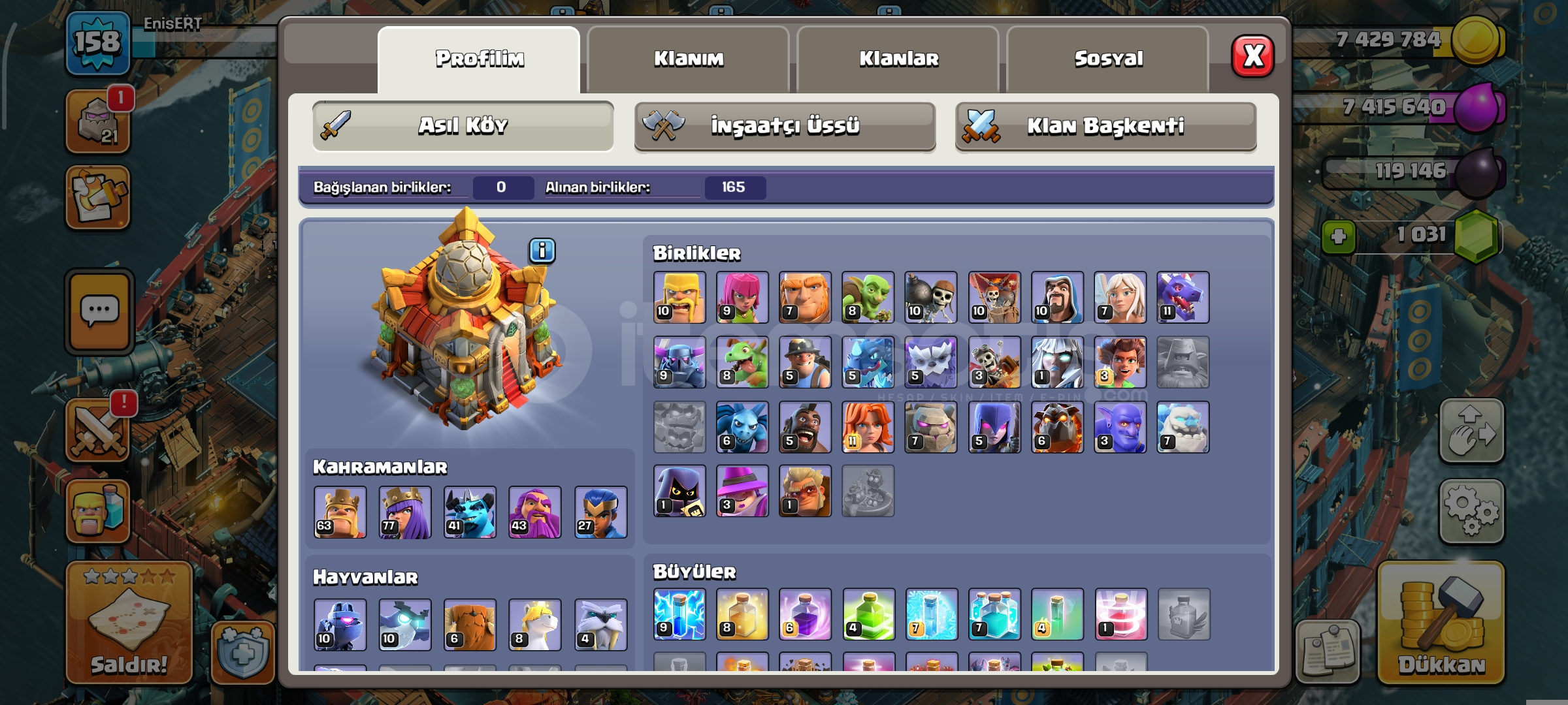 16 seviye belediye1 k taşlı158 seviye489 savaş yıldızlıKahramanlar 63-77-41-43-27183 lig madalyalıEKSTRA EKİPMANLAR-Dev eldiven-Dikenli top-Yılan bilekli-Donmuş ok-Sihirli ayna-Kara taç-Alev topu-Lav balon kuklası-Azim meşalesi-Roket mızrak-Elektiro çizmelerDetaylı bilgi için mesaj atınız yeterlidir