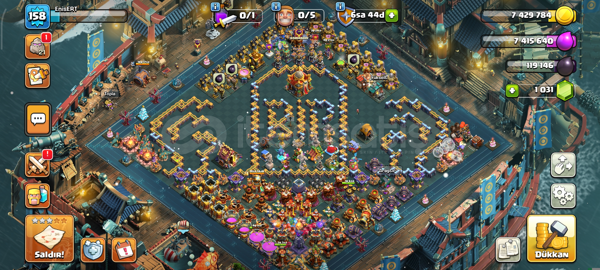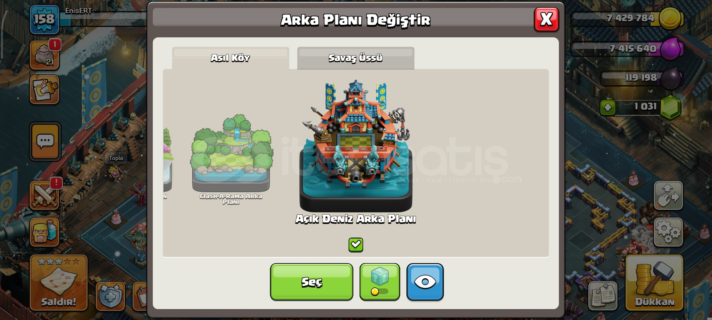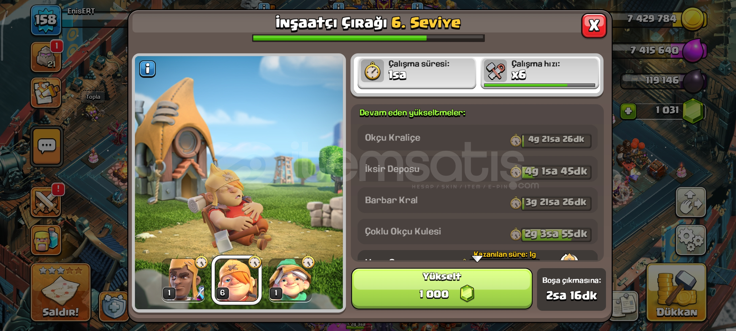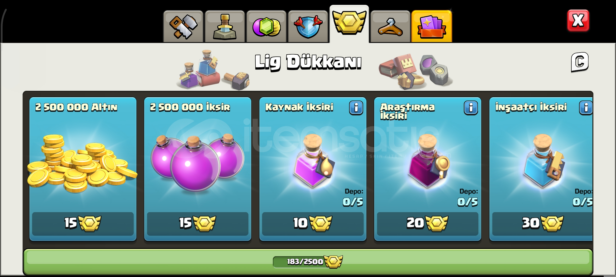 16 seviye belediye1 k taşlı158 seviye489 savaş yıldızlıKahramanlar 63-77-41-43-27183 lig madalyalıEKSTRA EKİPMANLAR-Dev eldiven-Dikenli top-Yılan bilekli-Donmuş ok-Sihirli ayna-Kara taç-Alev topu-Lav balon kuklası-Azim meşalesi-Roket mızrak-Elektiro çizmelerDetaylı bilgi için mesaj atınız yeterlidir