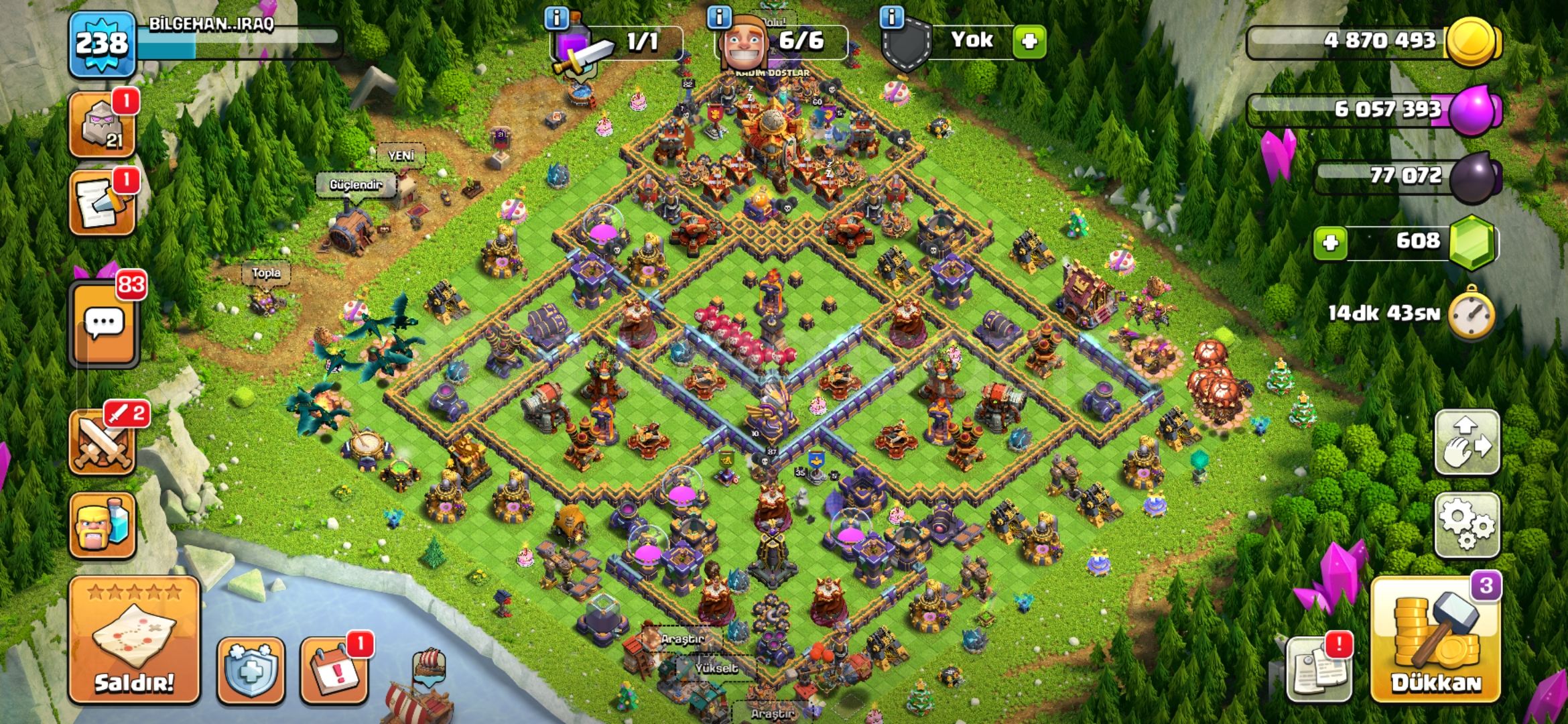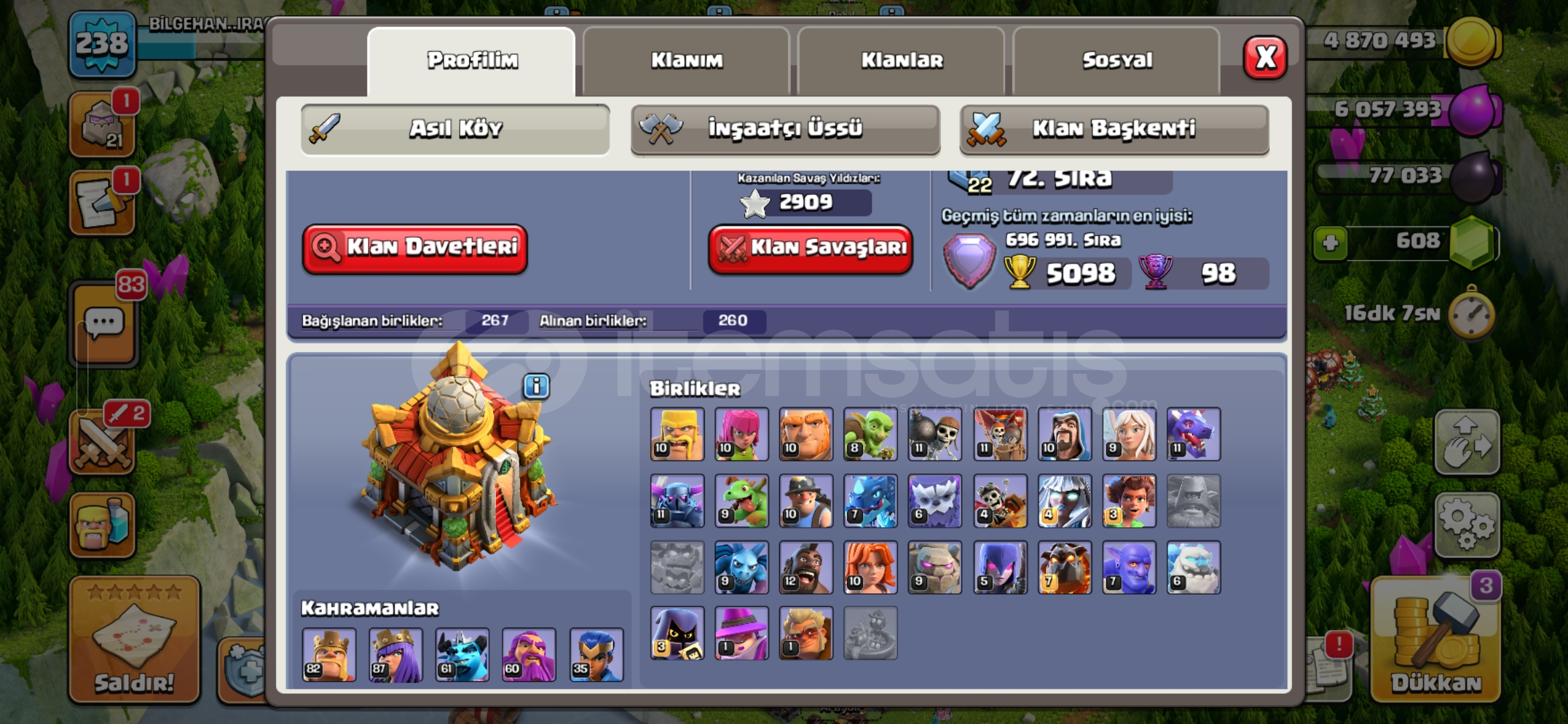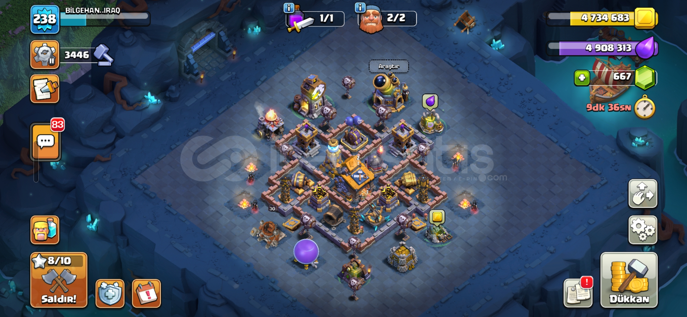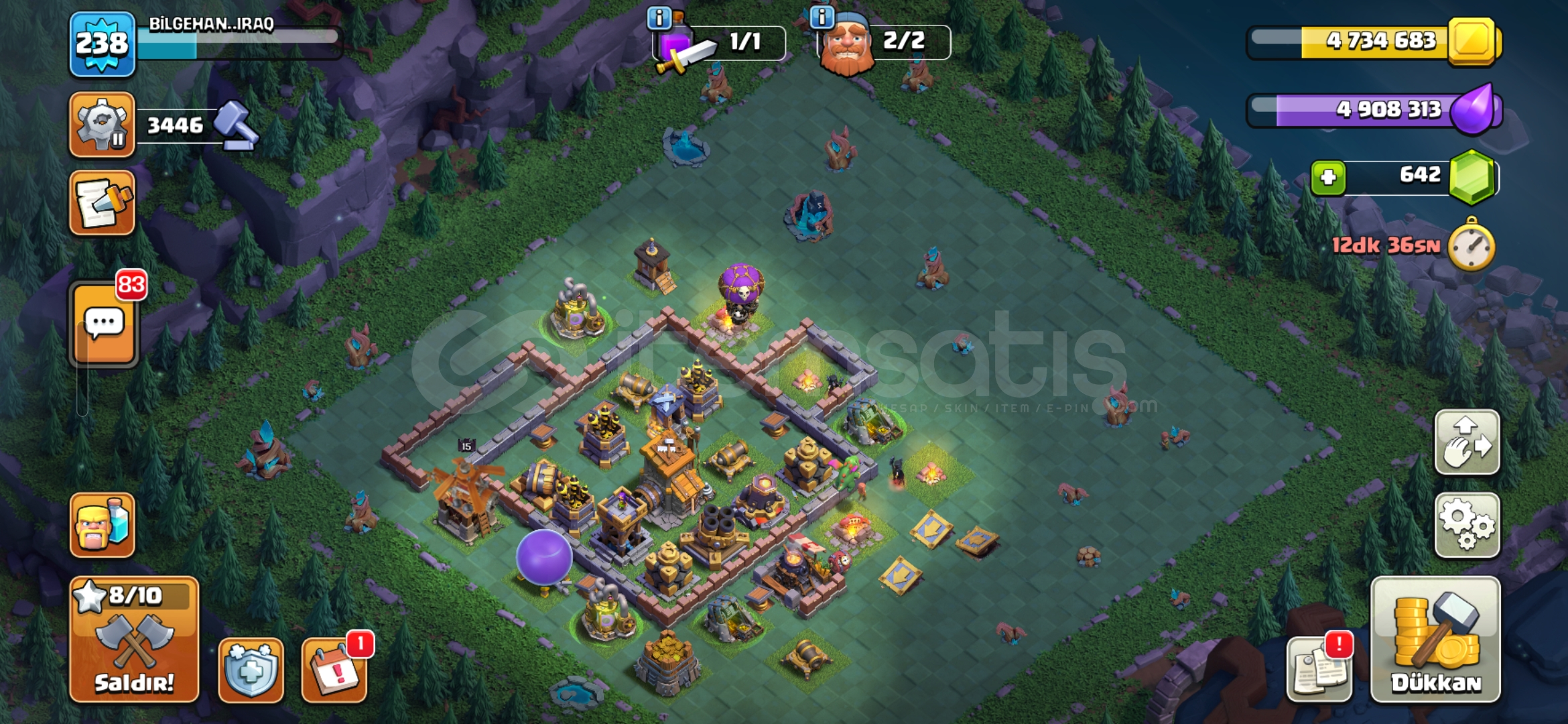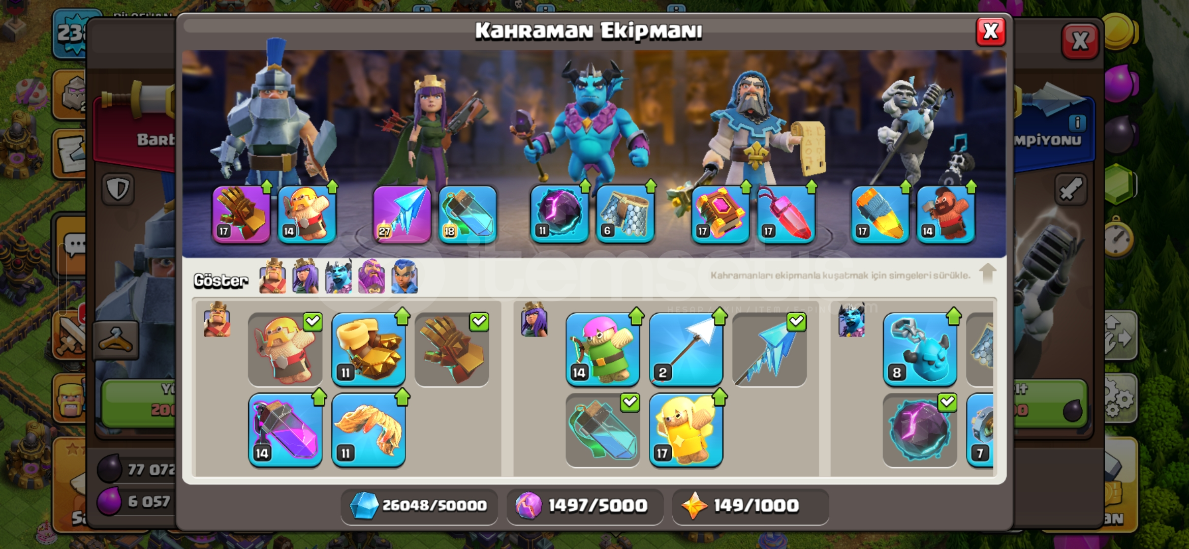 Pazarlığa açığım fiyat konusunda konuşabiliriz.Tuzaklar ve duvarlar dışında savunmaların %90 nı max seviyede hesaptaki mevcut olan kitaplar rünler fotoğraf ile gösterdim kahraman kostümleride aynı şekilde fotoğraflarda var kahramanlarda kral ve kraliçenin 1500 taş değerinde olan iki yeteneği mevcut fotoğrafta inceleyebilirsiniz inşaatçı tarafında da &c...
