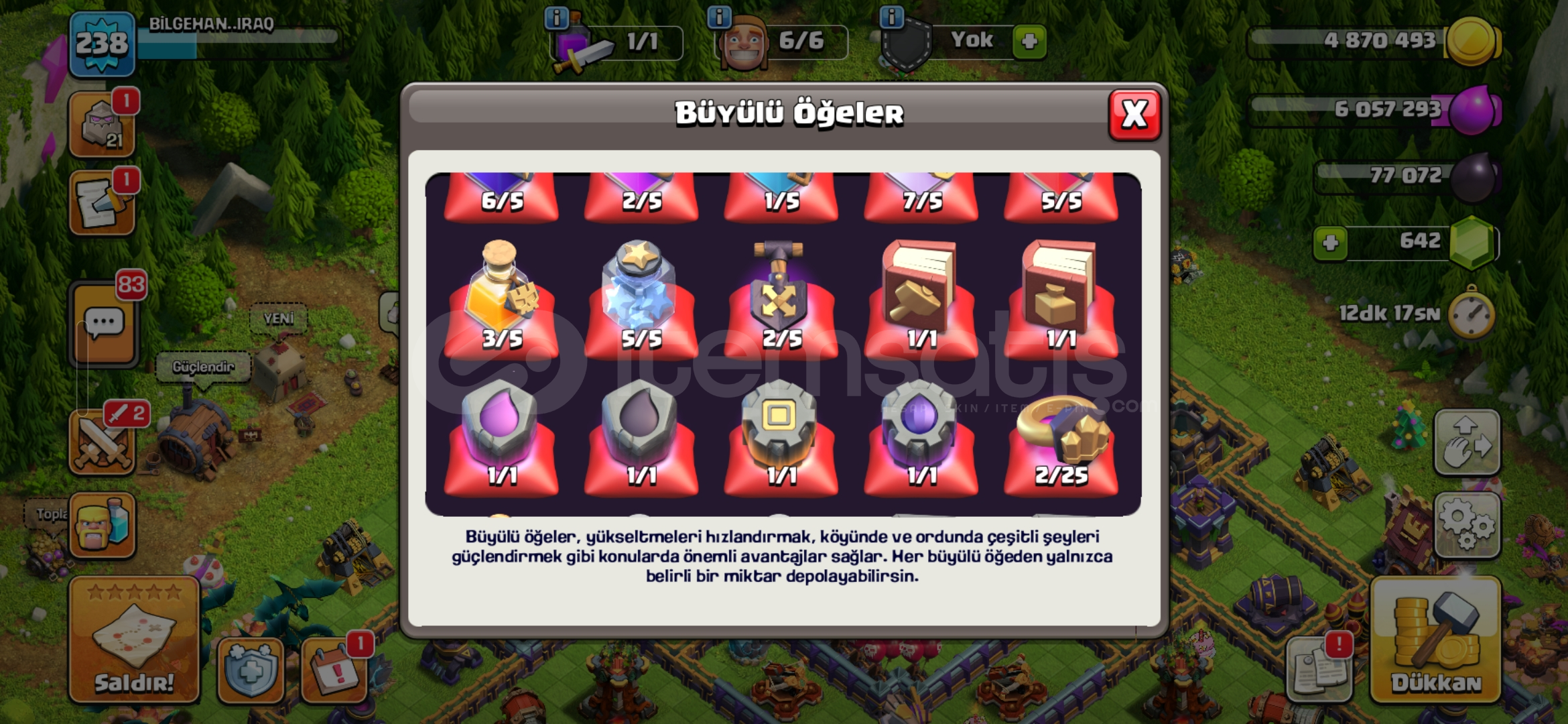 Tuzaklar ve duvarlar dışında savunmaların %90 nı max seviyede hesaptaki mevcut olan kitaplar rünler fotoğraf ile gösterdim kahraman kostümleride aynı şekilde fotoğraflarda var kahramanlarda kral ve kraliçenin 1500 taş değerinde olan iki yeteneği mevcut fotoğrafta inceleyebilirsiniz inşaatçı tarafında da çoğu savunmanın max olmasına yanlıca 1 seviye var orasıda maxa yakın bir hesabım var alıcak olan kişiye iyi eğlenceler dilerim.