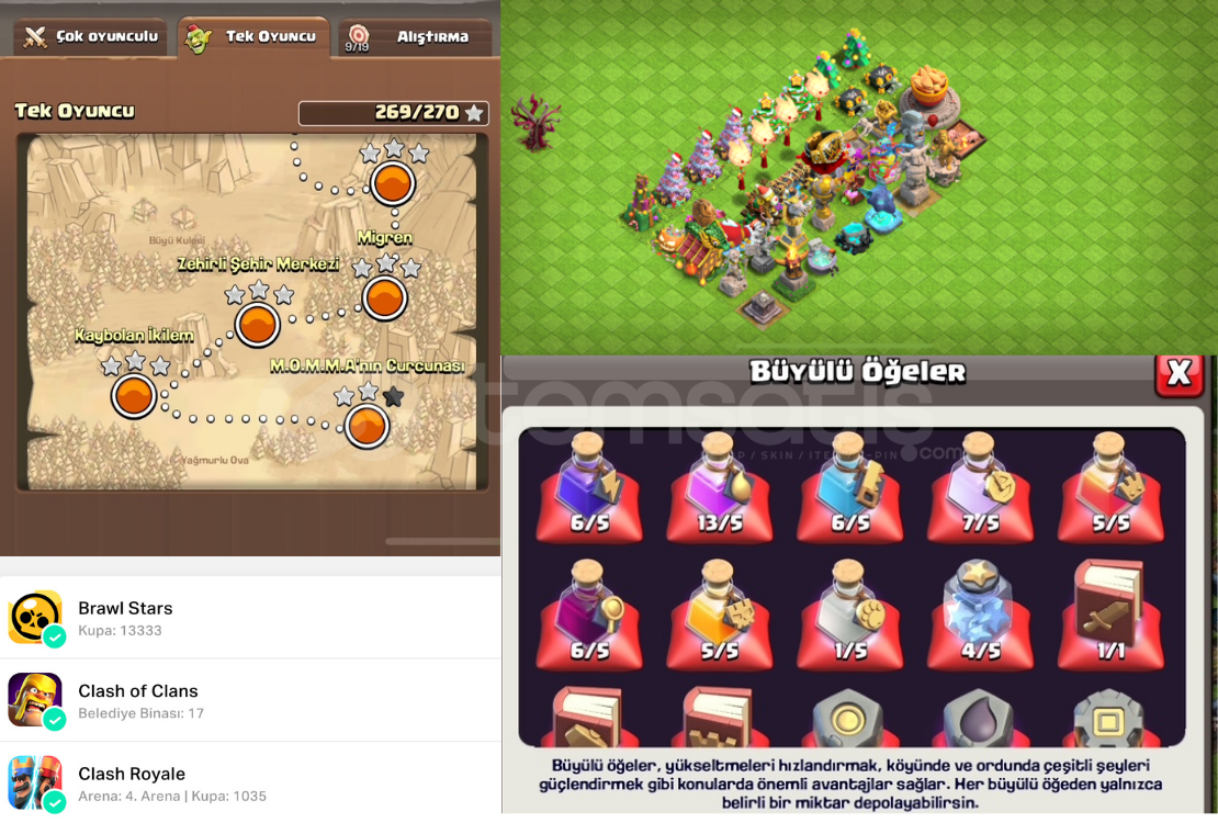 +1500 Taş mevcuttur Tek oyunculu haritası bitmiştir 5 tane destansı ekipman bulunmaktadır 2 tane barbar 1 tane kraliçe kostümü bulunmaktadekarasyonlara önem verilmiştirBS de 13000 kupaCR de 1000 kupa hesap sizin mailinize geçirilecektir