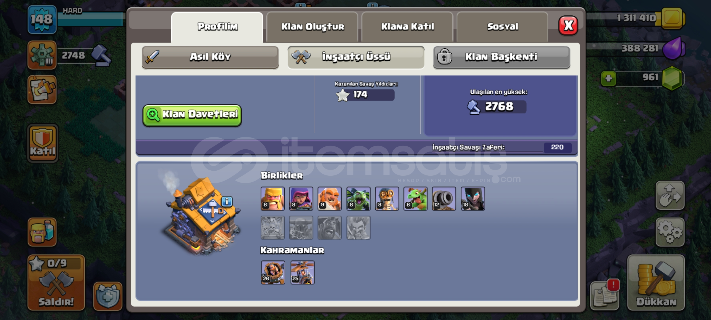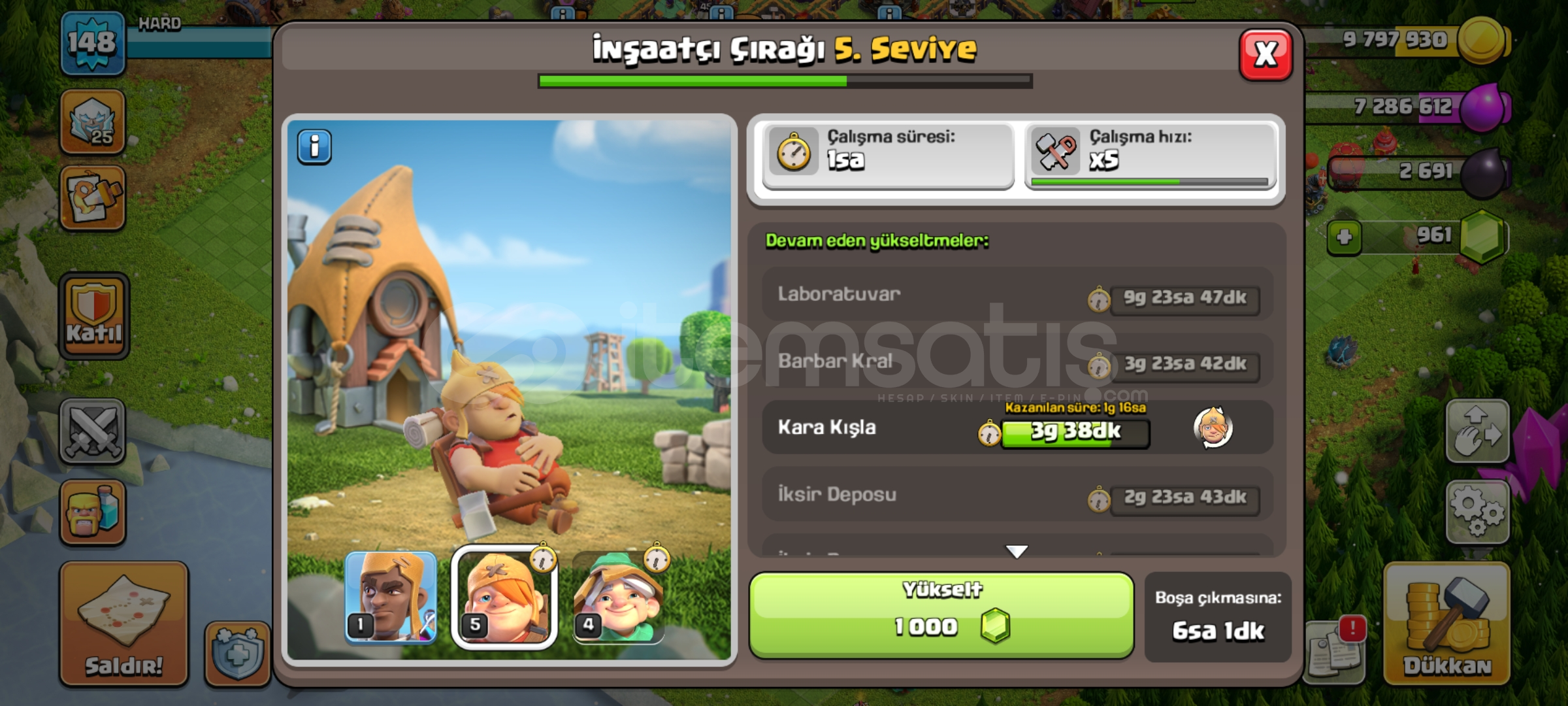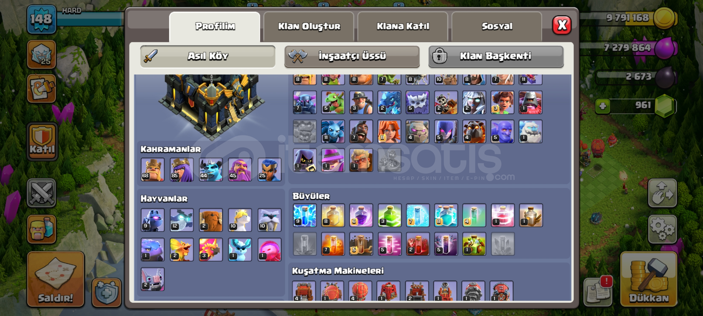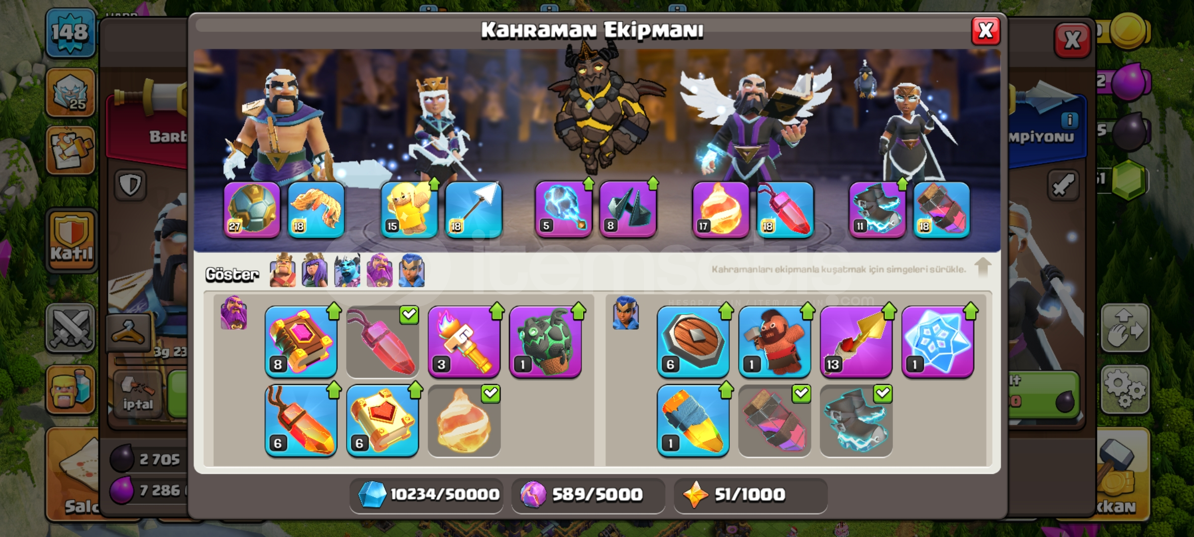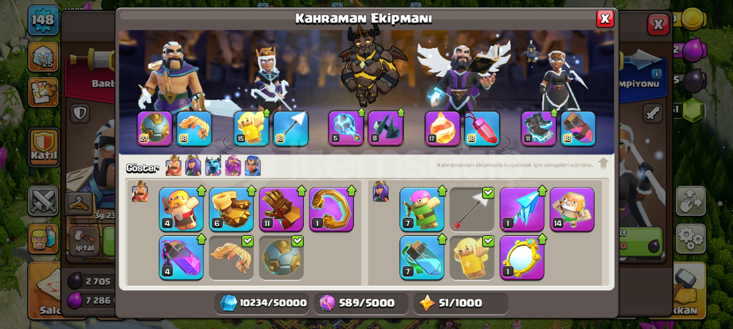 piksel kral efsanevi* , büyülü kral efsanevi* ,büyülü okçu efsanevi* ,ilkel kraliçe altın* ,lav prensi altın* , büyülü koruyucu efsanevi* ,büyülü şampiyon efsanevi* , clash rama şampiyonu altın* kostümleri var6. inşaatçı açıktır hesapta ,961 taş vardır*Tüm ekipmanla...