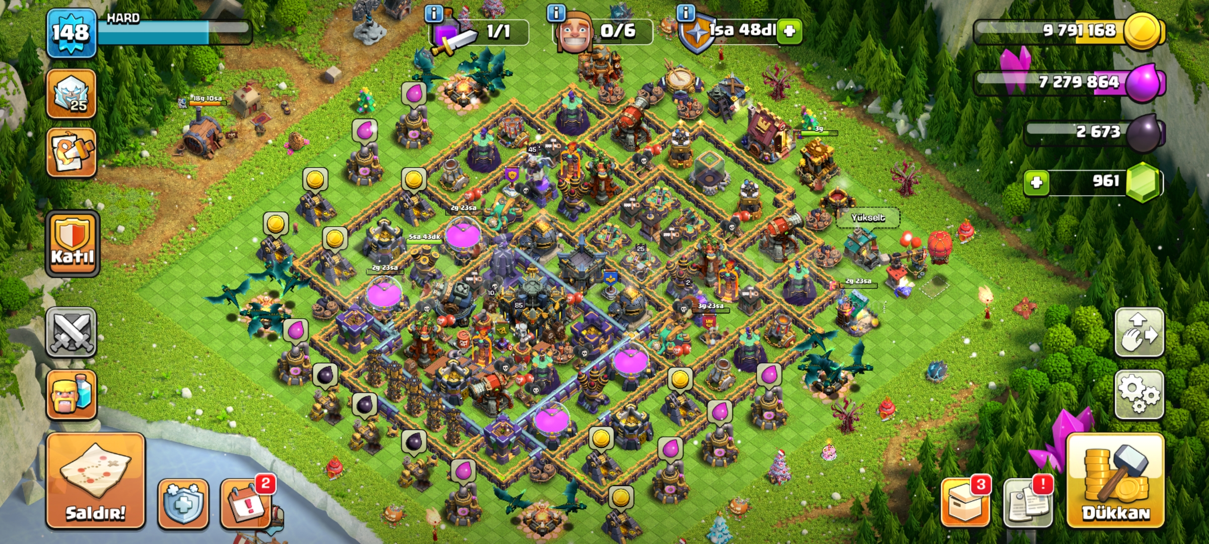 2x iksir deposu 15e , hava savunması 14e , barbar kral 69a , kara kışla 12ye , laboratuvar 15e , elektro ejder 3e , anka kuşu 4e , savaş makinesi 27ye ,