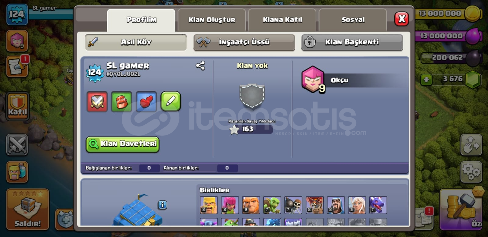 💎 Detaylar:• Seviye 124 Hesap• 3676 Elmas Kullanıma Hazır 💎• 5 İnşaatçı Açılmış 🏗️• Otomatik Teslimat 🚀• Mail + Şifre Verilir 🔑