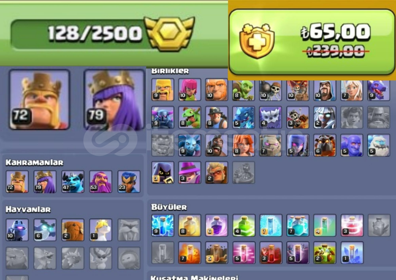 159 LEVEL , 3350 TAŞ.ÇIRAKLAR 7 SEVİYE , 5 KOSTÜM , EKİPMANLAR SAĞLAM.ALTIN BİLET İNDİRİMLİ , 128 MADALYA , KAHRAMANLAR NERDEYSE MAX.2 ÇEKİÇ VE KİTAP VARDIR.HESAPLAR 100/100 GÜVENCE İLE TESLİM EDİLİR BİR SORUNUZ OLURSA SORMAKTAN ÇEKİNMEYİN.