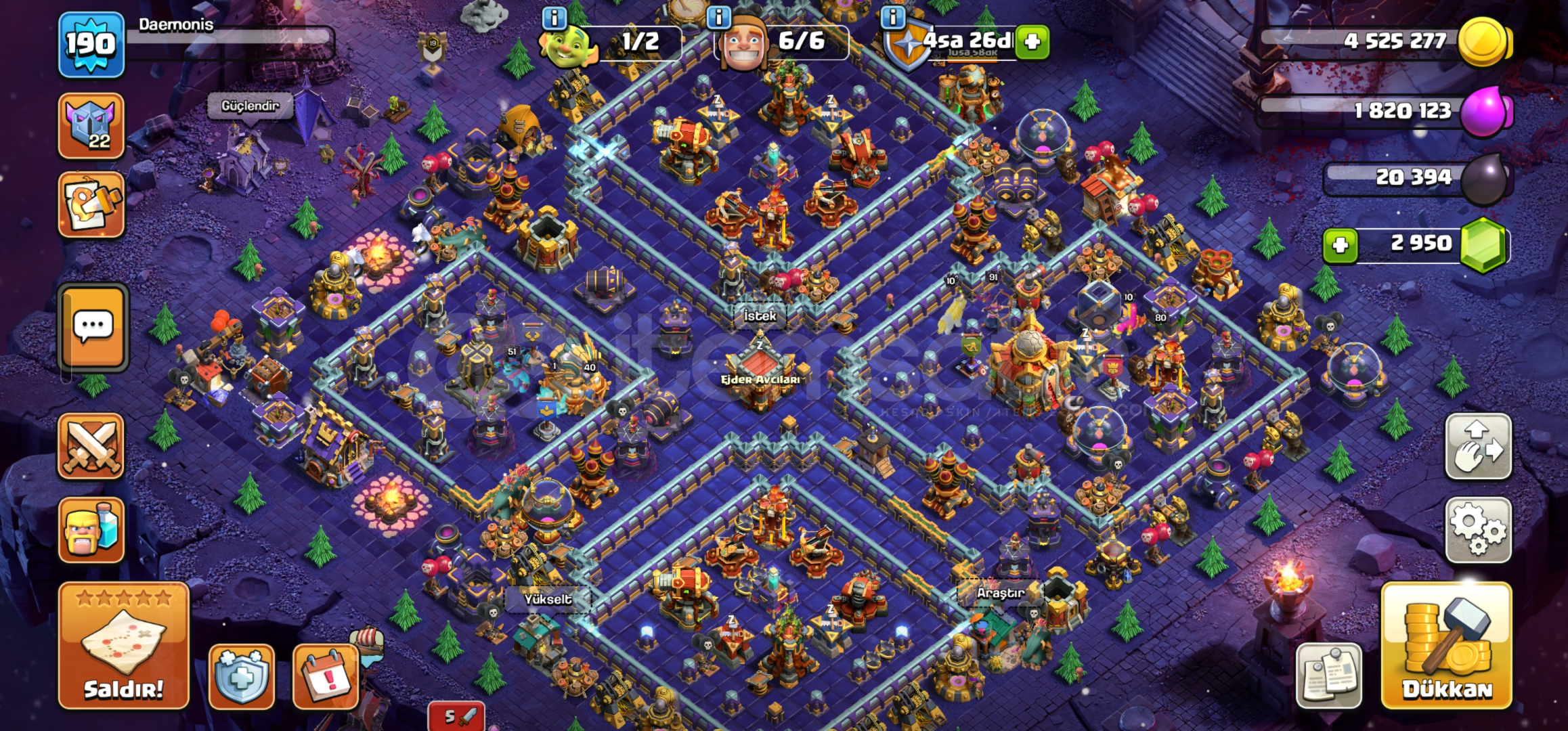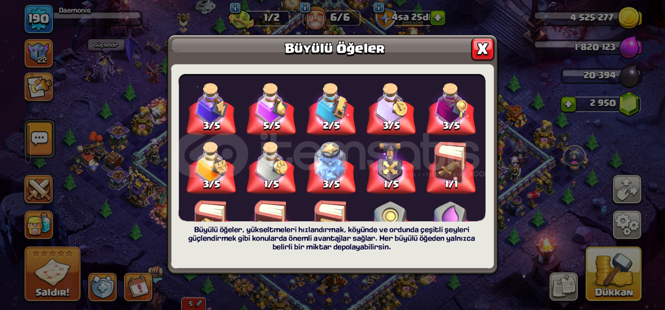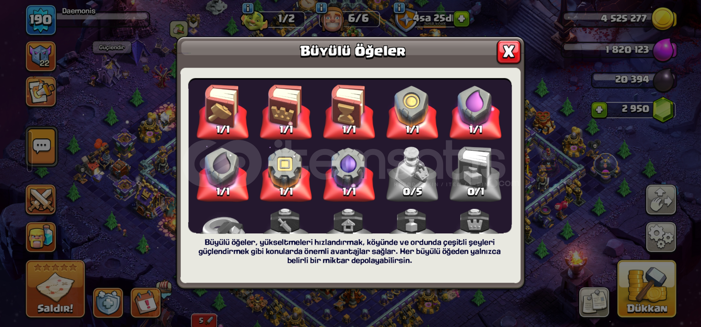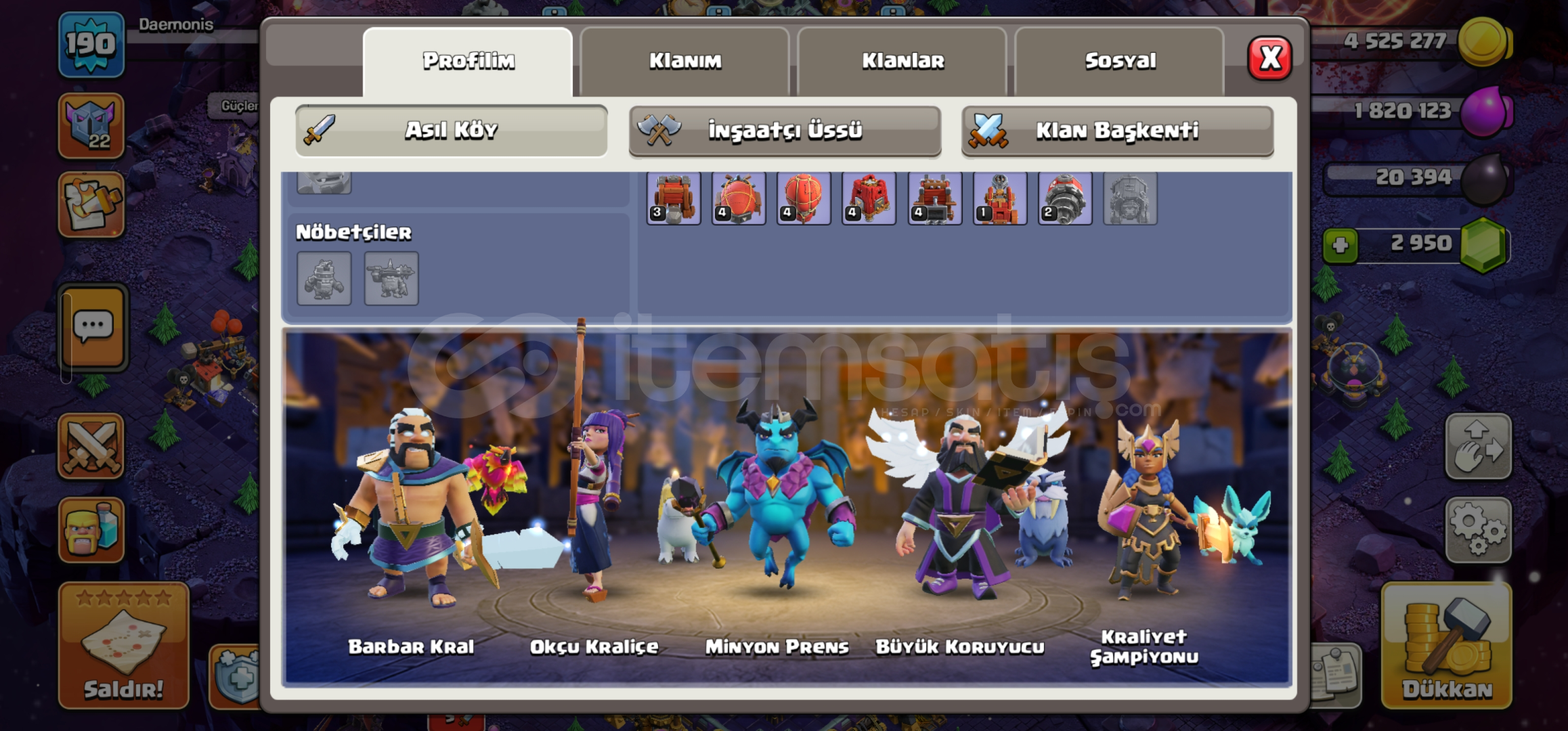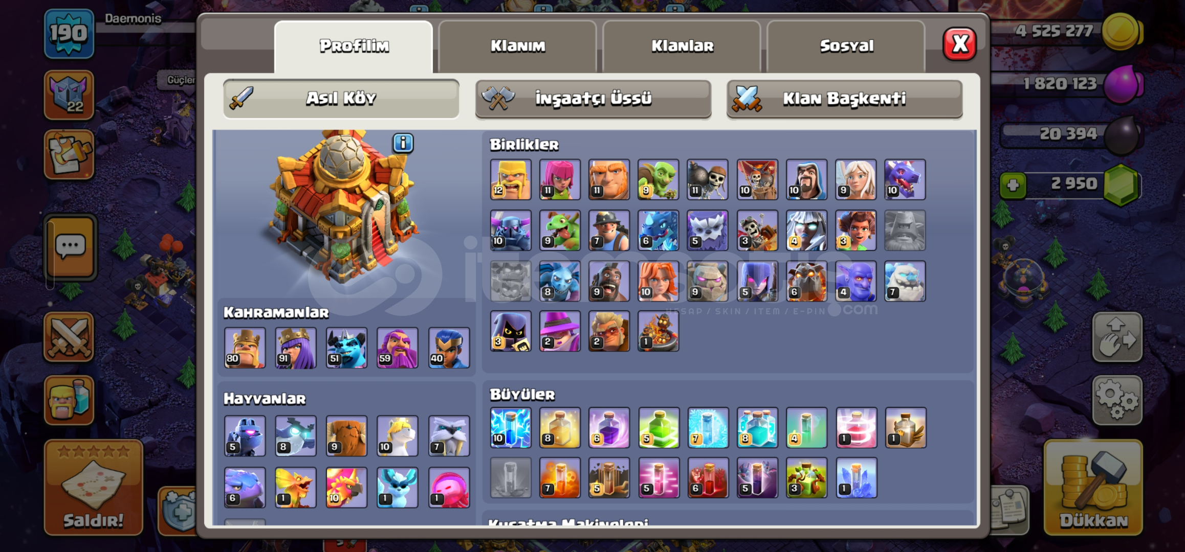 HESAP VERECEĞİNİZ MAİL E DEVİR YAPILACAKTIR.•Hesap maxa yakındır. Dolu dolu ve isim değiştirme hakkı da 500 elmastır.•Duvarlar mükemmel durumdadır.•Ekipman durumu görseldeki gibi emsallerine göre çok daha iyidir.•Başka merak ettiğiniz birşey olursa 0543.202.5639 w.p den ulaşabilirsiniz.