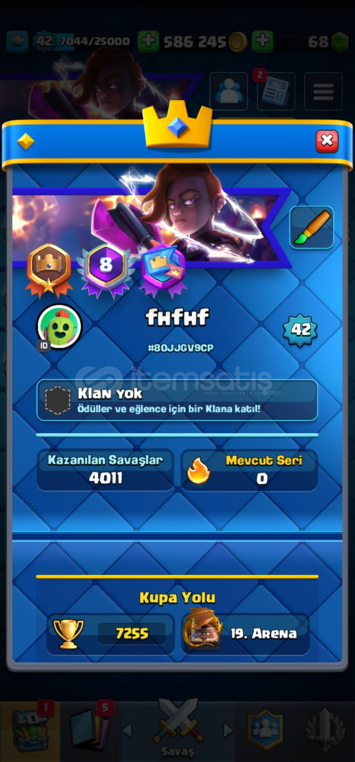 ​Diğer Notlar: Güçlü kart koleksiyonu ve yüksek seviyeli desteler ile rahatlıkla zirveye oynayabilirsiniz. Hesap adı (fhfhf) ve etiket (#80JJGV9CP) ekran görüntüsünde mevcuttur.