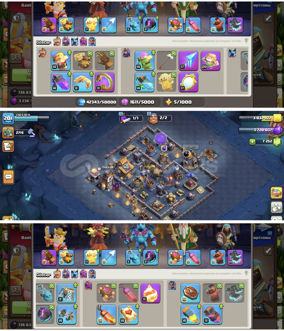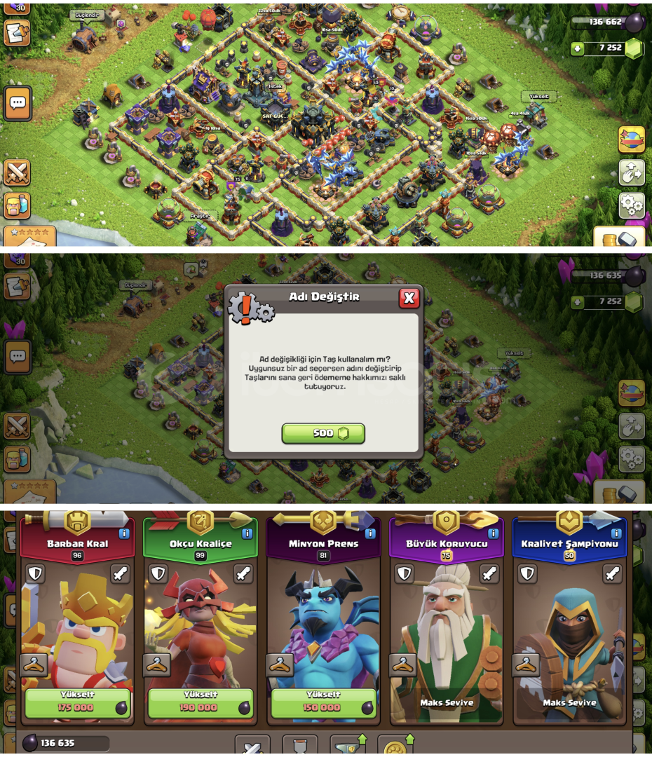 Belediye 17 MÜKEMMEL FIRSAT HESABI7.2 K TAŞİSİM DEĞİŞMELİMÜKEMMEL ÖTESİ DEMİRCİSİBİRBİRİNDEN FARKLI DESTANLI KOSTÜMLERBARBAR KRAL 5 KOSTÜMOKÇU KRALİÇE 2 KOSTÜMKRALİYET ŞAMPİYONU 2 KOSTÜMBÜYÜK KORUYUCU 1 KOSTÜMKÖYÜN DUVARLARI SAVUNMA VB GAYET İYİBÜYÜK KORUYUCU MAX KRALİYET ŞAMPİYONU MAXOKÇU KRA...