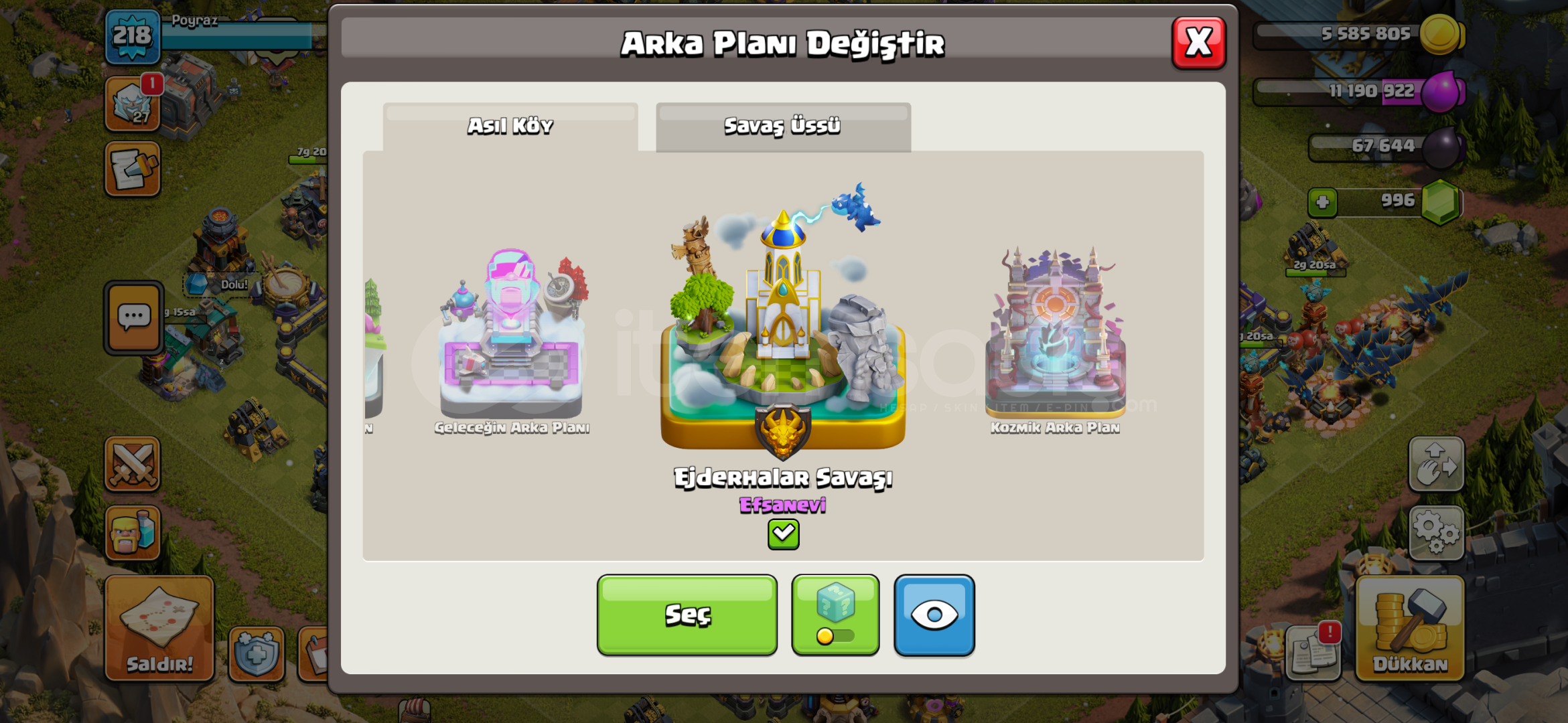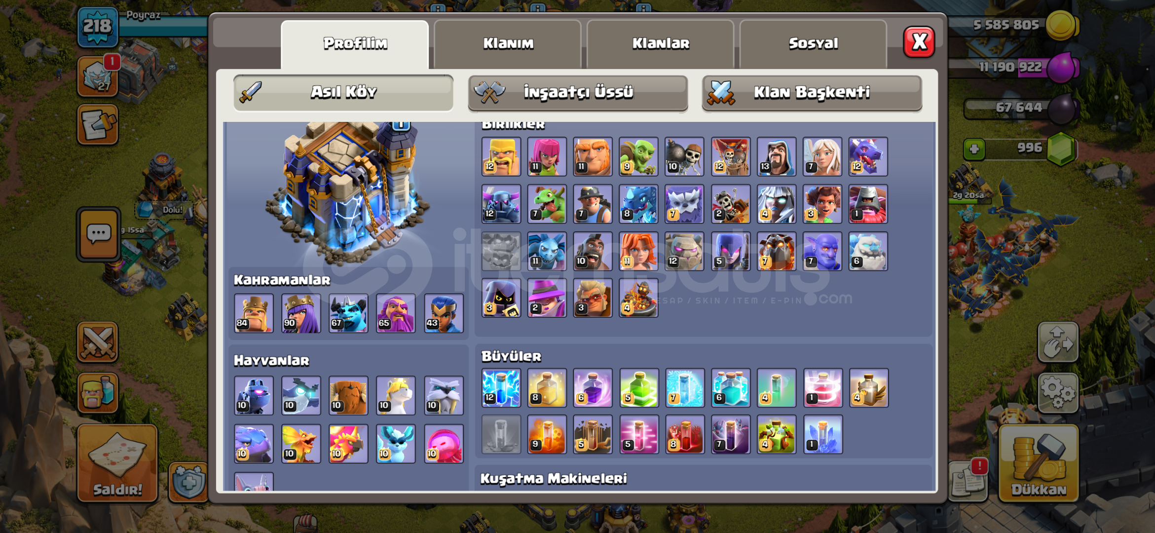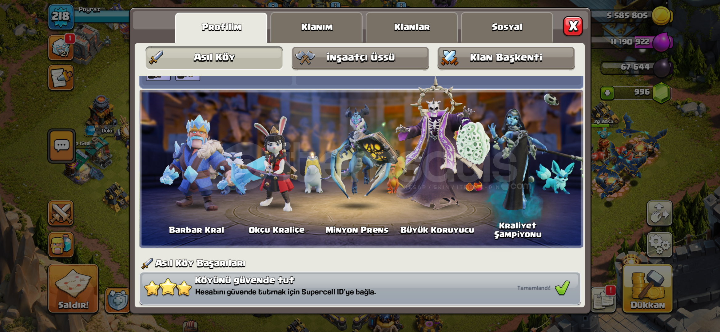 Hesap Belediye Binası 18 olup Belediye Binası 18’e geçilmiş; laboratuvar, klan kalesi ve benzeri bazı yapılar fulllenmiştir.Hesapta şu arka planlar bulunmaktadır:• Ejderha Arka Planı• Geleceğin Arka Planı• Kozmik Arka Plan