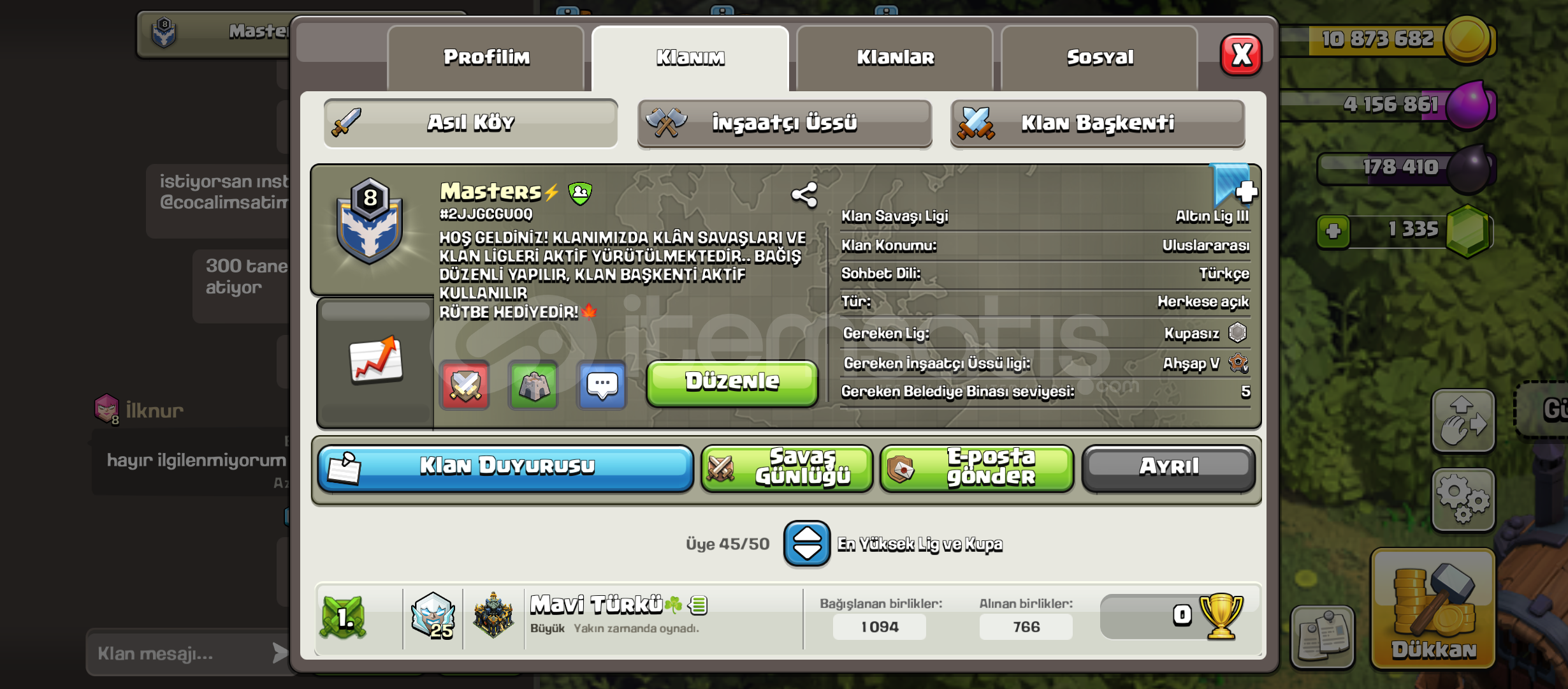 KLAN 8. SEVİYEDİR, KLAN BAŞKENTİ 5. SEVİYE VE MAX DURUMUNDADIR BARBAR KAMPI FULLENMEYE YAKINDIR AKTİF KLAN VE LİG,KS OYUNCULAR TARAFINDAN HEP YAPILIR HEMEN TESLİM EDİLİR