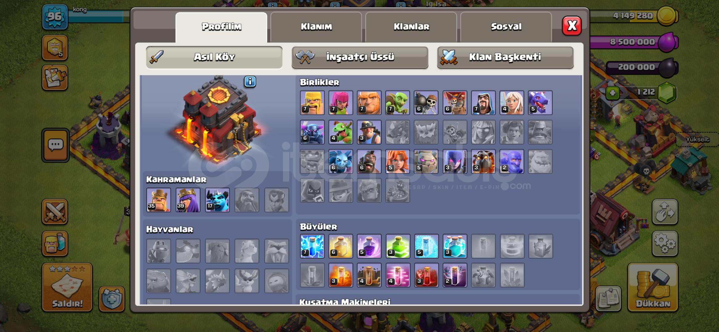 clas of clas hesabını alana digerleri hediyedir🏰 Clash of Clans Profili (TH 10)Belediye Binası: TH10Kahramanlar: Barbar Kral: 35Okçu Kraliçe: 39Büyük Koruyucu: 17Askerler: TH10 seviyesine göre güçlü geliştirilmişBüyüler: Çoğu seviye yüksek, saldırıya hazır düzenKlan Başkenti & İnşaatçı Üssü: Düzenli oynanmış temiz ...