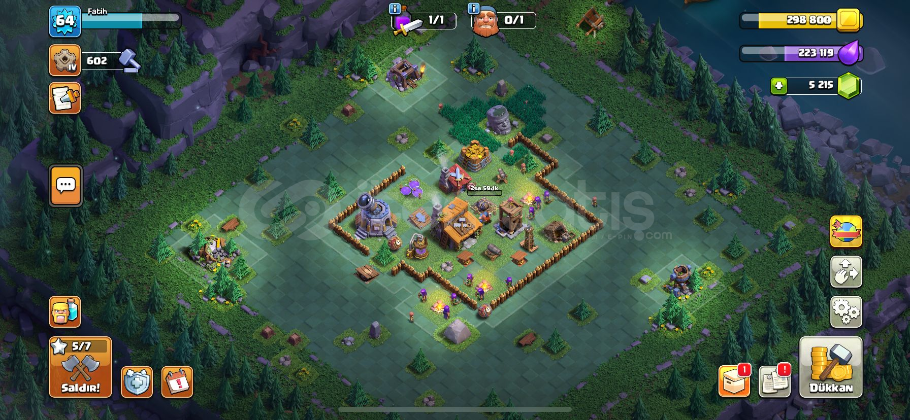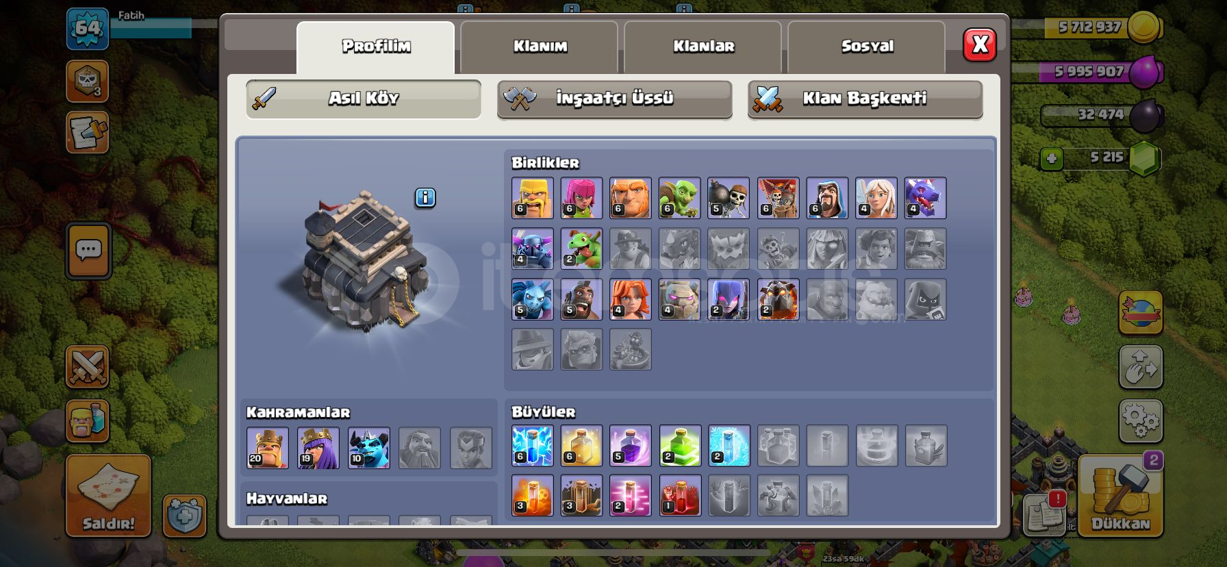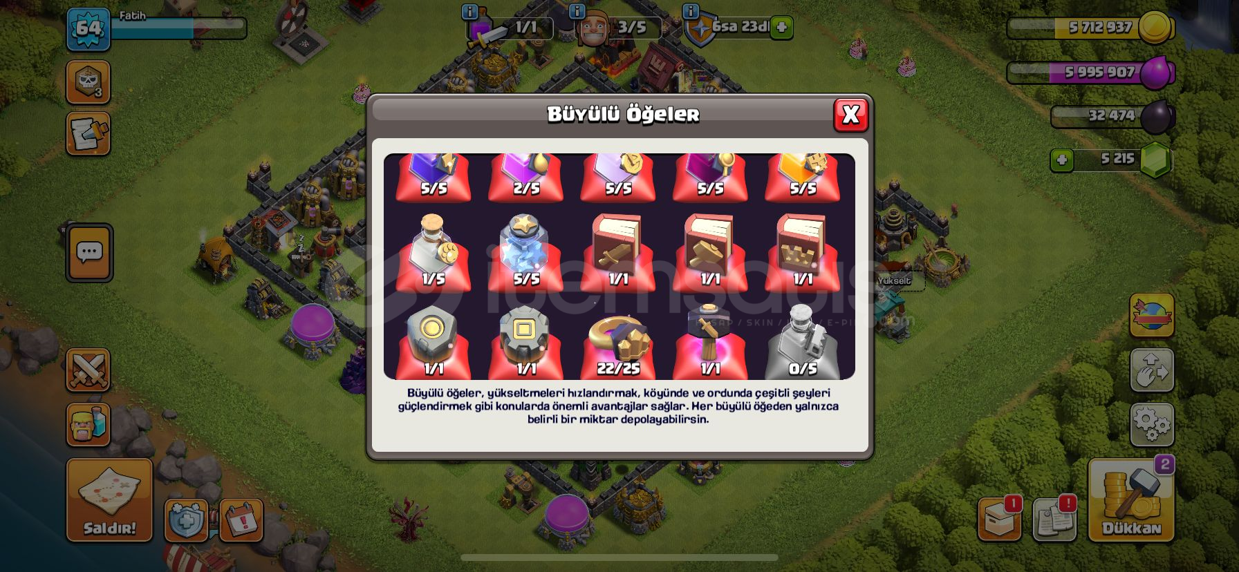 Clash Of Clans BB9 full hesap:64 level!5200 taş!3273 baskın madalyası!132 lig madalyası!Duvarlar 9. seviye!Dolgun Büyülü Öğeler ve daha fazlası!Pazarlık yapılabilir!!!Not: Hafta içi 17:00 - 24:00 saatleri arasında aktifim!