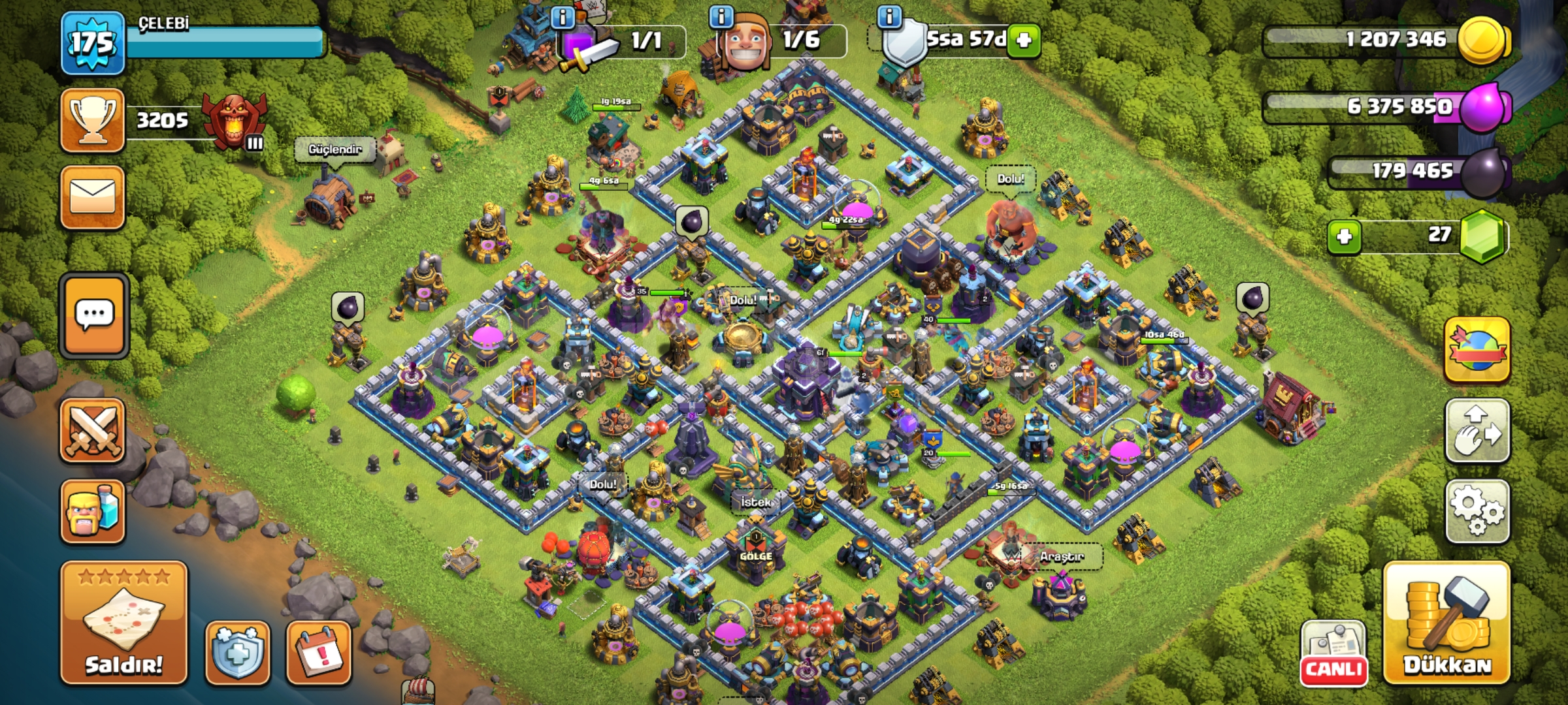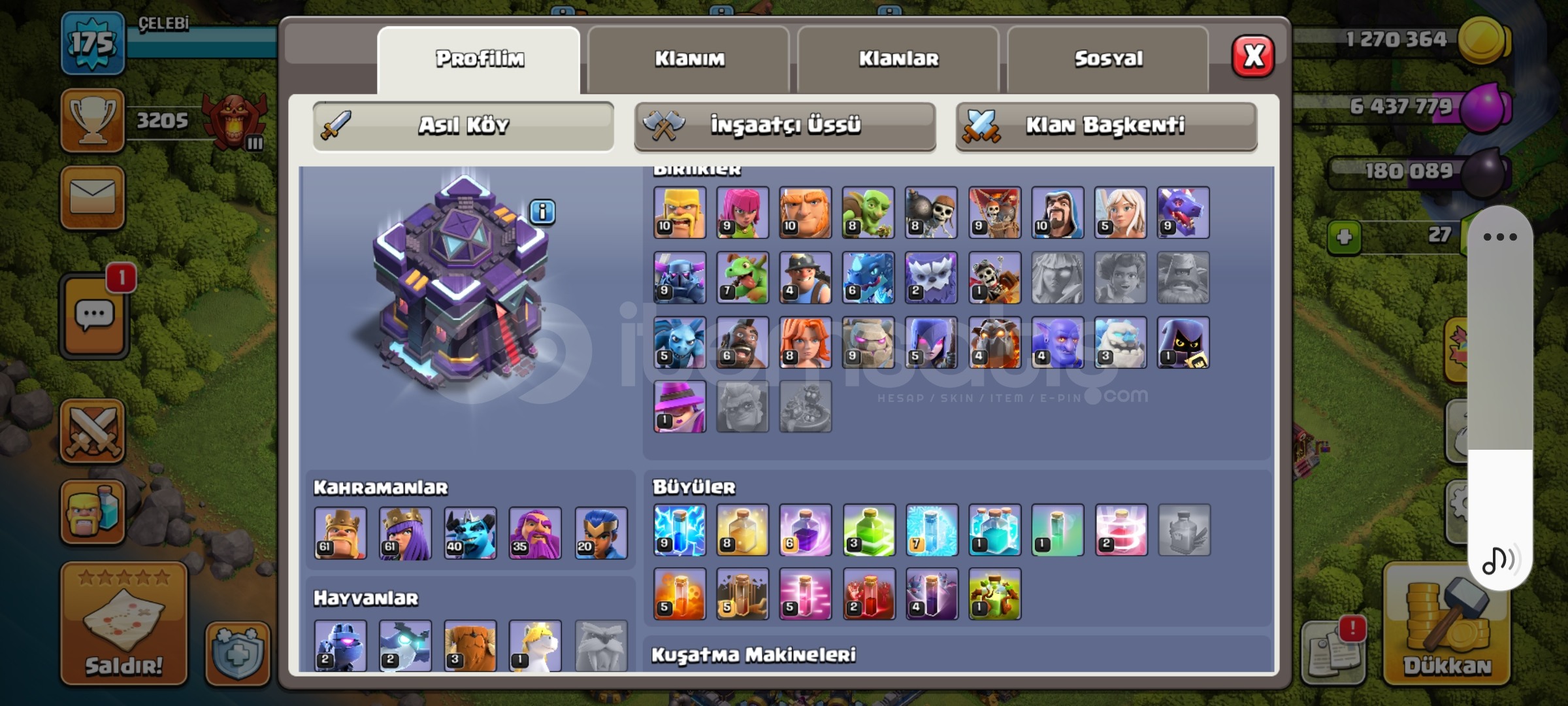 Köy Binası 15 seviye, aktif ve düzenli oynanmış bir hesap. Tertemiz, hiçbir ban/ceza durumu yok. Satış sebebi: vakitsizlik.Detaylar:Seviye: 175Kupa: 3205 (Usta III)6 işçi açıkKahramanlar:Barbar Kral 61Okçu Kraliçe 80Büyük Koruyucu 55Kraliyet Şampiyonu 35Hayvanlar açık (2-3 seviye arası)Birliklerin çoğu max ya da maxa yakınBüyüler, kuşatma makineleri akti...