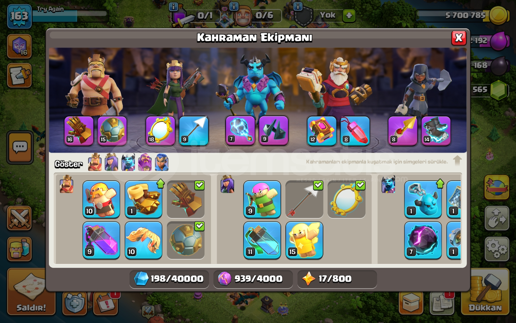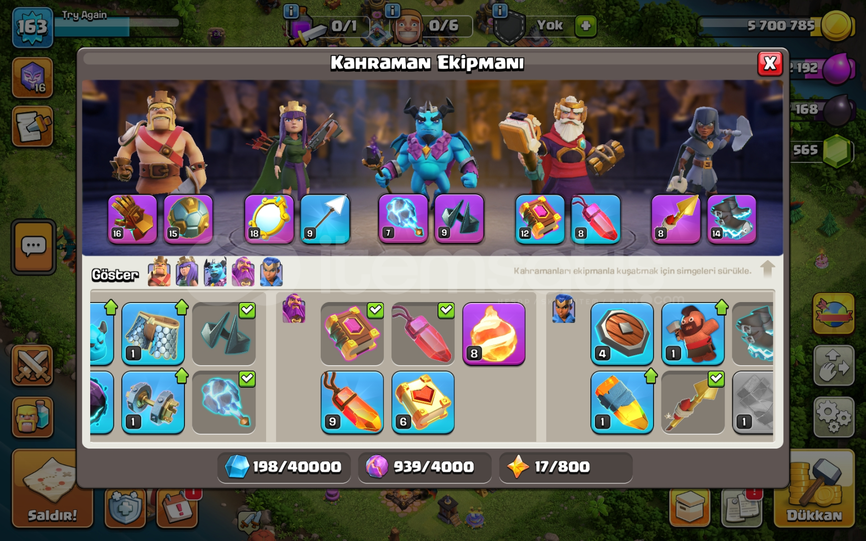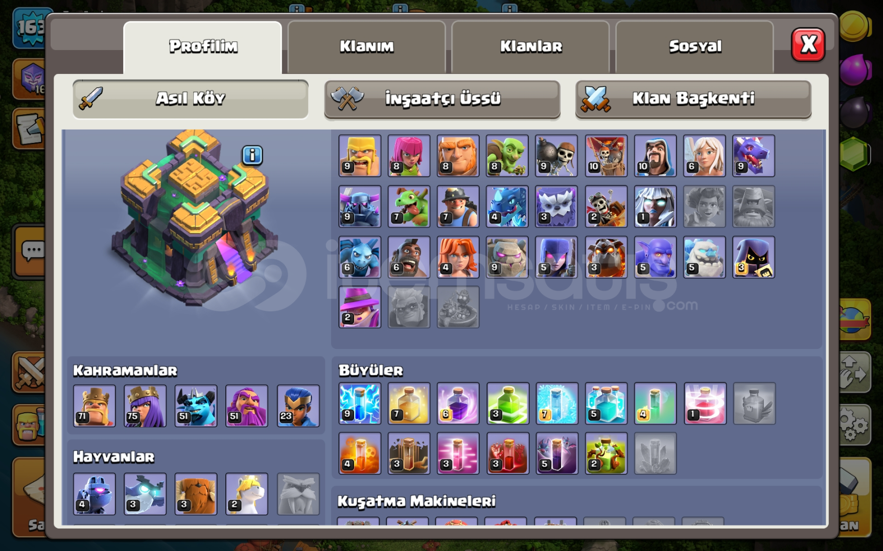 Detaylar;Belediye Binası 14Yarı MaxEkipmanlar Neredeyse Hepsi VarKahramanlar Fulle YakınBir Kaç Tane Kostüm Mevcut6. İnşaatçı VarYan Köy İyi Seviyede Ve 8K Kupalı Clash Royale Hesabıda VardırTeslimat;Vereceğiniz Maile BağlanacaktırKoruma Aktif Değildir Hesaptan Çıkış Videosu İsteyene Atılır