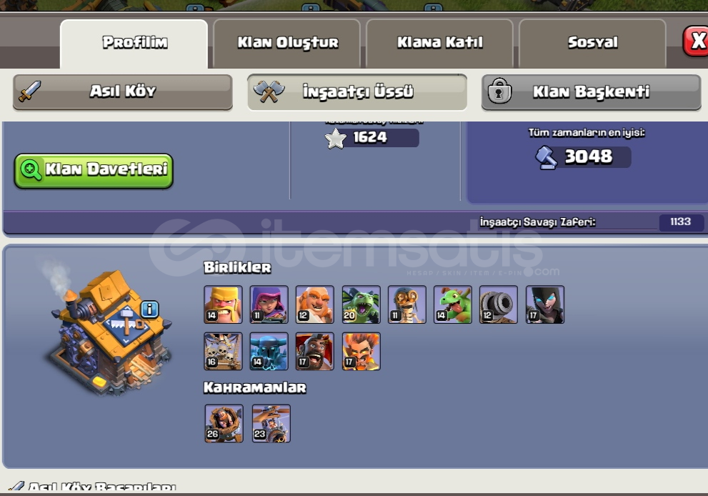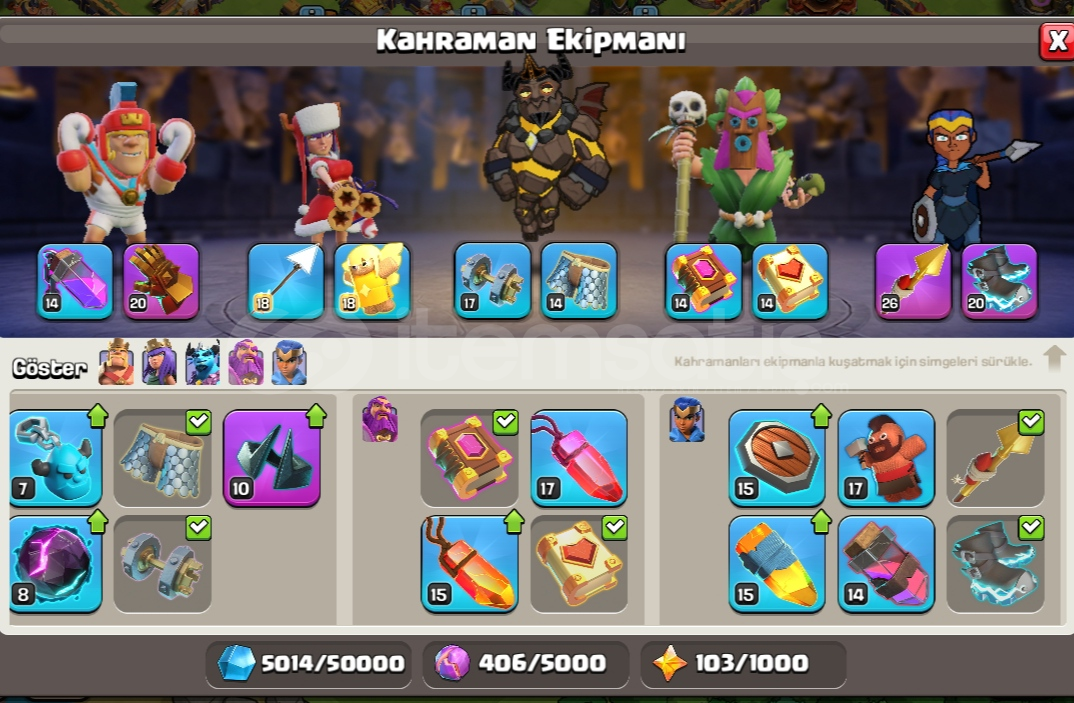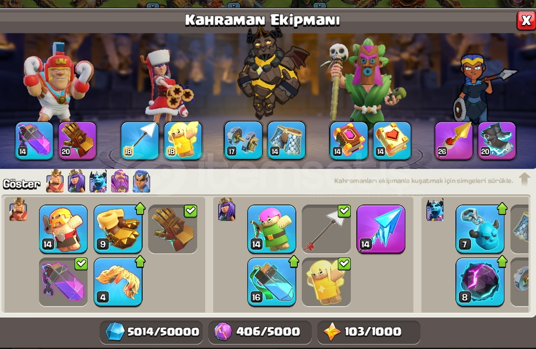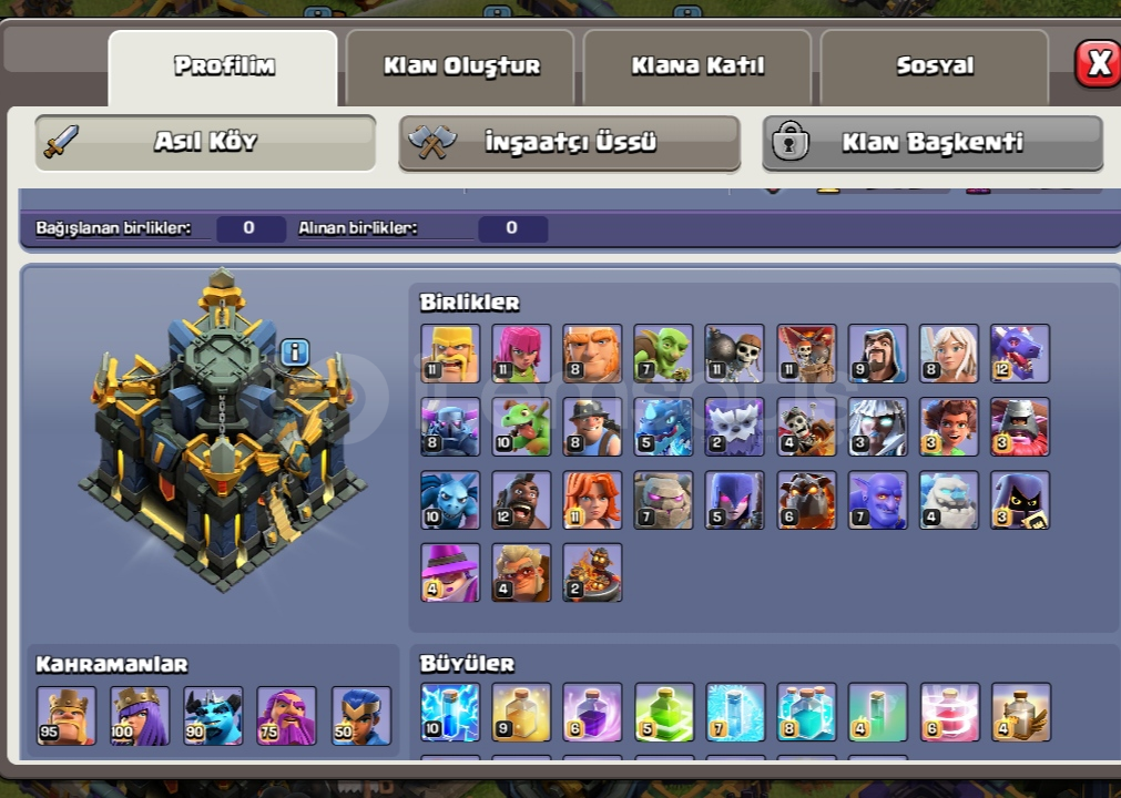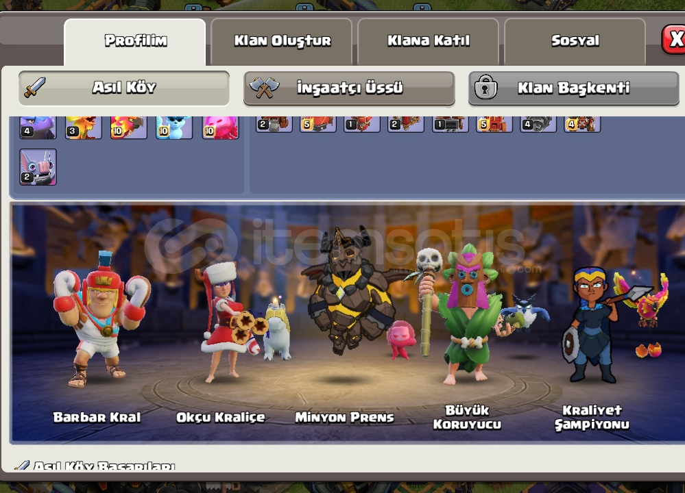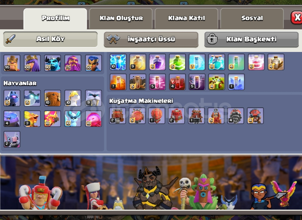 - Kraliyet Şampiyou/Kraliçe/Koruyucu/Minyon Prens Full- 2113 taş- Ağır savunmalar full- Yeni gelen lig guncellemesiyle 31. Ligde- 6 İnşaatçı• Sormak istediğiniz ekstra sorular olursa yine mesaj kısmından iletebilirsiniz