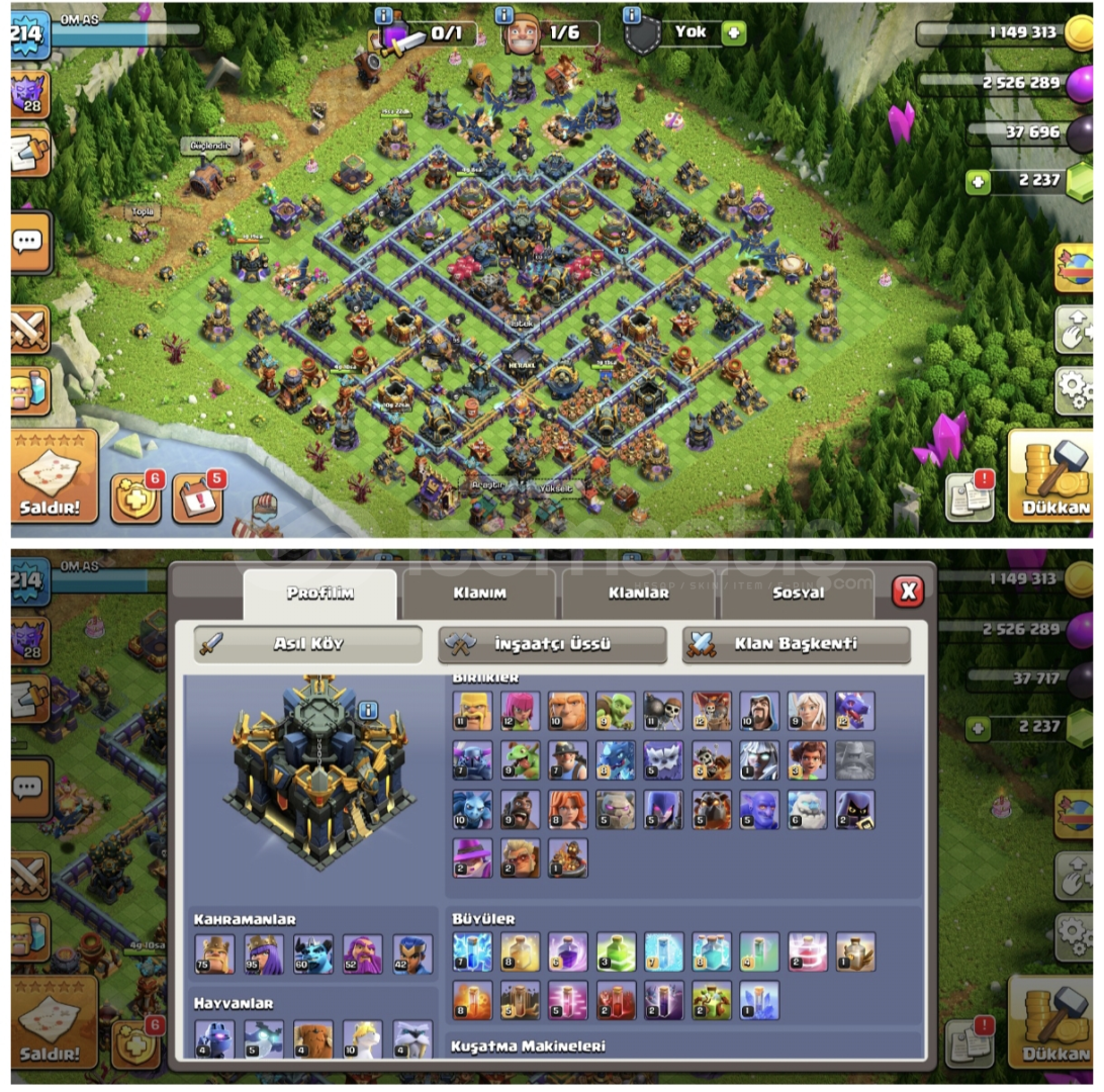Coc hesabı 214 lvl BB17 Max a yakınKral 75 svKraliçe 95Koruyucu 52Şampiyon 43490 lig madalyasi varEkipmanların çoğu maks 6 tane efsanevi varToplam 6 kostüm varBs hesabı cadı shely baykuş shely ve Noel Baba Mike var CR hesabı bilgi için yazın 3 oyun hesabı aynı maile bağlı o yüzden birlikte satıyorum