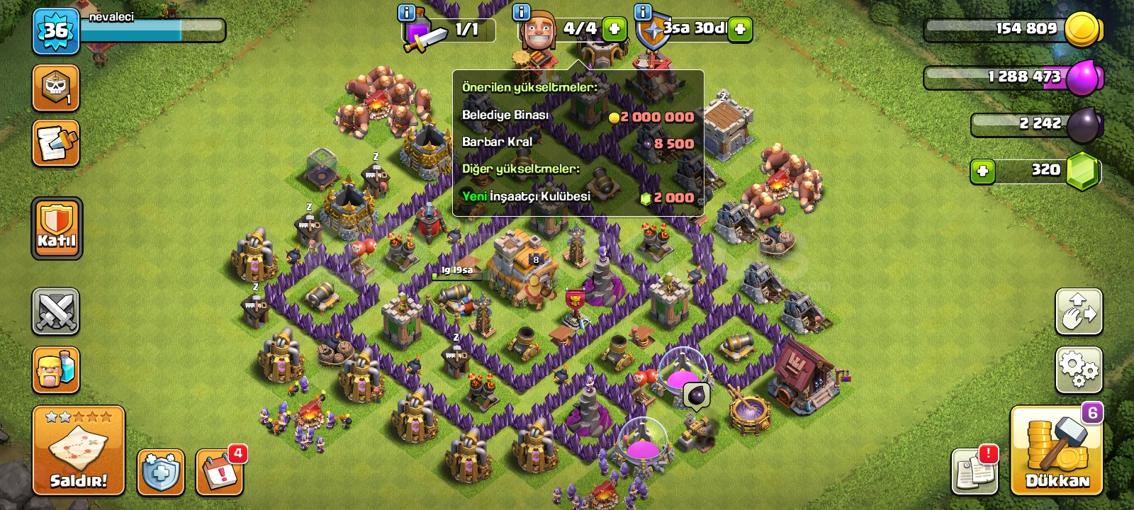 Hesap 7Sv bb sahiptir hesapta aktif olarak top çift topa yukseltilmektedir onun haricinde barbar kral vardır diğer şeyler fulldur 4 adet inşaatçı bulunmaktadır ücretsiz isim degisikligi mevcuttur