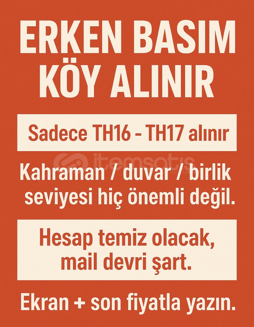 Sadece TH16 - TH17 alınır.Kahraman / duvar / birlik seviyesi hiç önemli değil.Hesap temiz olacak, mail devri şart.