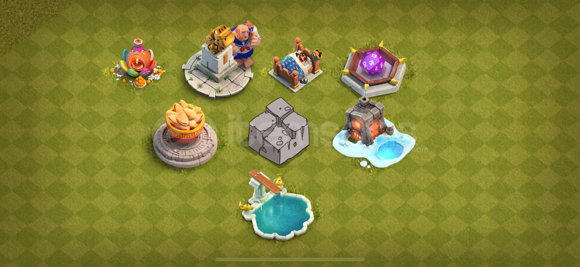 Tanesi 200 tlden satılan ve birdaha satılmayacak olan 3x3 goblin saunası ve havuzu gibi süsler supercell reward uyuyan kral özel etkinlik bileti süsleri eski ağaç ve dekorasyonlar mevcut dopdolu hesap
