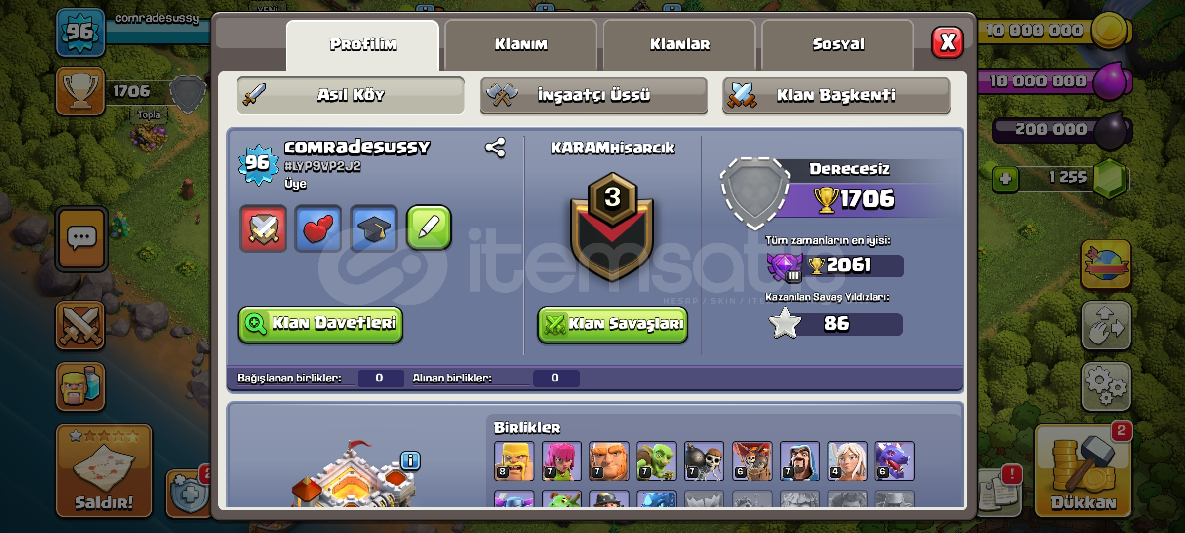 💥 Clash of Clans Hesabım Satılıktır 💥Seviye: 96Belediye binası: 10Altın: 10.000.000İksir: 10.000.000Karanlık iksir: 200.000Yeşil taş: 1255Ordu ve savunma binaları gelişmiş, duvarlar yüksek seviyedeAktif klanlı, savaş ve ganimet için uygunHesap güvenlidir, mail ile birlikte verilecektir.🎮 Oyuna vakit ayıramadığım için satıyorum.💰 Sadece sat...