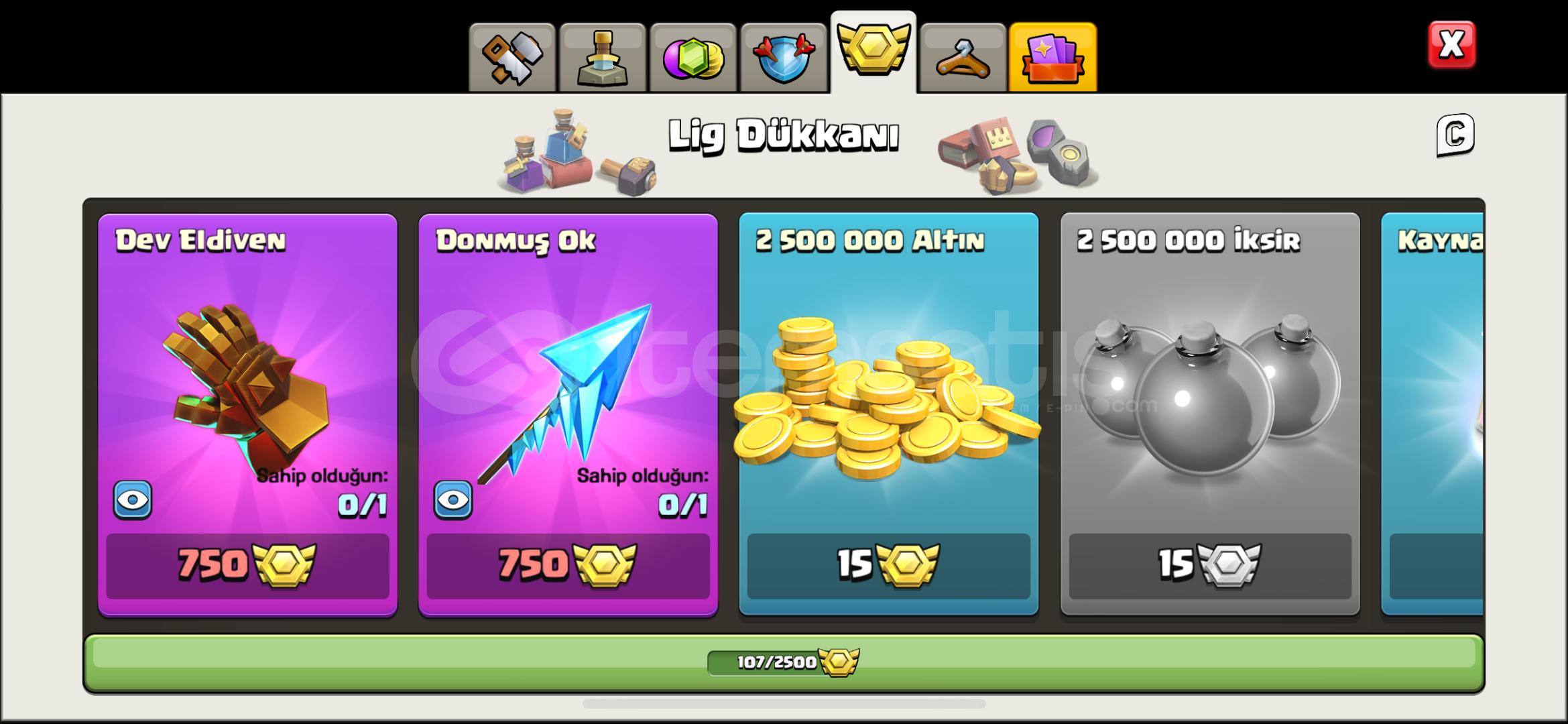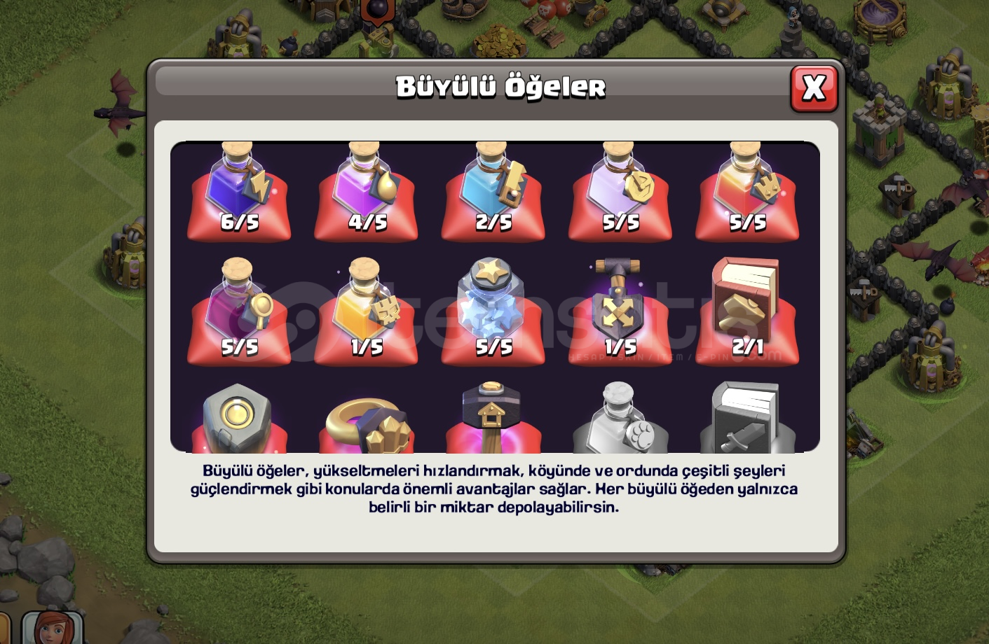 büyülü öğeler ve lig madalyası mevcuttur
