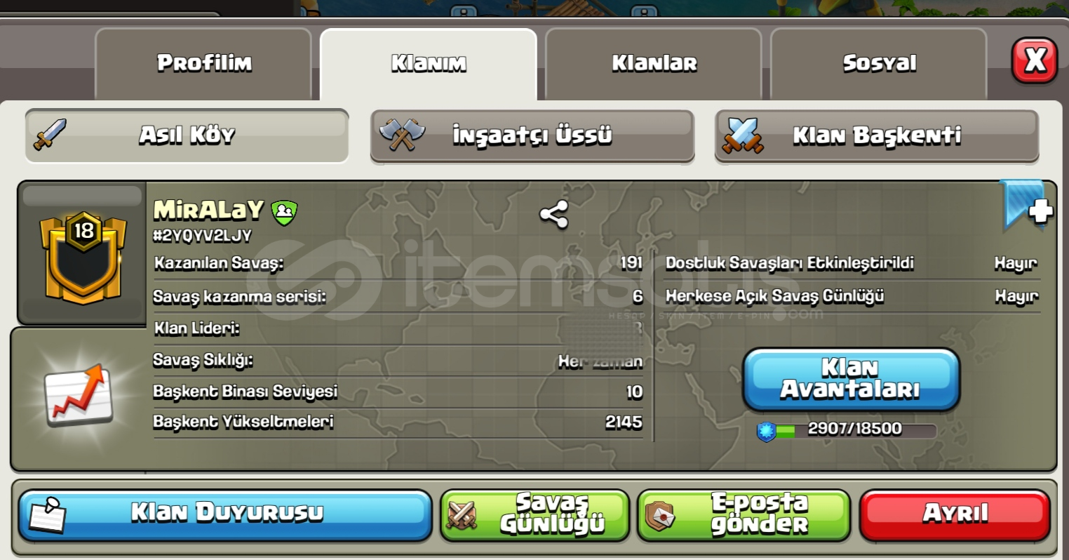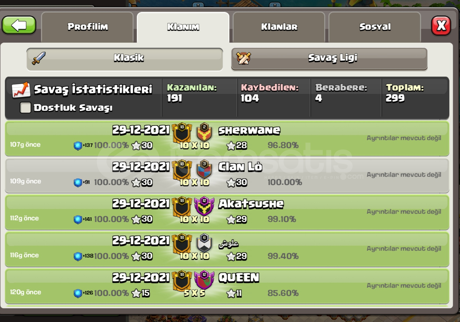 1)YAKIN ZAMANDA İSİM DEĞİŞMİŞ 18 SV MİRALAY2)BAŞKENT 10 SV VE BİRLİKLERİN ÇOĞU MAX SEVİYE3)KLANIN SAVAŞ GÜNLÜĞÜ MÜKEMMEL 191'E 104 GALİBİYET ÜSTÜNLÜĞÜ4)PAZARLIK PAYI VARDIR MESAJ ATARAK İLETİŞİME GEÇİNİZ.5)KLAN TESLİMİ SIRASINDA VİDEO KAYDI ALINMAKTADIR.6)SİPARİŞ SONRASI ONAY VERMEYİ U...
