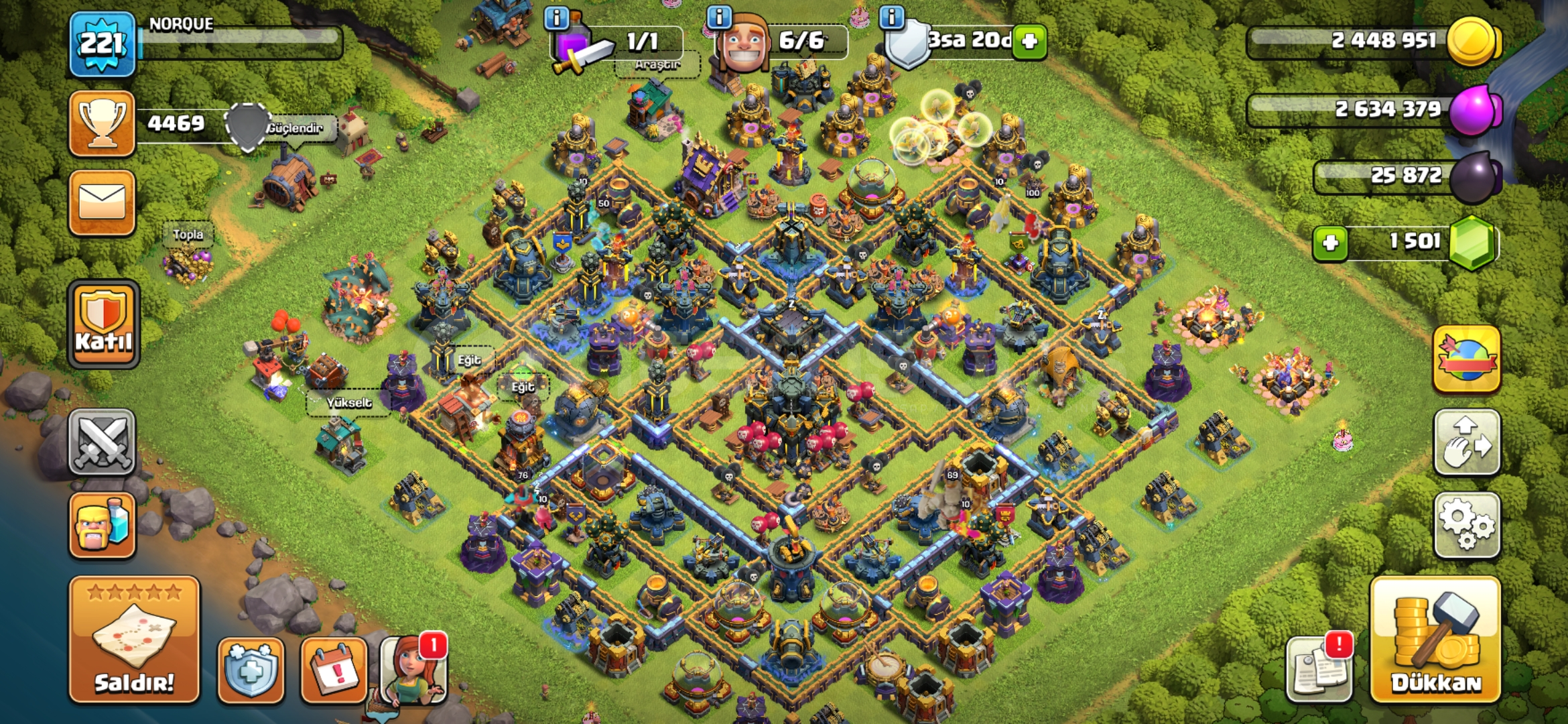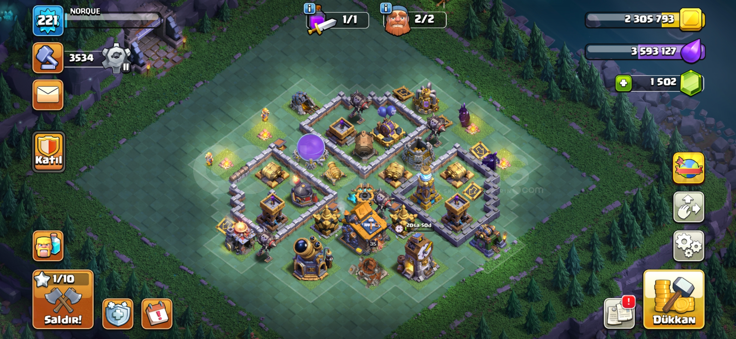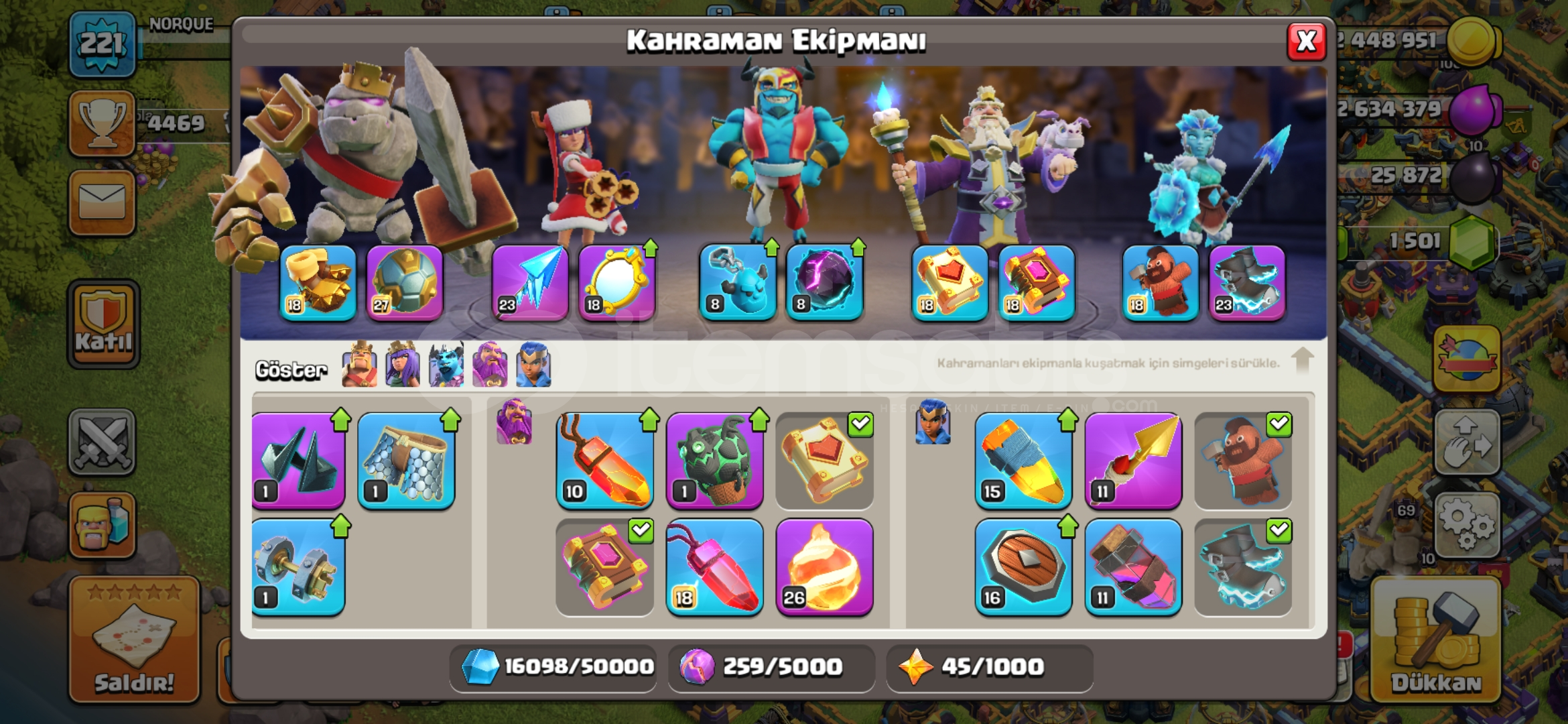 Hesapta Kraliçe, Şampiyon, Koruyucu maksimum seviyededir.1500 taş vardır.Ağır savunmaları basılmıştır.İnşaatçı köyü tamamen yükseltilmiş ve altıncı inşaatçısı bulunmaktadır.Kahramanların hepsinin kostümü, bazılarının birden fazla kostümü vardır.Kahraman ekipmanları yüksektir, özellikle alev topunun maks...