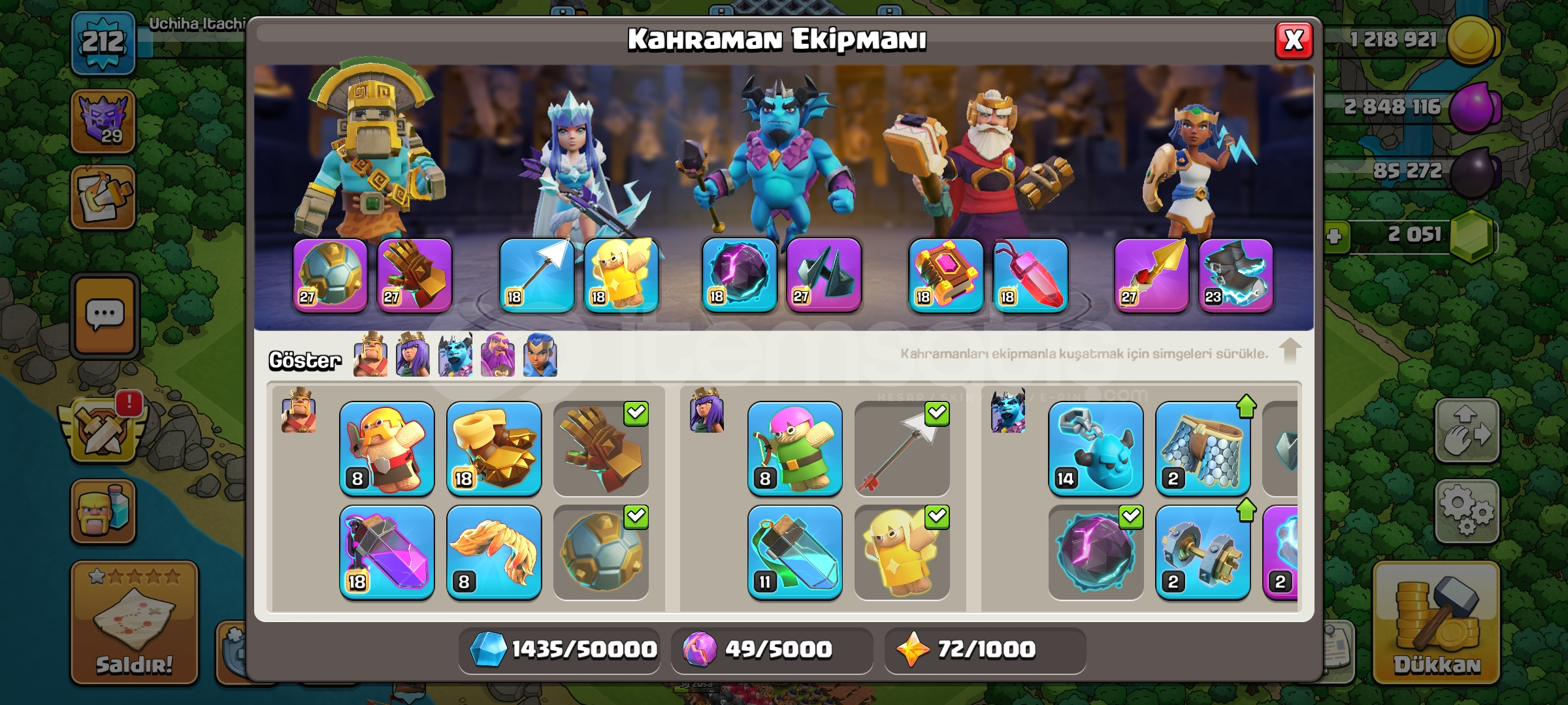 5 max efsanevi kahraman itemi-Max lvl simyacı-7 kahraman kostümü-6 inşaatçı-3K taş-212 lvl hesap