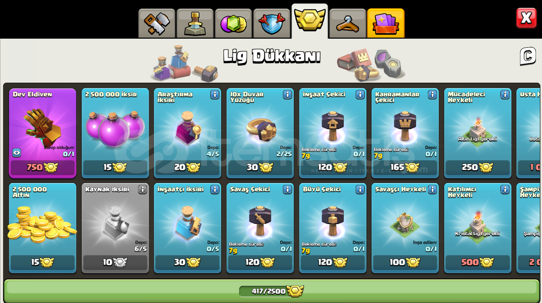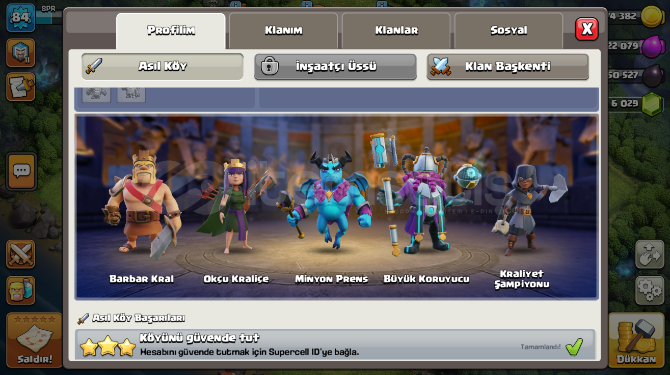 (İnşaatçı Köyü Açık Değildir.)Hesapta isim değiştirme 1000 taştır.Hesapta 6000 Yeşil taş mevcuttur.Hesapta Geleceğin Koruyucusu ve Gölge Şampiyon kostümleri mevcuttur.Hesabın tüm ağır savunması maxtır.4 Adet herşeyin kitabı mevcutttur. + İksir ve altın rünlerinden 2'şer adet bulunmaktadır.Hesapta koruma yoktur.Hesabı mail...