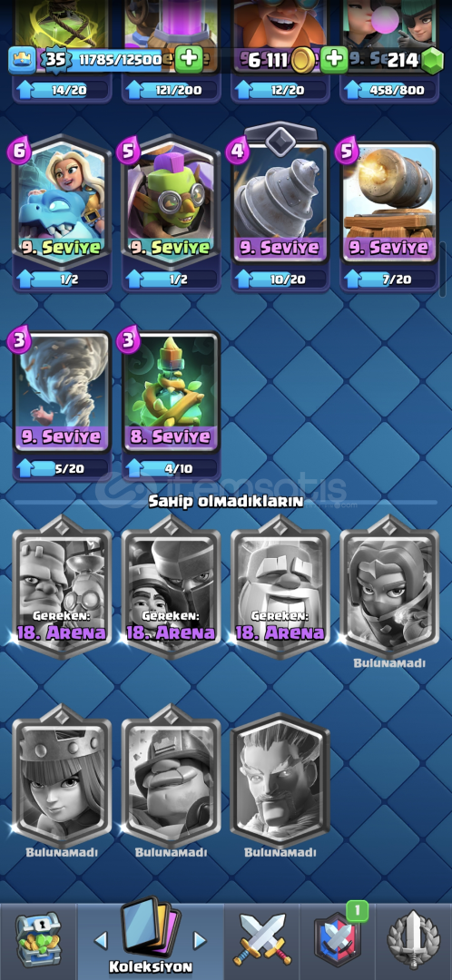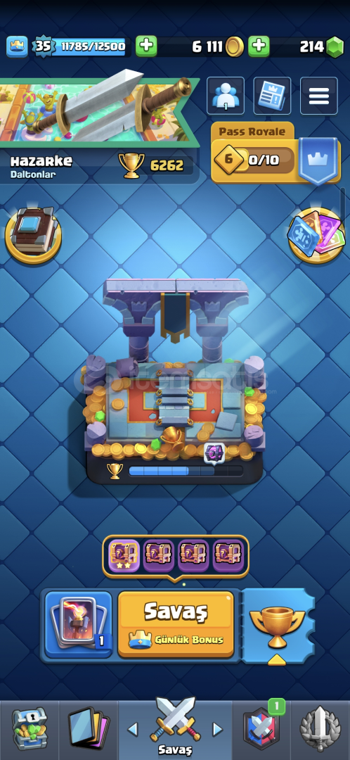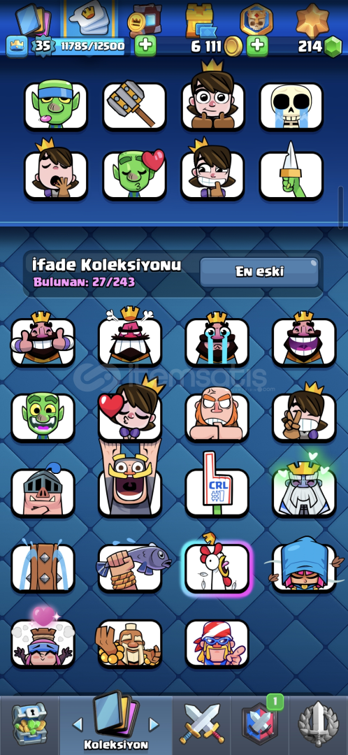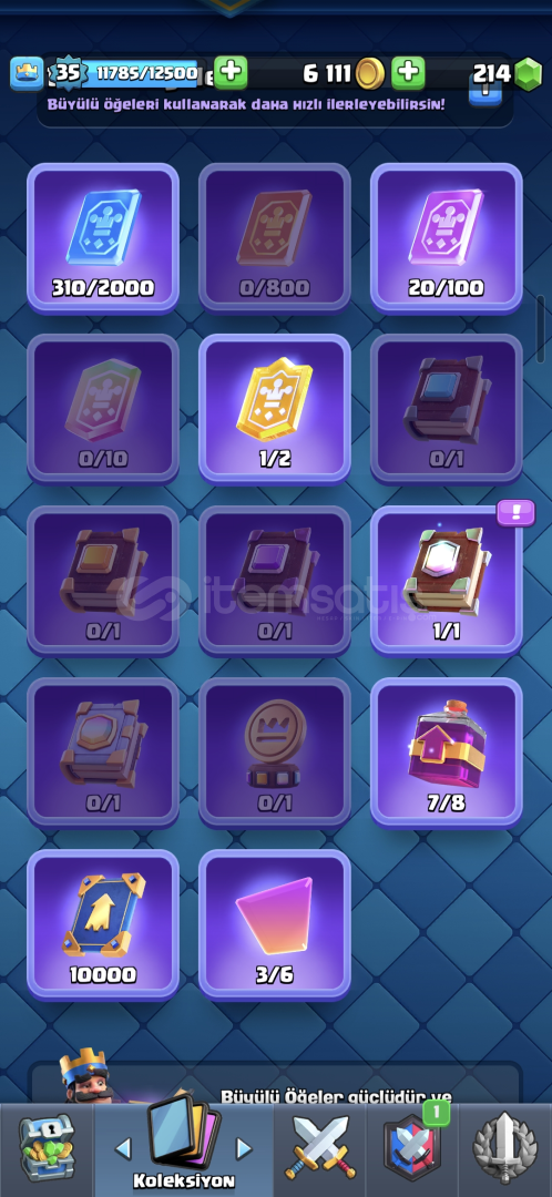 CLASH ROYALE:6262 KUPA,214 ELMAS,114 KARAKTER,1 TANE EFSANEVİ KİTAP,10000 ELİT JOKER KART VARDIR,ÜCRETSİZ İSİM DEĞİŞİKLİĞİ VARDIR.