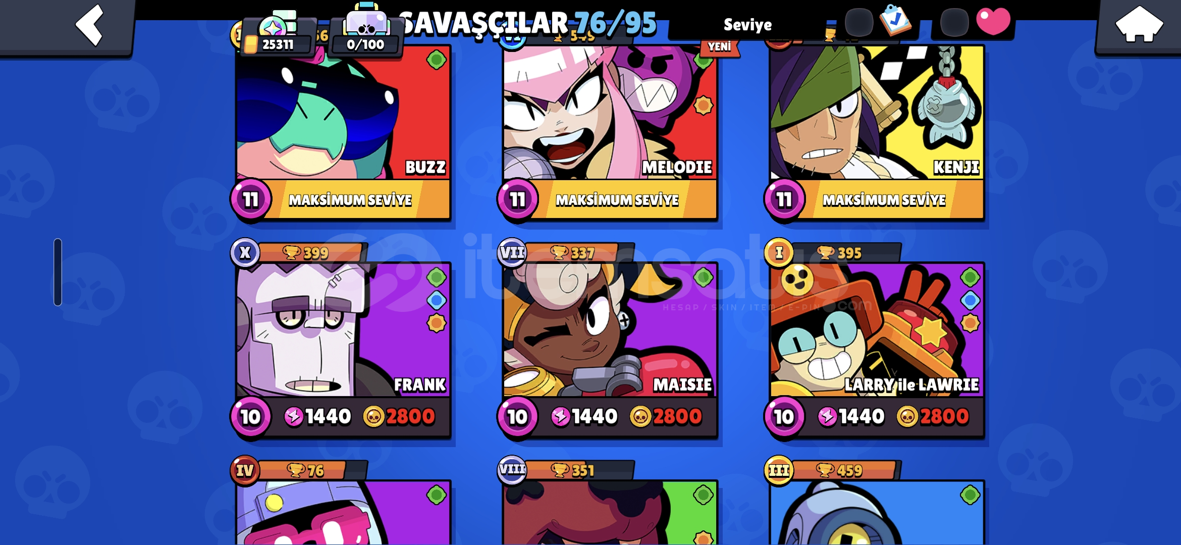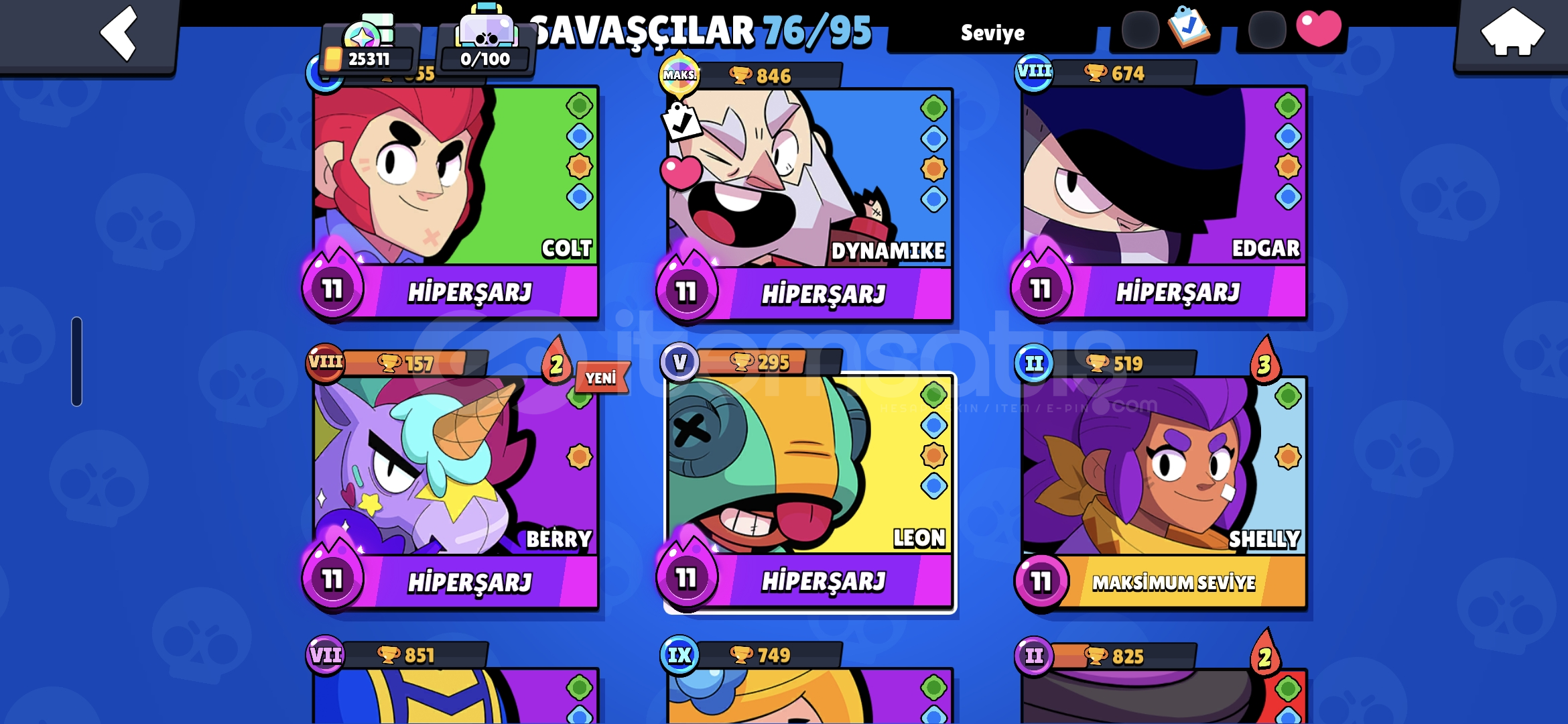 [CLASH OF CLANS,BRAWL STARS,CLASH ROYALE,PAZARLIK VARDIR,İSTEYEN MESAJ ATSIN.}BRAWL STARS HESABI İÇİN LÜTFEN MESAJ ATIN RESİMERİNİ ATAYIM SİZE BRWAL STARS:8 efsanevi karakter,5 hiperşarj karakter,12 maks karakter,76 karakter,25311,52 ender kostüm,33 super ender kostüm,28 destansı kostüm,3 gizemli kostüm,1 efsanevi kostüm,4 hiperşarj kostümü,68 sıradan rozet,25 ender rozet,2 destansı rozet,1...