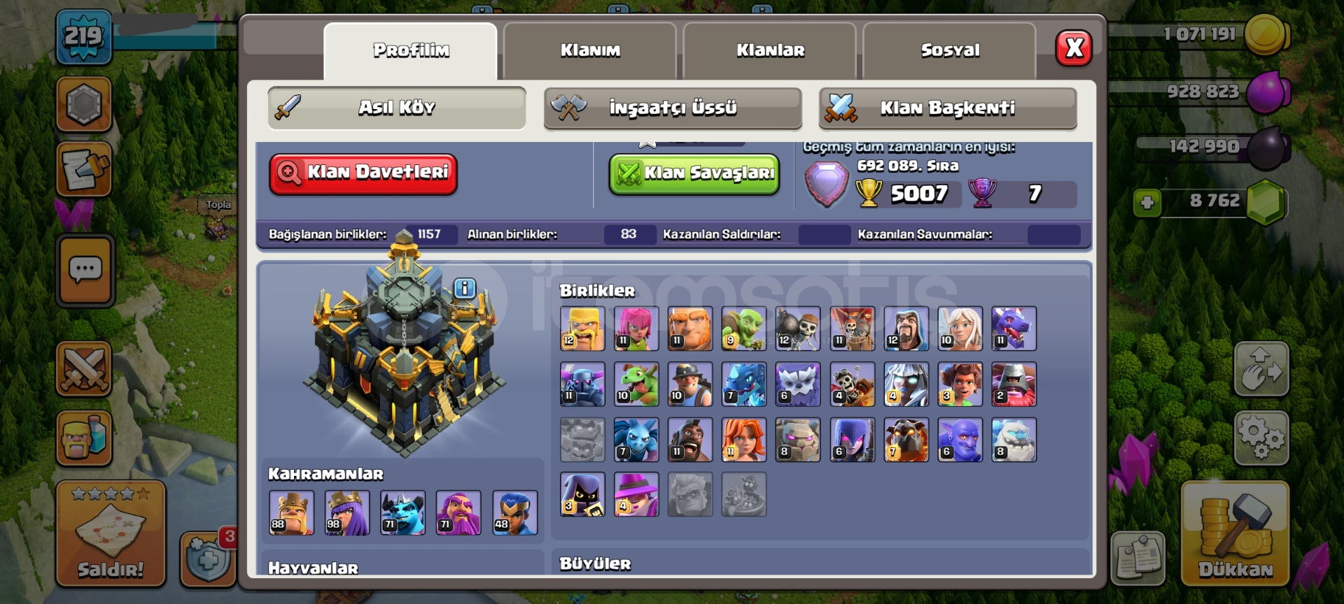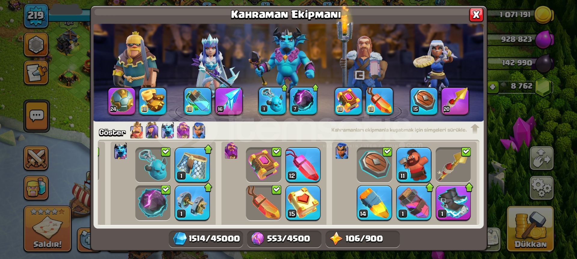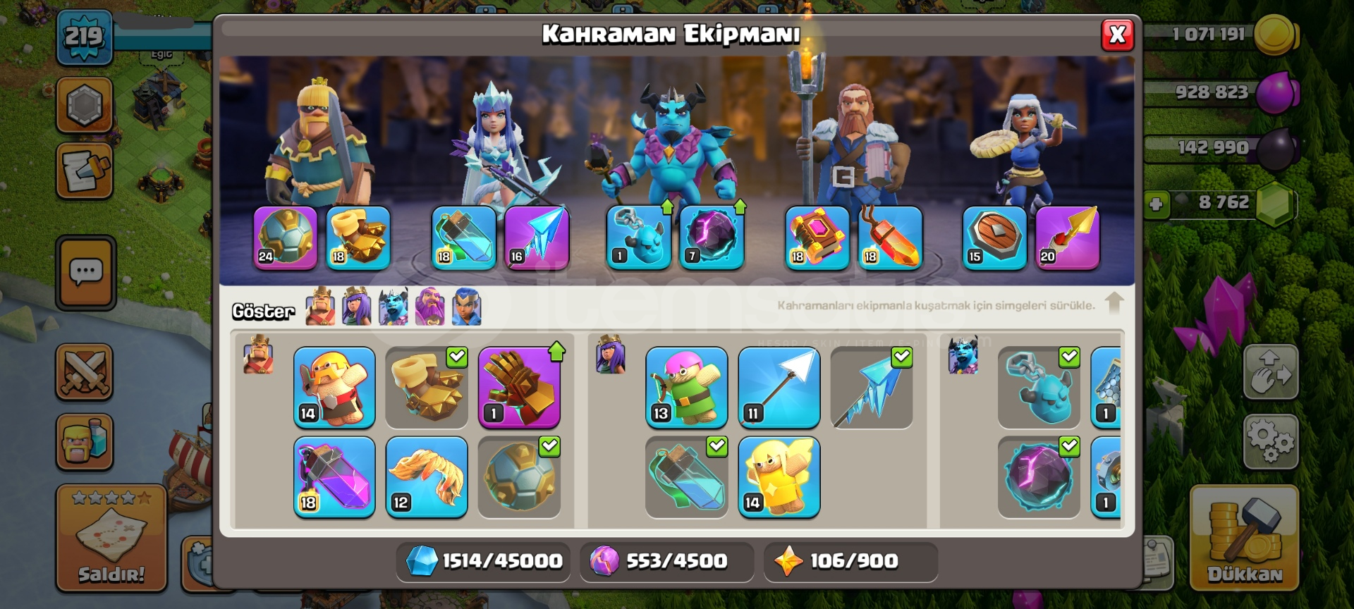 Hesap içerisinde;4 kral, 1 kraliçe, 2 koruyucu, 3 şampiyon skini mevcuttur. Duvar dışında herşey full geçilmiştir.392 lig madalyası ve 9k ya yakın elmas bulunmaktdır.İş sebebi ile vakit ayıramıyorum alıcısına hayırlı olsun.