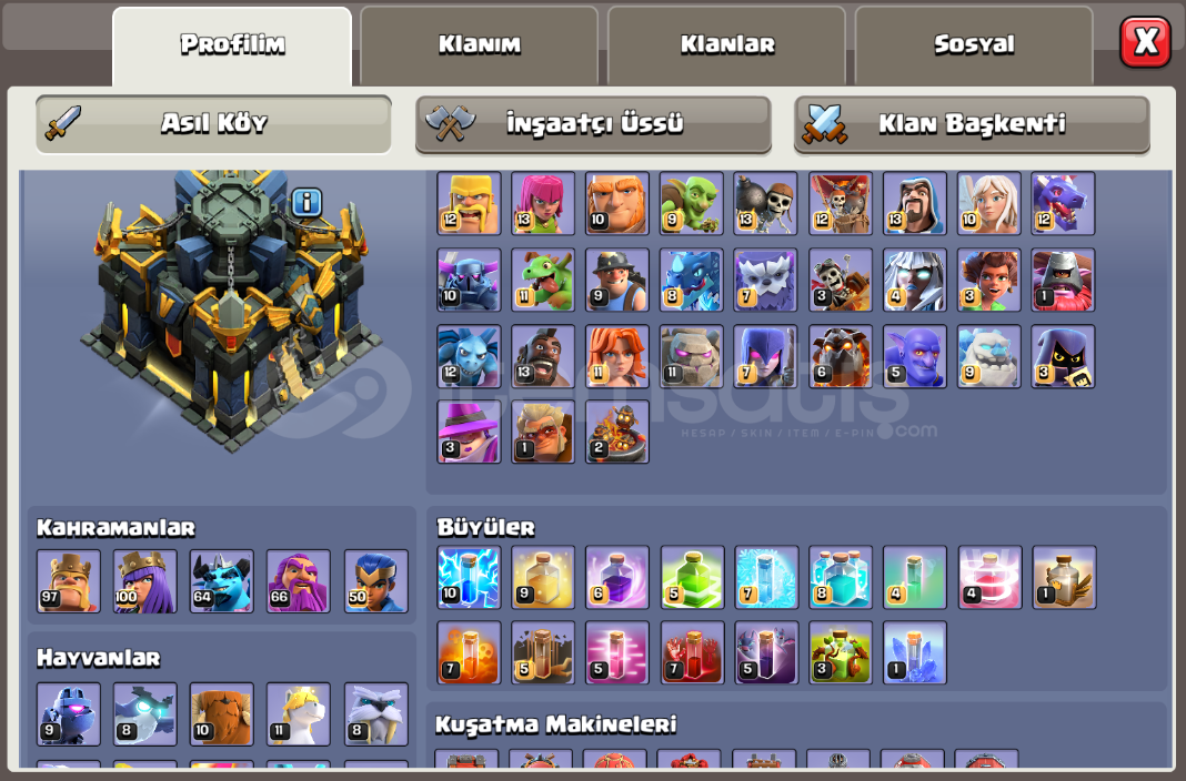 Hesap Max kıvamda'dırTuzaklar ve Duvar hariç savunmalar a dan z ye max149 lig madalyası mevcuttur .büyülü öğeleri dolu dolu'dur ekipman'lar iyi durumda'dır1000 taş isim değiştirme hakkı mevcutturskin kısmı fotoğraflarda bellidir..Alana Hayırlı Olsunharici bilgiler için yazmanız yeterSaat 13:00-00:00 arası işlem yapabilirim.