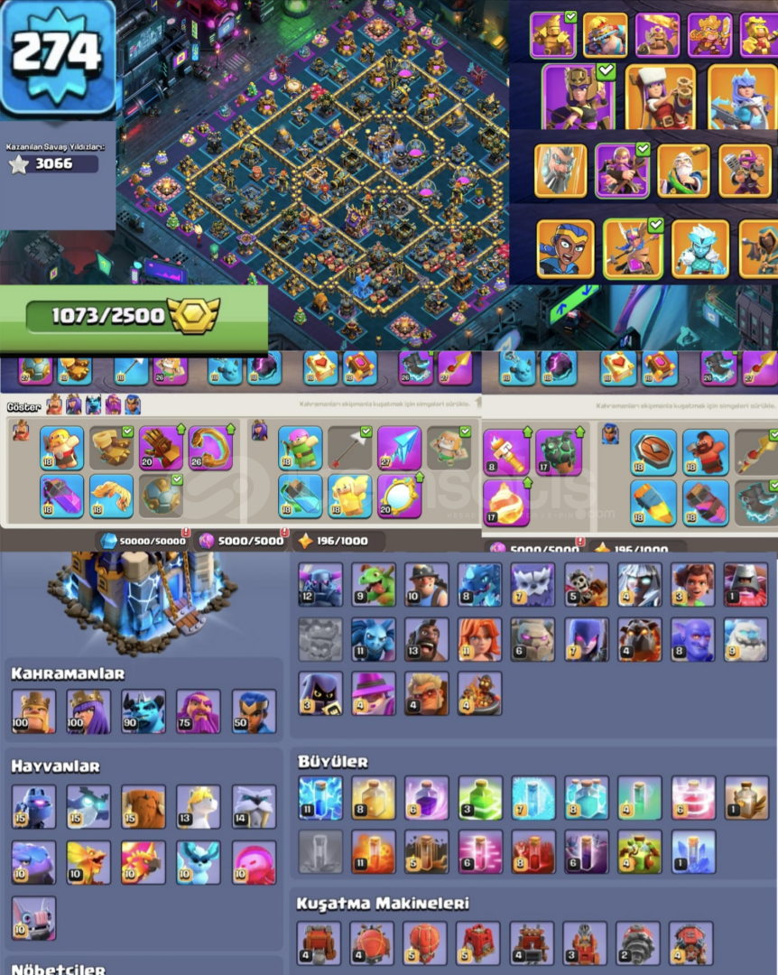 🔥BELEDİYE 18 🔥🌿 Şampiyon kostüm seti ⌛ 274 Seviye ⭐+3066 klan savaşı yıldızı 💫 2000 Madalya ile alınan lig kralı + 1073 Madalya ⚡Dolu dolu demirci 🍃 Mükemmel laboratuvar 🦁Sadece 6750 🦁