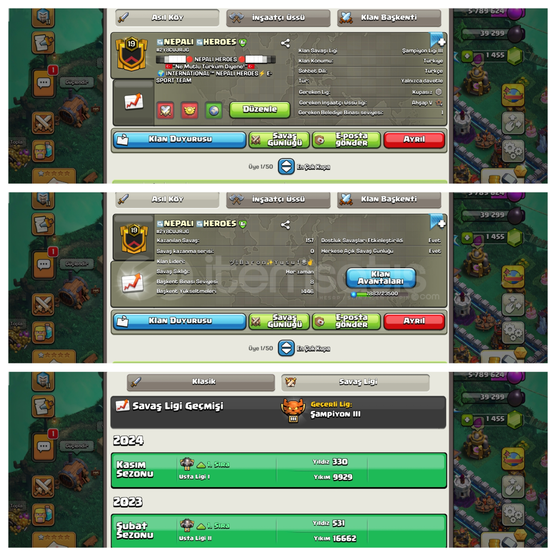 10/10 DEĞERLENDİRME PUANIAÇIKLAMAYI LÜTFEN SONUNA KADAR OKUYUNUZ !HESABIN EK ÖZELLİKLERİ ⚡️ ✨ 20 AZ KALMIŞ• ↪️NEPALI ↪️HEROES• Eşi Benzeri Yok !• Harika Savaş Günlüğü• şapiyon 3 ligi • Başkent Seviyesi 8• Başkent Yükseltmesi 1500• Alıcısına Hayırlı Olsun- Her Zaman En İyi Şekilde Hizmet Verm...