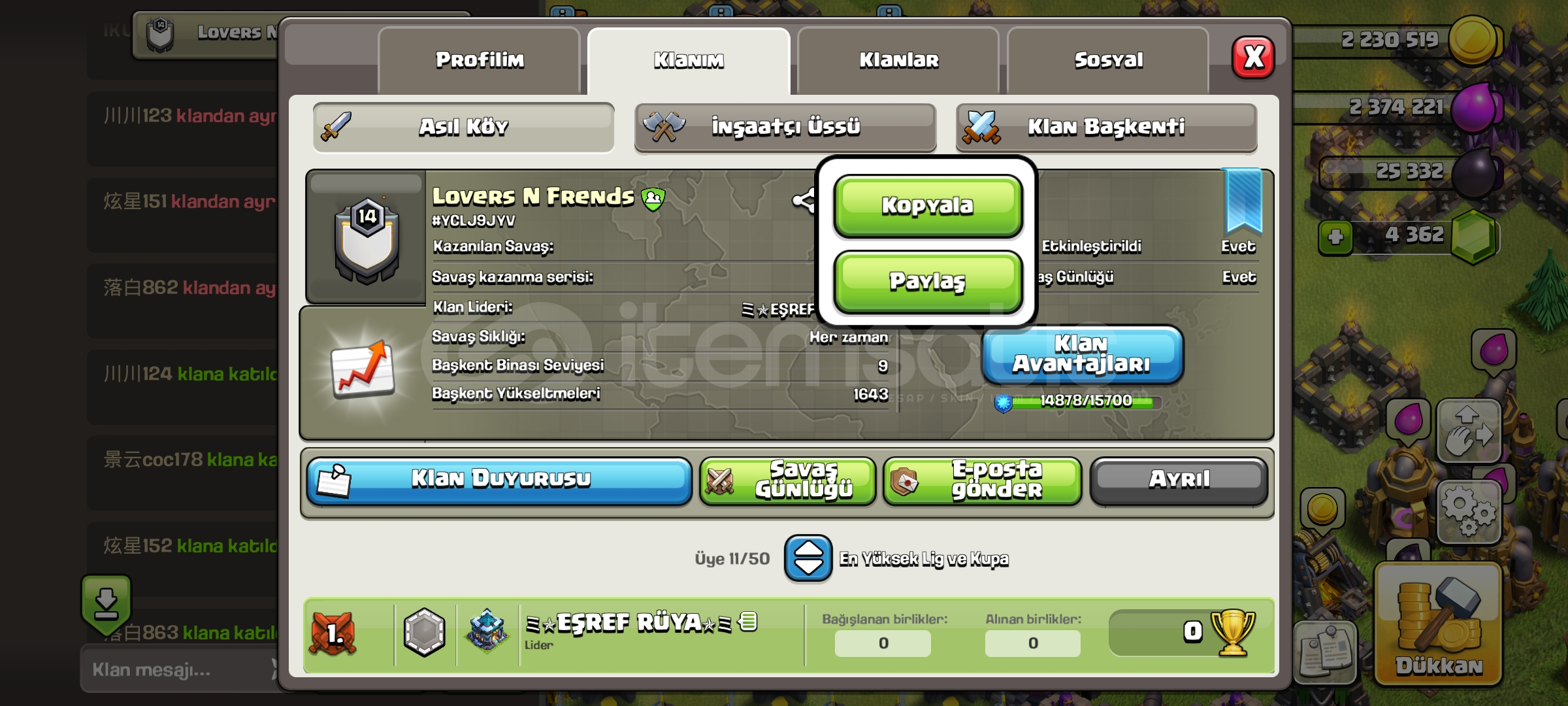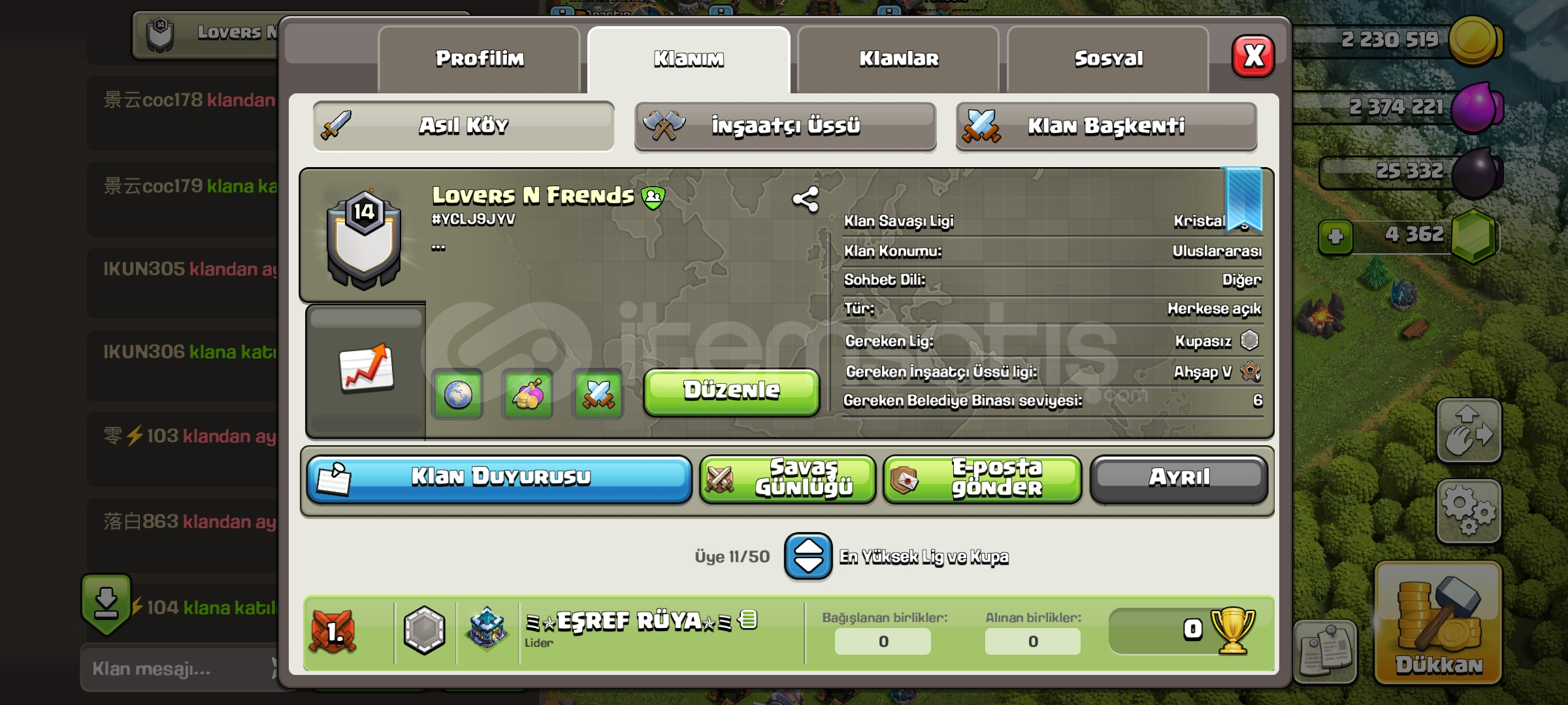 KLAN İSMİ LOVERS FRİENDS KRİSTAL 2 LİGİ'NDEBaşkenti iyi durumda SAVAŞ GÜNLÜĞÜ GAYET YERİNDEFIRSAT KLANI