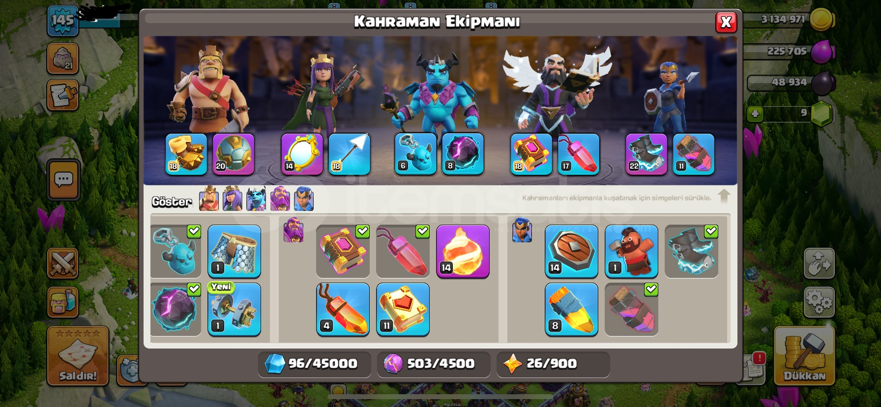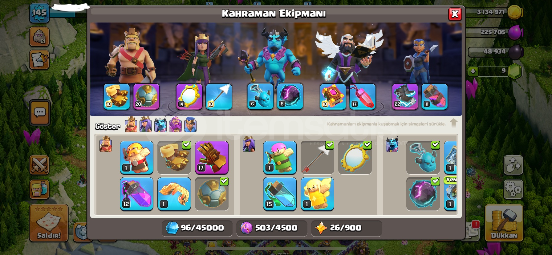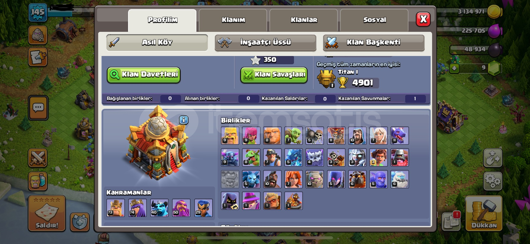 Hammer jam hesabım satılıktır demircisi sadece kullandıklarım ekipmanlar max a yakındır savunmalar askerler vs orta seviye hammer jam hesabı olduğu için duvarlar 15 lvl ful köyün içinden 25 30 tane 16 lvl basılmıştır sorunsuz hesaptır ilk mail ile verilecektir isteyene direk mail degiştirmede yapabilirim eski sistem efsane lig görmüş hesaptır titan 1 gözükmektedir alıcısına şimdiden hayırlı olsun
