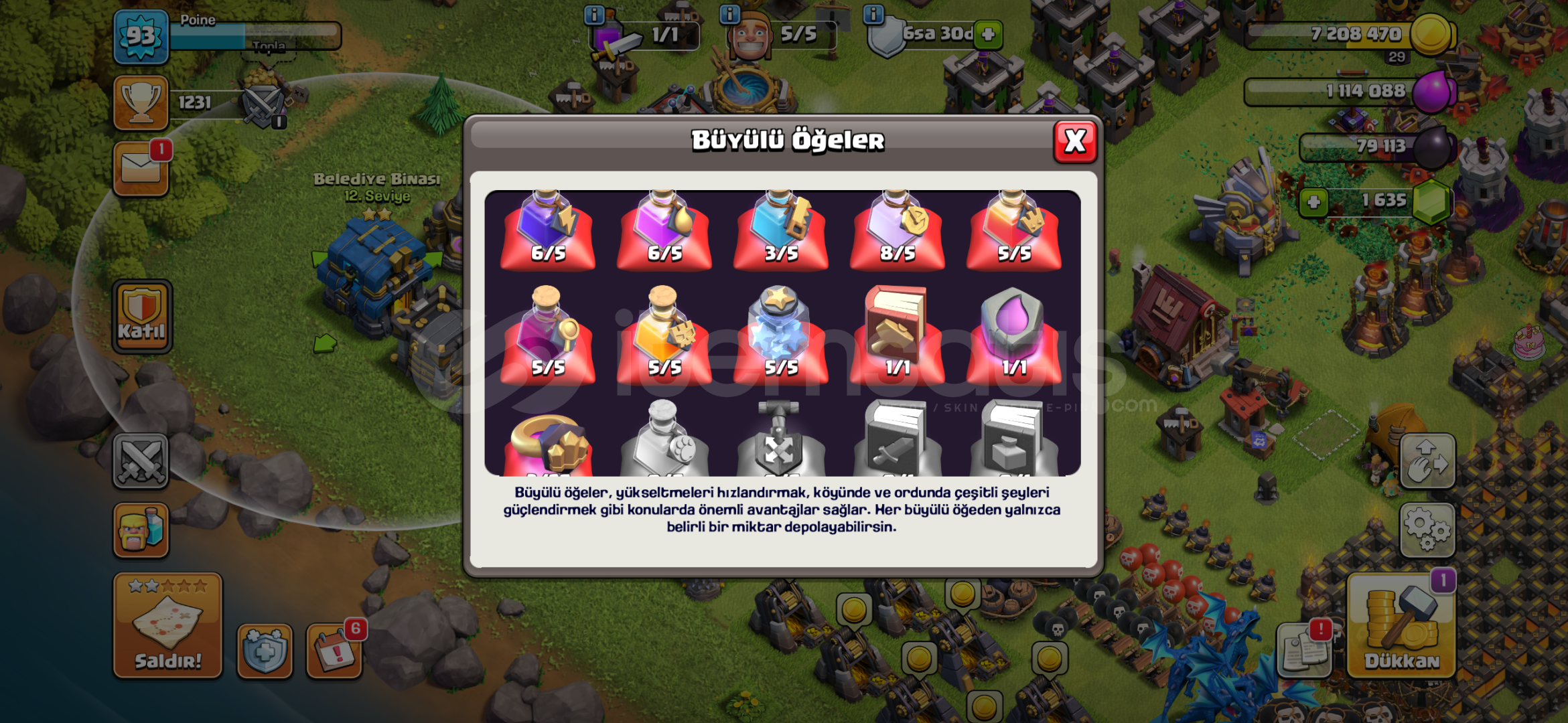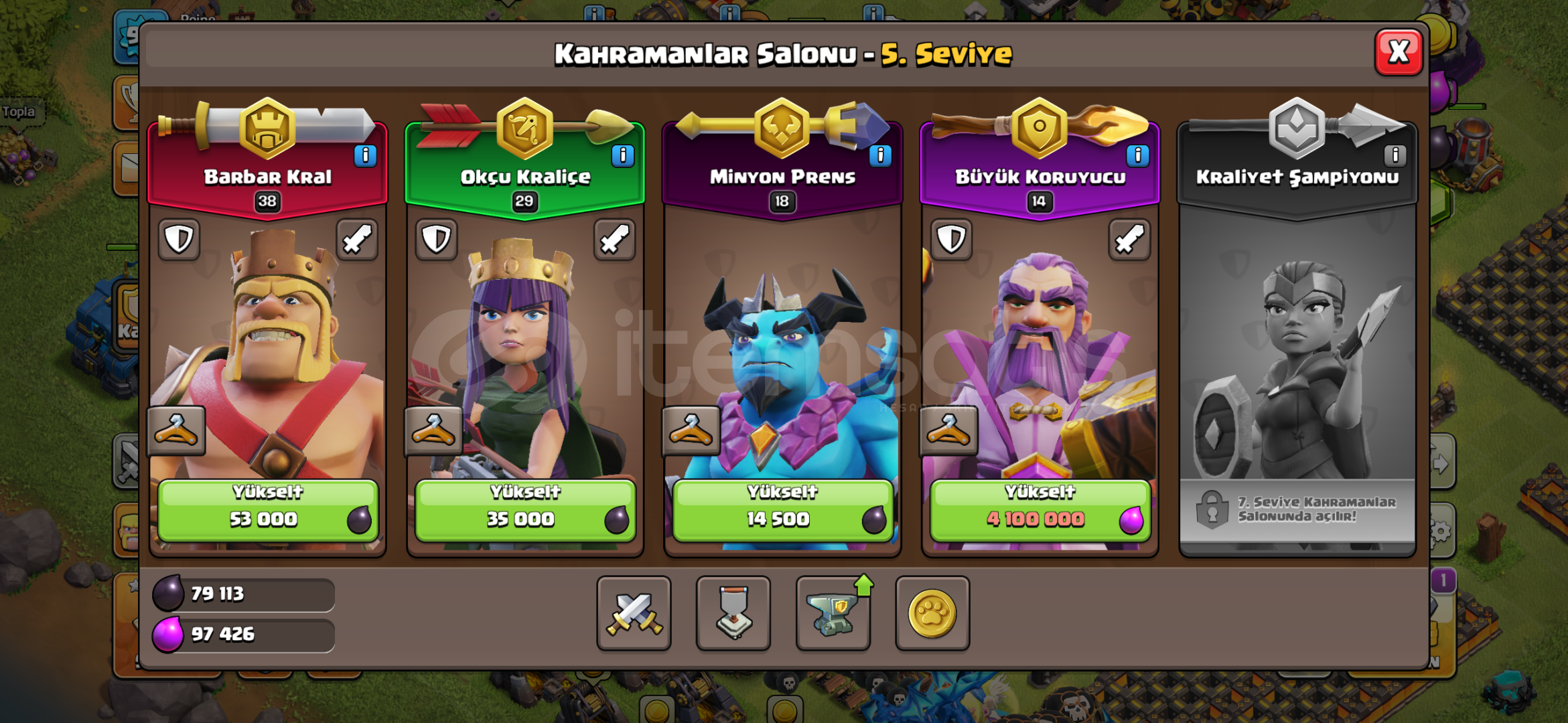 Öne çıkan özellikler:1653 ElmasBarbar Kral 38, Kraliçe 29Minyon Prens 18, Koruyucu 14Büyü seviyesi yüksekBütün köy düzeni ve kaynaklar tam optimize edilmişGüçlü savunma ve saldırı birimleriHesap güvenli ve hazır durumda, giriş bilgileri ile birlikte teslim edilir. İlgilenenler mesaj atabilir.