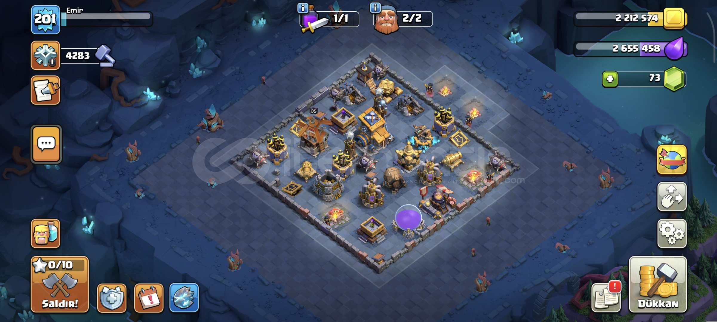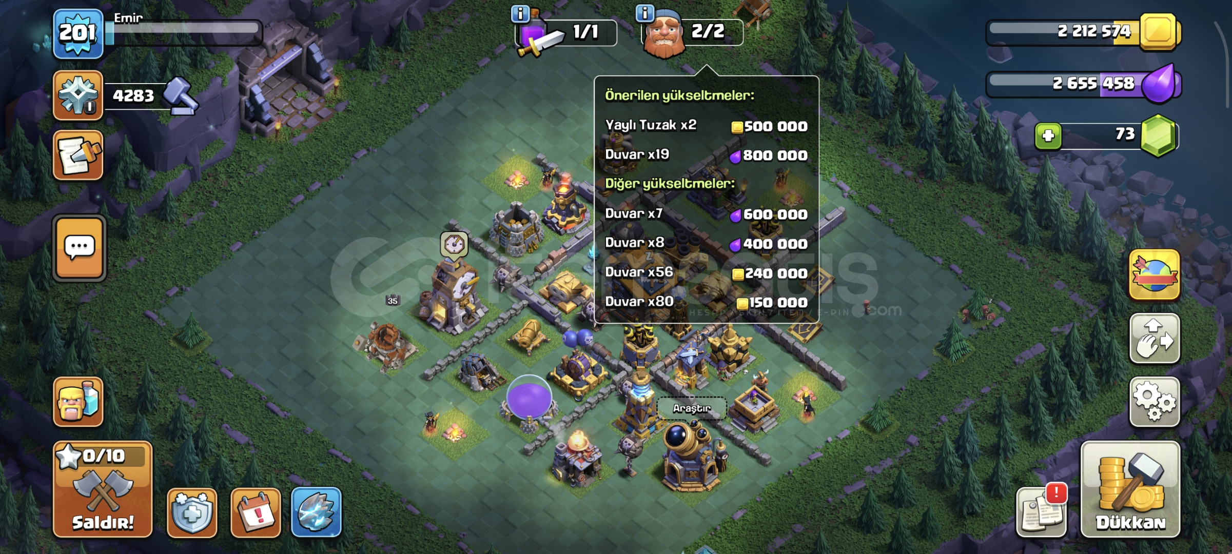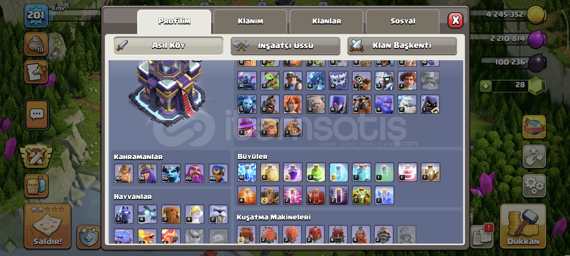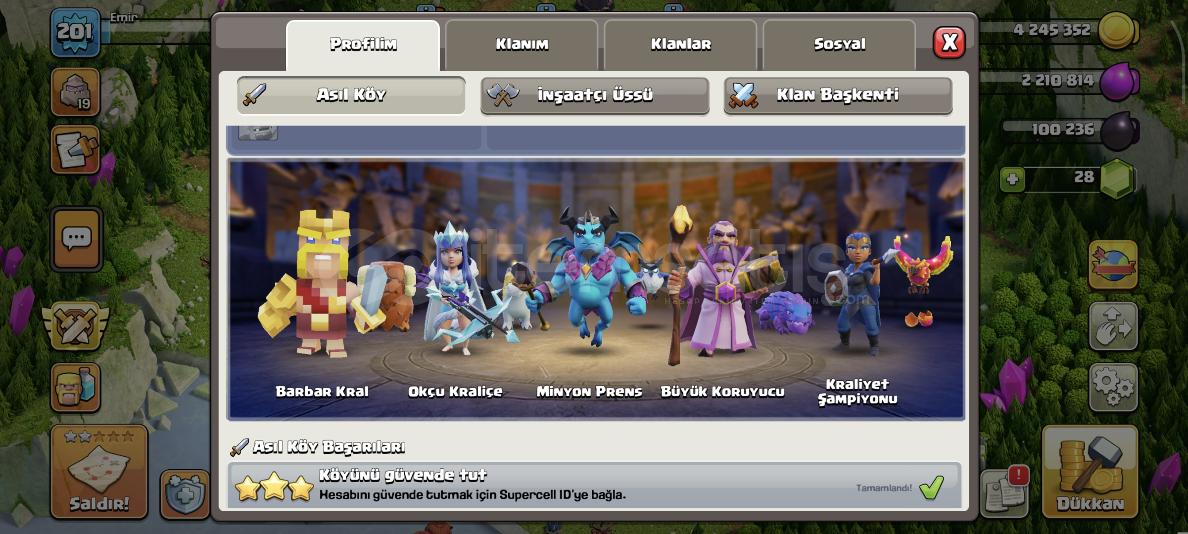 Dop dolu hesap6 inşaatçıYan köy fullSavunmalar fullKahramanlar full minyon prens haricFırsat hesabiKostumleri varAktif kull...