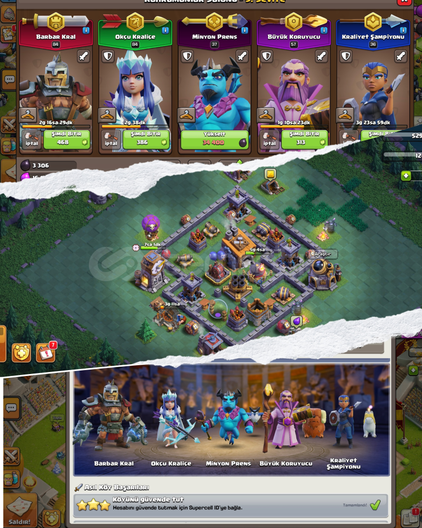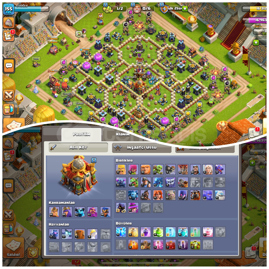13 BB ‘ den 16 BB ‘ ye Geçiş Yapılmıştır..Duvarlar Max’ tır .. Herolar 85 LVL ‘ dir . Şu anda Savunma Olarak 13 Bb den Geçildiği İçin Herolara Önem verilmiştir .. Ama Savunmalar Alacak arkadaş Kolay Yükseltebilir. Oyunun Tadını Çıkarır . SÜPERCELL lD ‘ Ye bağlıdır SADECE ..HEMEN TESLİM EDİLİR