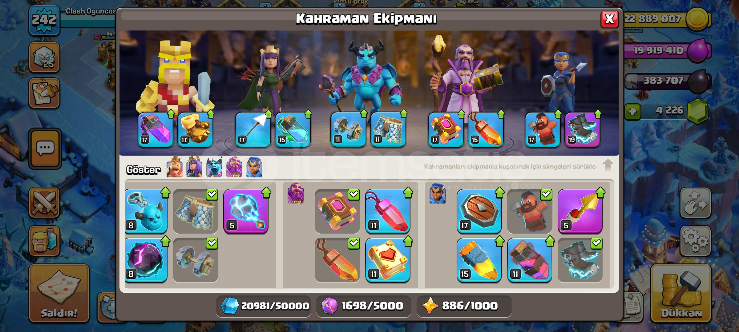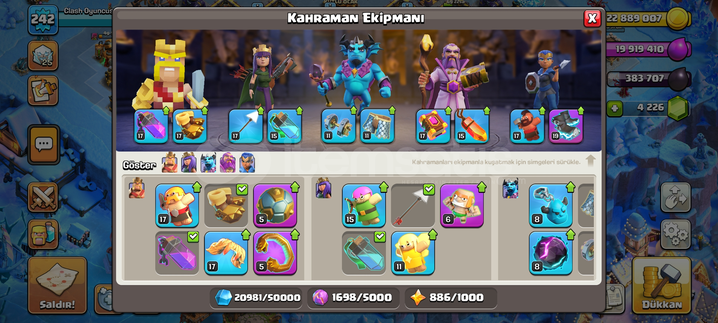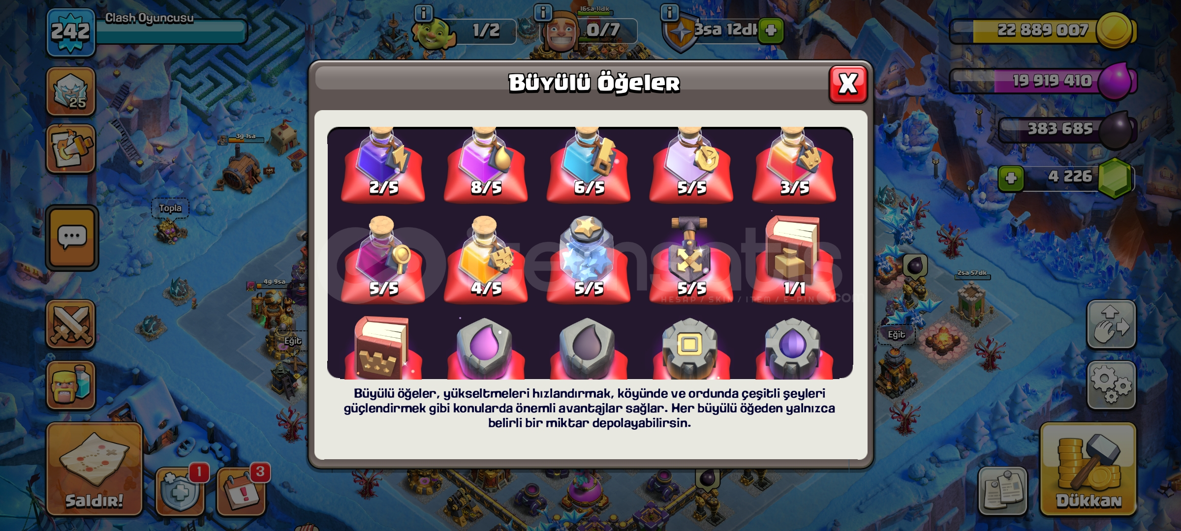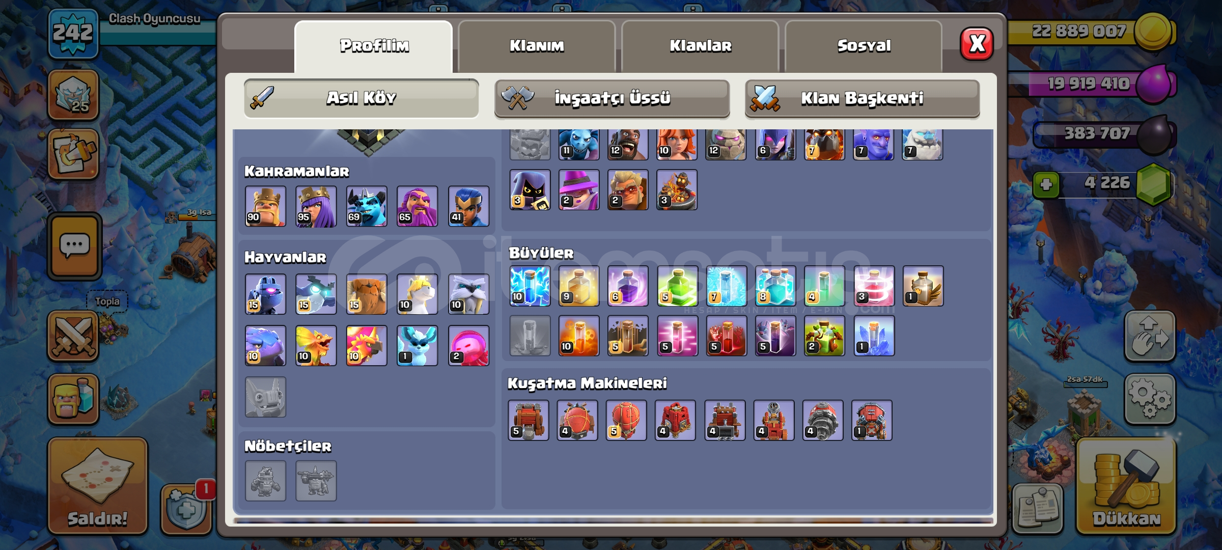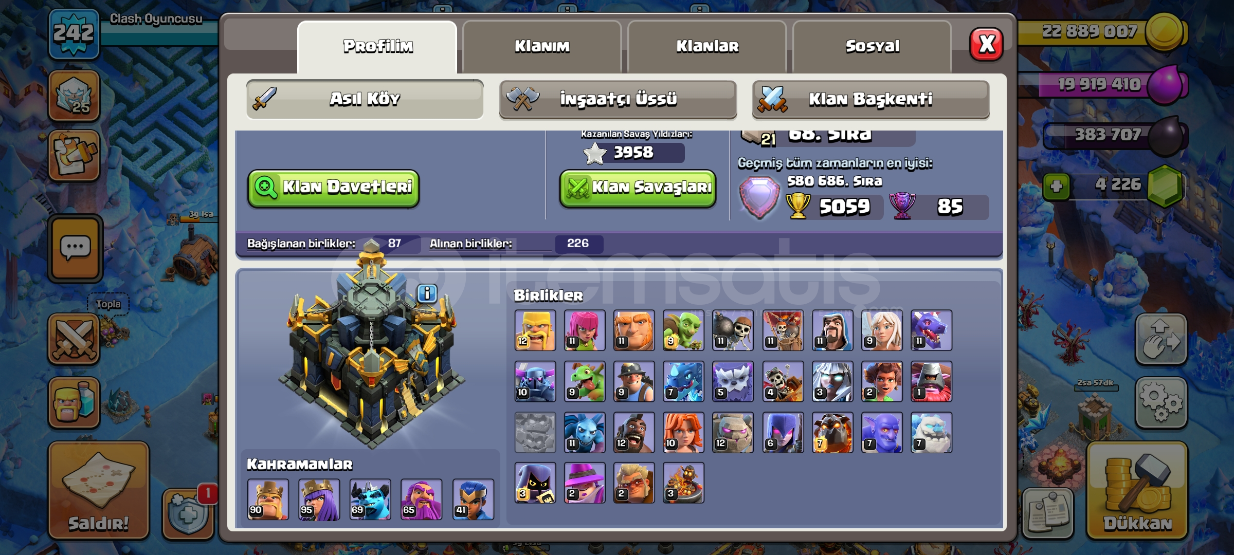4000 e yakın klan savaşı yıldızlı 2250 lig madalyası büyülü öğeler Başkent parası dolu dolu hesaptır. Koruma aktif değil vereceğiniz gmaile aktarılır. Ciddi alıcılar yazsın. Az da olsa pazarlık yapılır