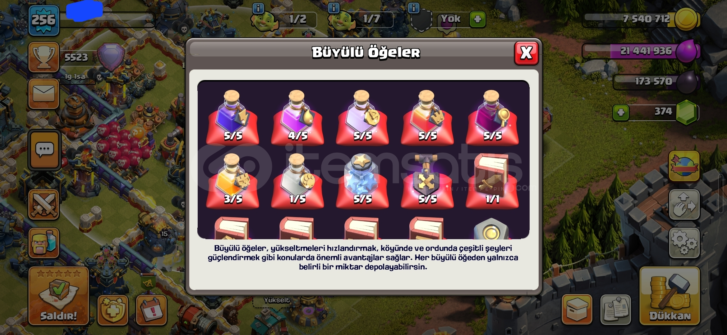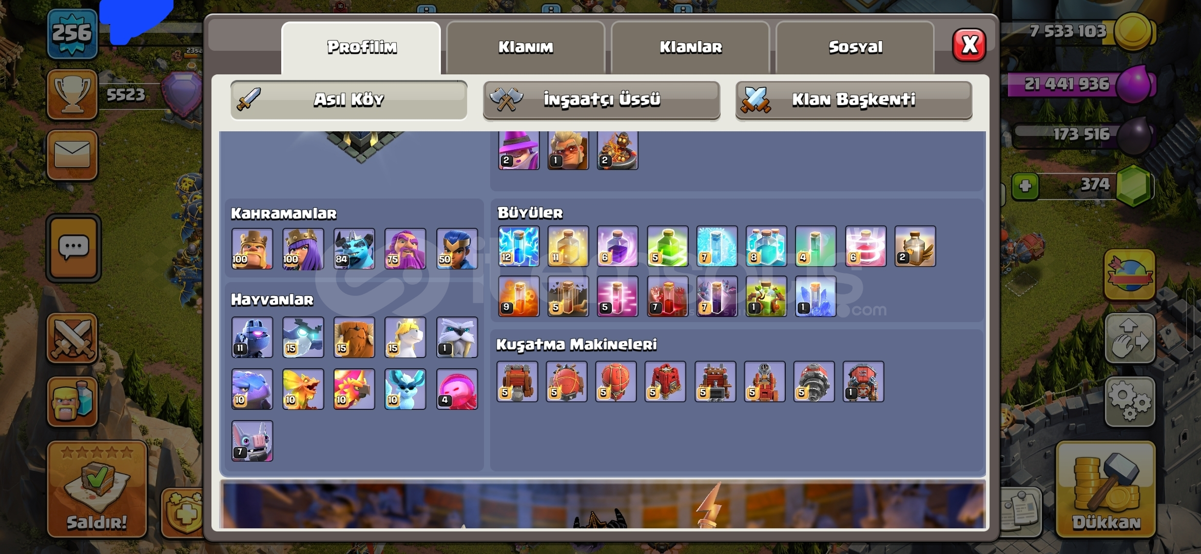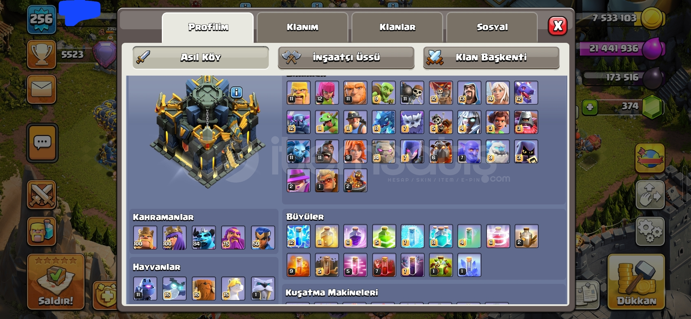 Th 17Yan köy full + full hiç bir yükseltme kalmamıştıBüyülü öğeler doludurDemirci iyi durumdadırHayvanlar iyi durumdadır Ücretsiz isim değiştirme var256 sv6 inşaatcılıPass açık 1090 madalya395 Taş2518 savaş yıldızıDünyada ilk 4385 e çıktıKral, kraliçe, büyük koruyucu ve kraliyet şampiyonu full Minyon prens 84 sv Sayı...
