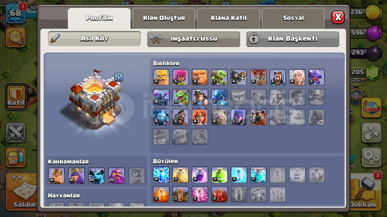 Clash Of Clans Hesap Özellikleri :🌟| Hesap 68 seviyedir.🌟| Hesapta 338 adet madalya bulunmaktadır.🌟| Hesapta 205 adet elmas vardır .🌟| Hesapta güzel birlik ve kahramanlar vardır.✨| Satın alma işlemi sırasında video kaydı almanızı önemle rica ediyoruz. Hesaba giriş yapana kadar kaydı sonlandırmayınız.
