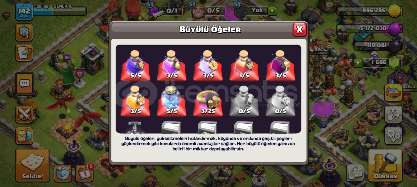 12 fullenmeden 13 e geçildi ama direk yükseltme yapılmadan geçilmedi. 12 yarılanıp geçildi. Savunmalar vs iyi durumda.2 tane destansı ekipman bulunmakta. Dikenli top ve Ateş topu. Hesaptaki taşlar ile 1 destansı ekipman daha alabilirsiniz.Mail değişimi yapılacak veya direk maili size verebilirim.Kuşatma makineleri 1. seviyedir 3 tane açıktır. Görsellerde çıkmamış.Lig madal...