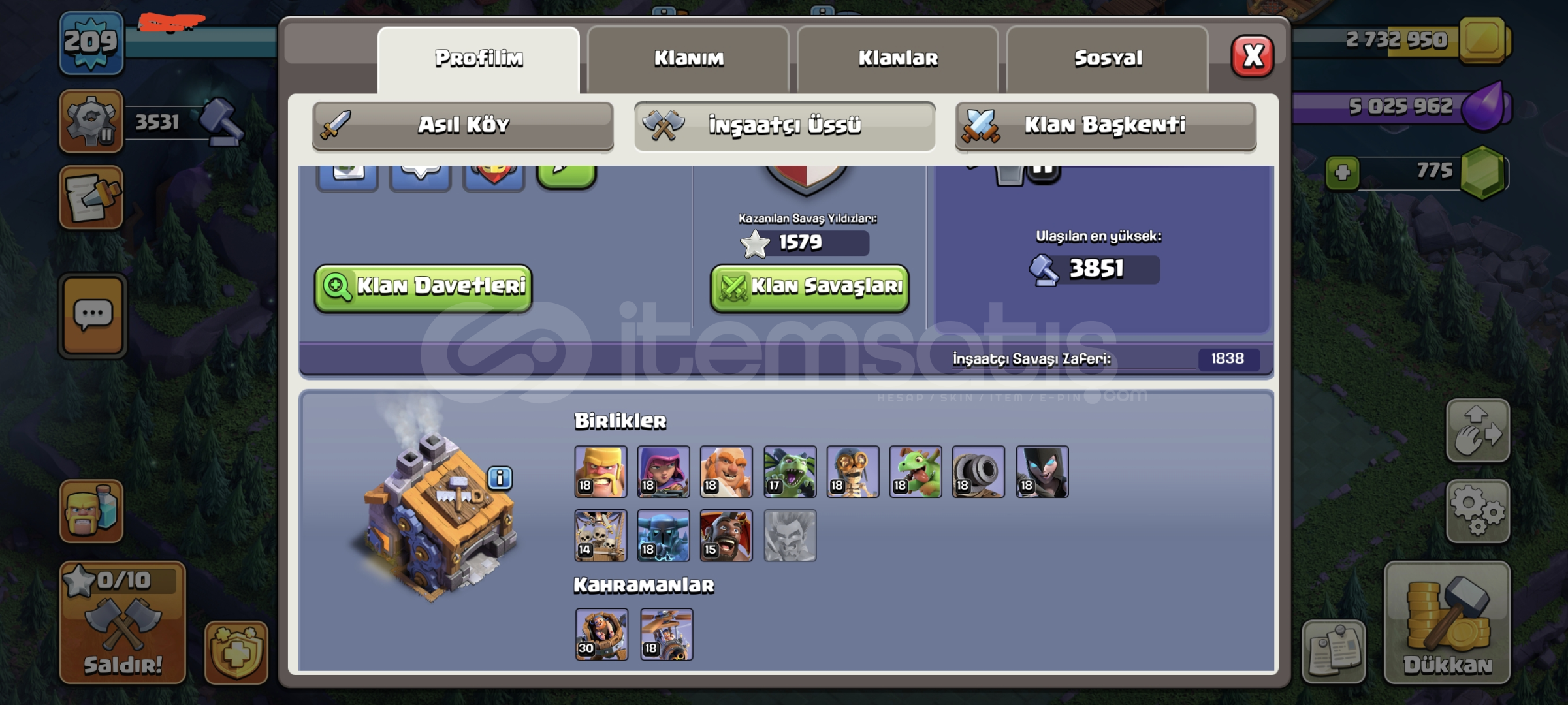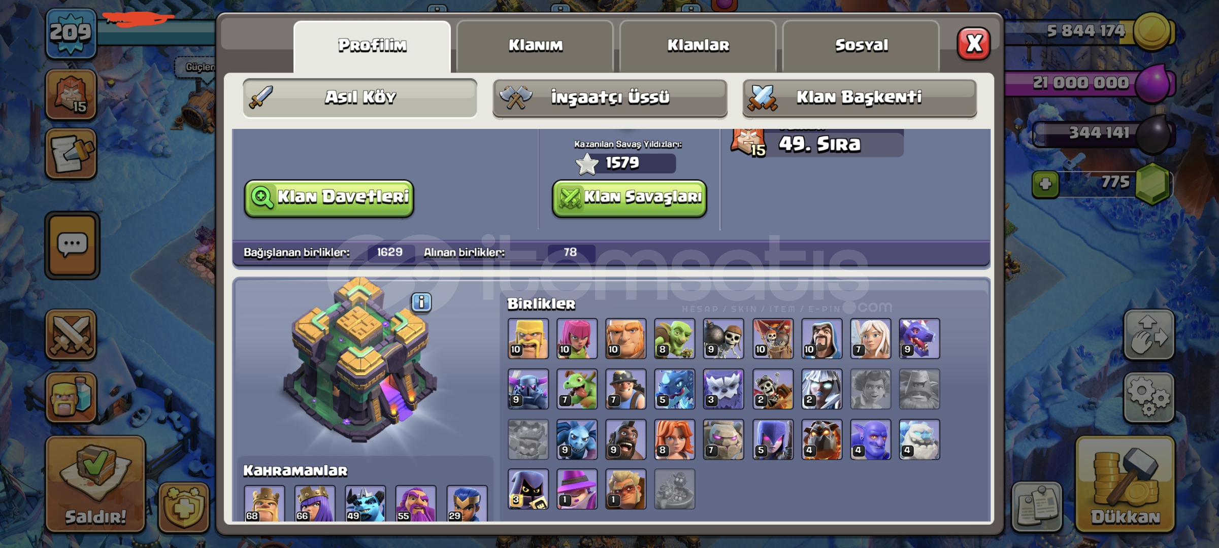 Merhaba arkadaşlar ilanımıza hoşgeldiniz -Hesabımız 210 seviye -6 inşaatçılı- Neredeyse max hesap-8 seviye 9 az kalmıştır klan şuan tamamen aktif olarak çalışmaktadır- Klan başkenti 7 seviyedir 8 e az kalmıştır-1500+ klan savaş yıldızıBU FİYATA BU KADAR EKSTRALI HESAP BULMAK ZOR VE KLANDA İÇİNDEDİR AKTİF OLARAK ÇALIŞMAKT...
