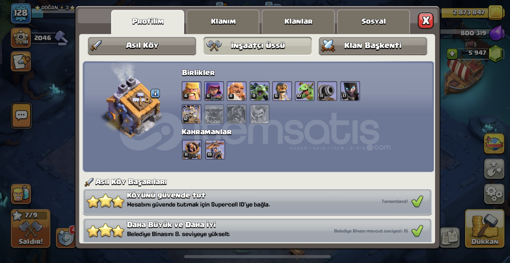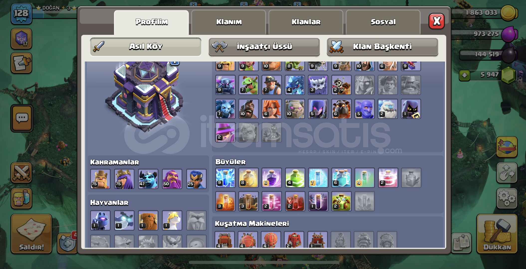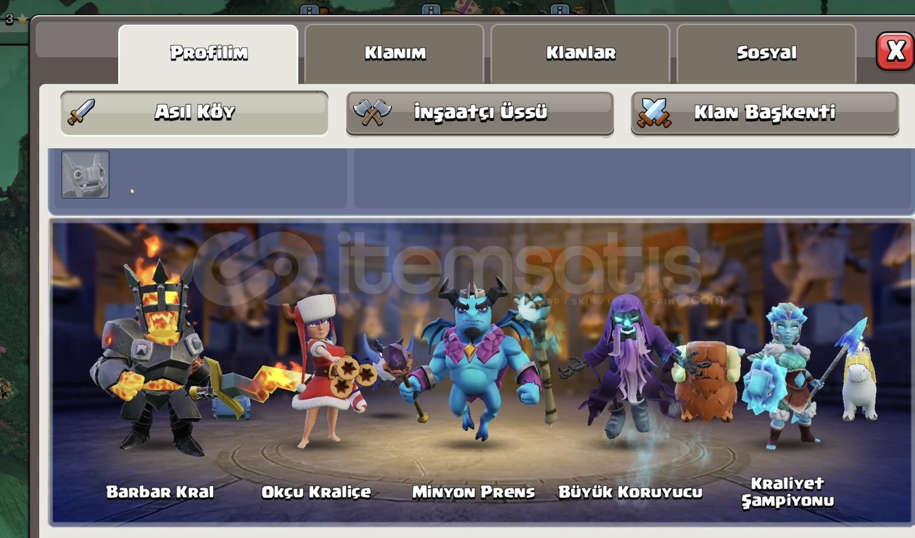 TH15 5947 ELMAS GÜZEL TEKLİF VEREREK SENİN OLABİLİR GÜZEL TEKLİF VEREREK SENİN OLABİLİR. GÜZEL FIRSAT HESAPLig Madalyası - 1390Elmas - 5947Baskın Madalyası - 5000Barbar Kral - 75Kraliçe - 75Minyon Prens - 47Büyük Koruyucu- 50Kraliyet Şampiyonu - 25KAHRAMAN EKİPMANLARI EKSİKSİZ HEPSİ MEVCUT. ARKA PLANLAR ve KOSTÜMLERÜrkütücü Arka PlanıFutbol ...