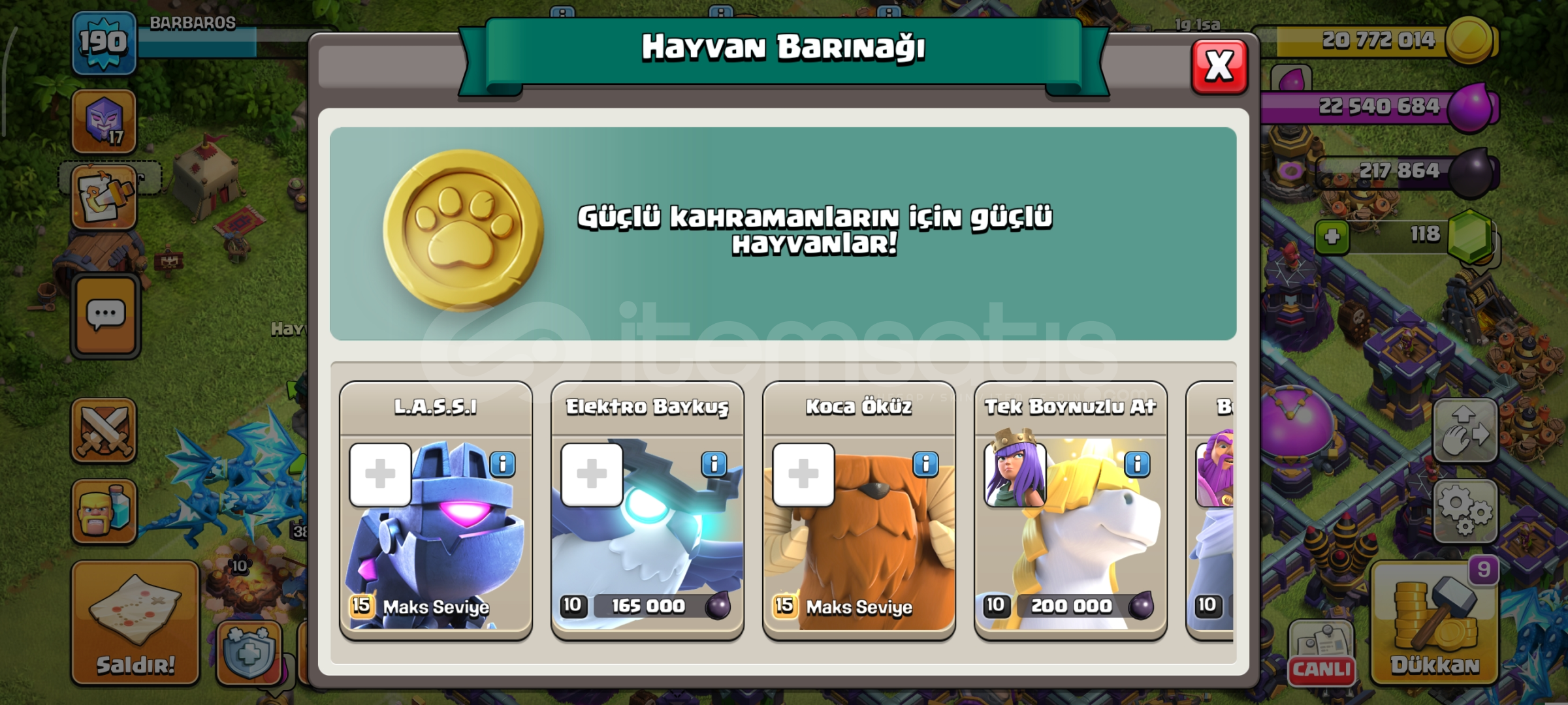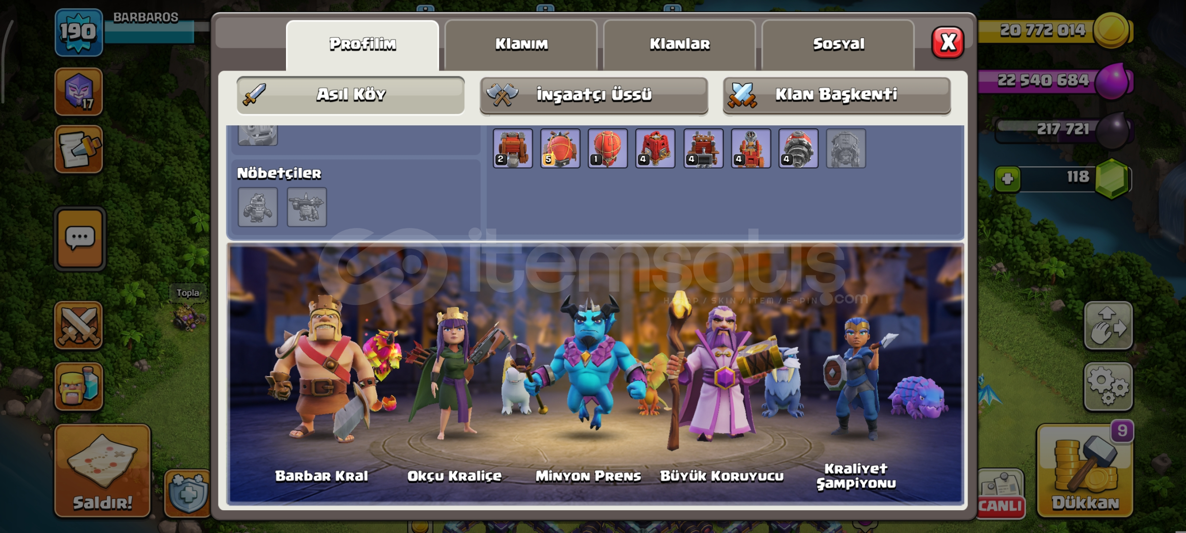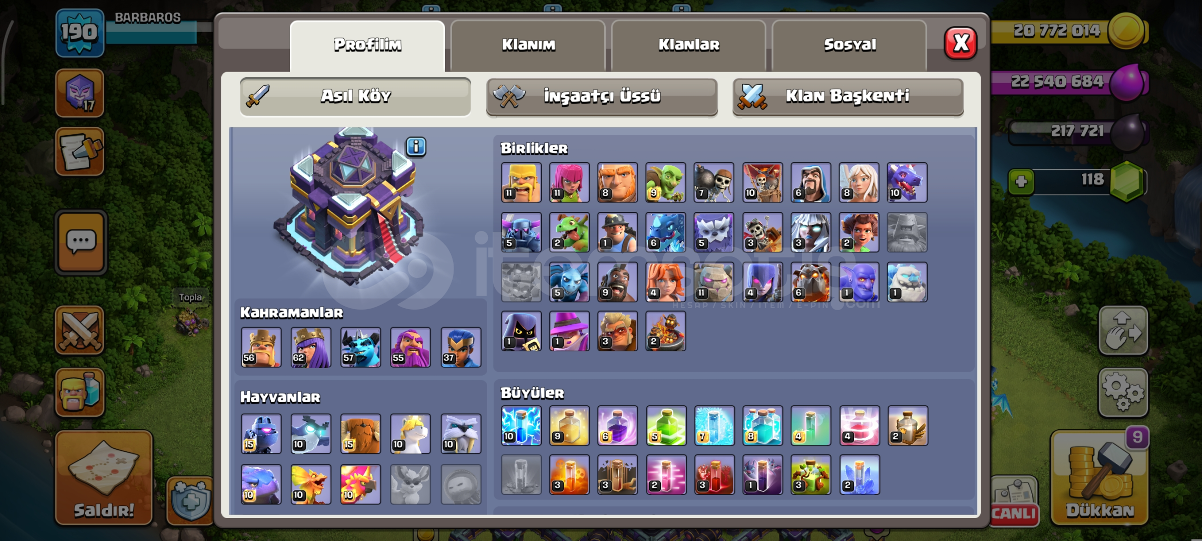 📈 DETAYLAR (Full Foto/Video DM!):• TH15 Max Civarı Köy (Hero %70 Max)• Kupa: 20.772 Masters (Atakçı Rusher!)• BB: 217-721 Kupa• Klan: BARBAROS (#BBVPQ98) - LİDER (Bonus Dahil!)• Hero: BK56 | AQ62 | GW57 | RC55• Pets: L.A.S.S.I 15 Max | Mighty Yak 15 Max | Diğer Max• Siege Max | Equip 12+ Epic (1554 Oobs)• Lab Assist 6 | Build 8 | Smuggler 3• Oobs 118+ | Clan Games Dolu💎 ARTILAR: 20k+ Kupa (Nadir!), Lider...