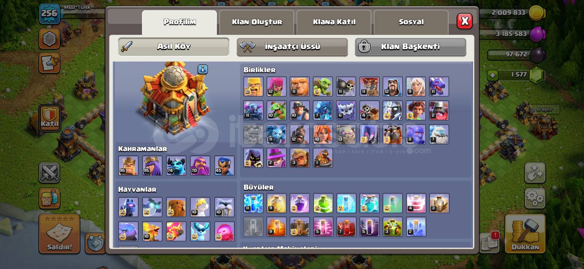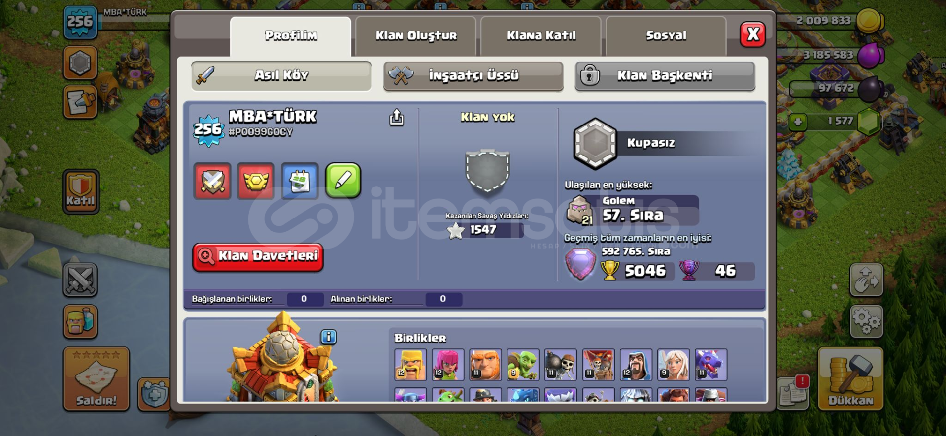 Hesabın Maili Sizin Mailinizle Değişecektir!------Hesap Hakkında------Hesap 256 LeveldirHesap Belediye Binası 16.Seviyeye Ulaşmıştır Hesapta Laboratuvar Neredeyse Max lanmıştır.Hesabın Tüm Duvarları Max lanmıştır Hesaptaki Herolarda Kostüm Vardır Gece Köyü Fullenmiştir Hesap Efsane Lige Çıkmıştır. Hesapta 1577 Elmas Vardır.----------------------------...