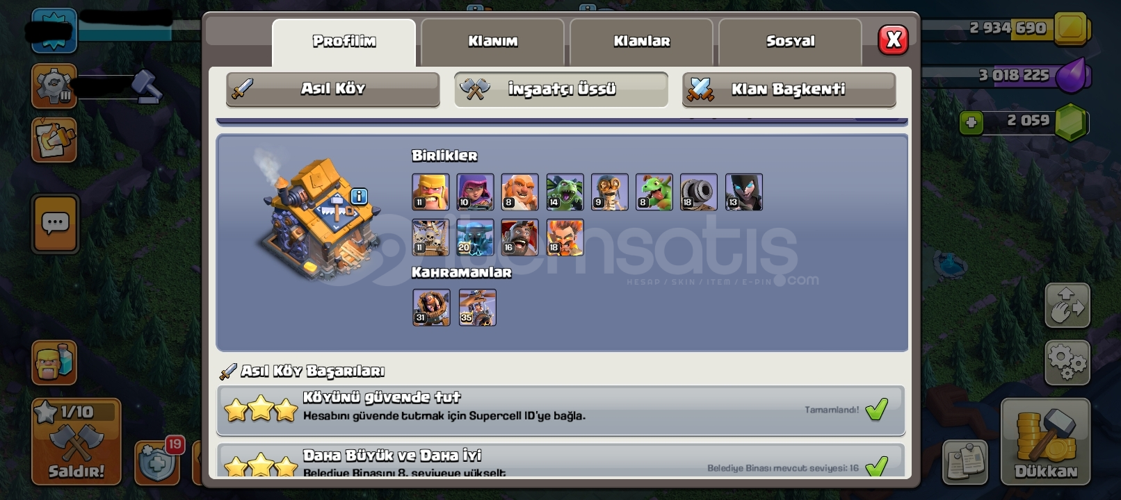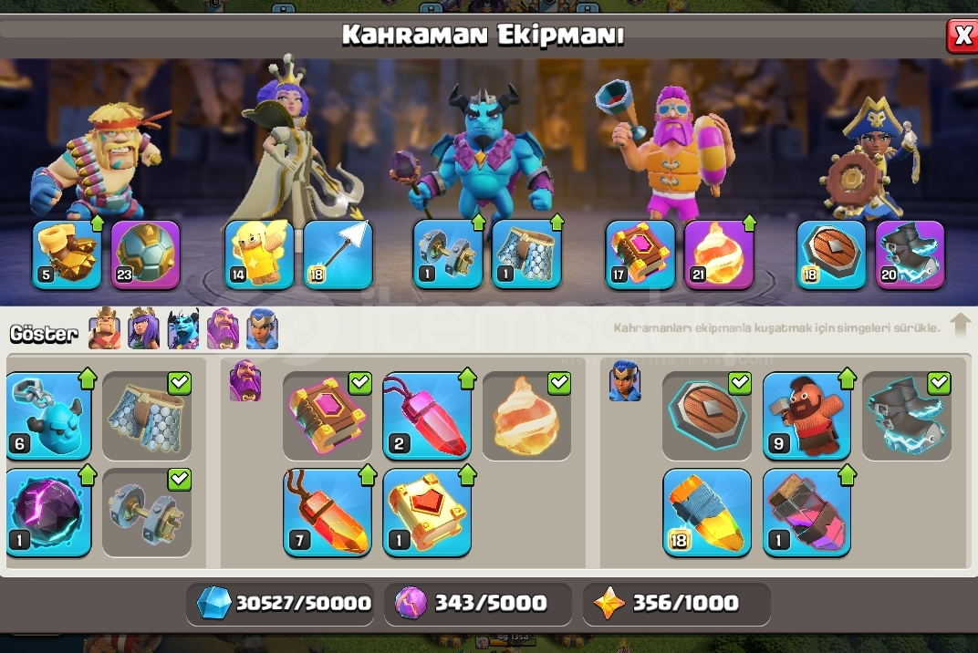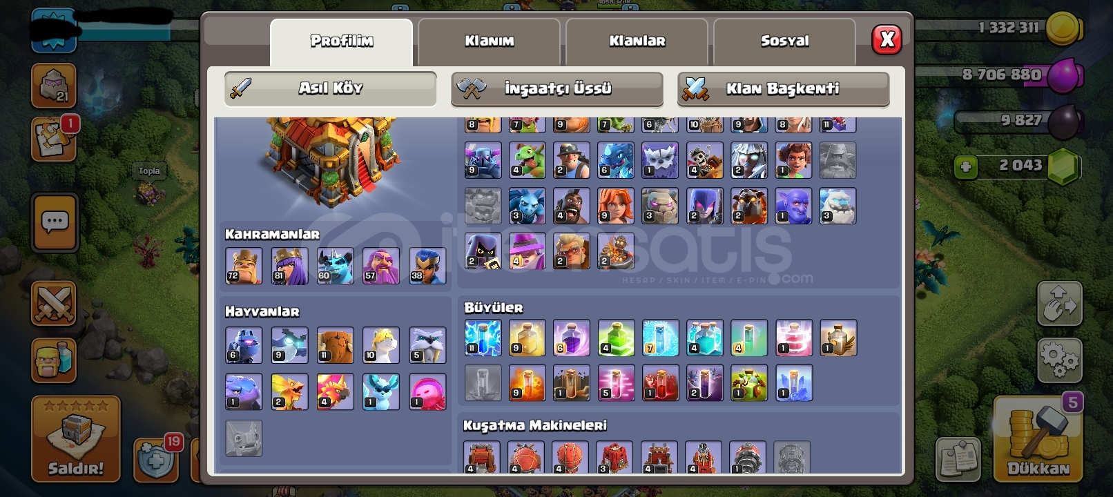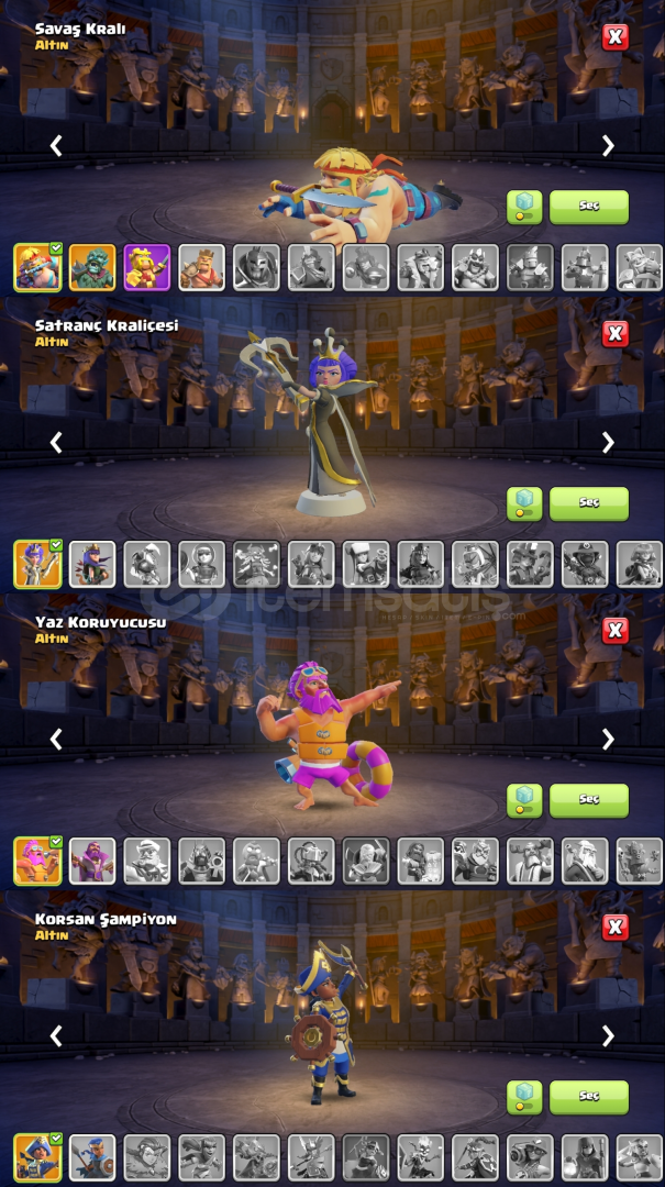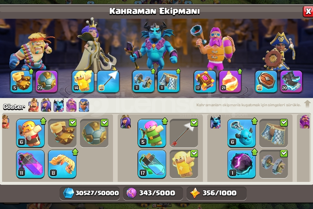 Kral da 1 Kostüm, Kraliçe de 1 Kostüm, Koruyucu da 1 Kostüm, Şampiyon da 1 Kostüm vardır.Demircisi Sağlamdır, Fotoğrafta mevcut.2000+ Yeşil Taş, 862 Lig Madalyası vardır.Hesap Koruması açıktır fakat numara ölüdür. E-postası temizdir,Hesap epostasını değiştirmeyi denerim olursa sizin epostanıza aktarılır olmaz ise direkt epostayı veririm.