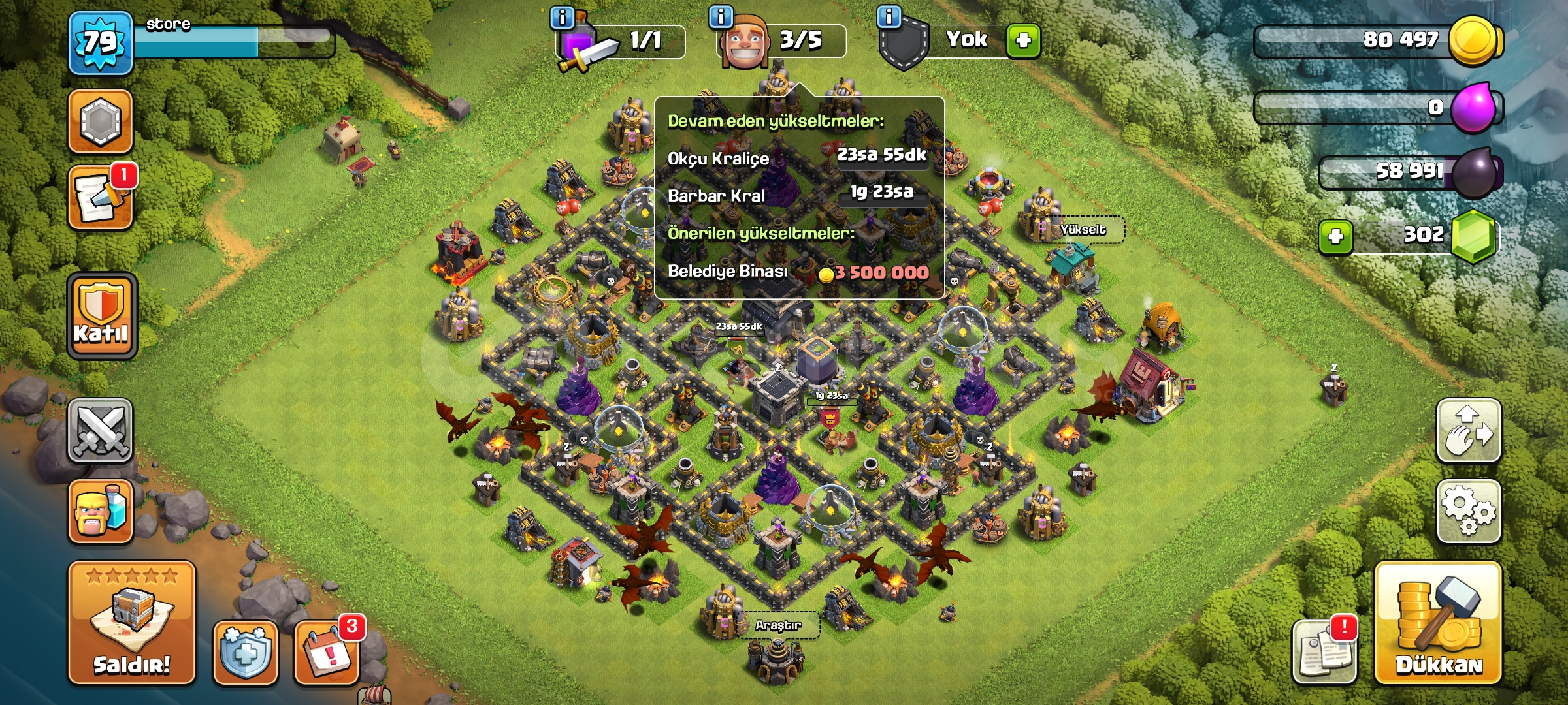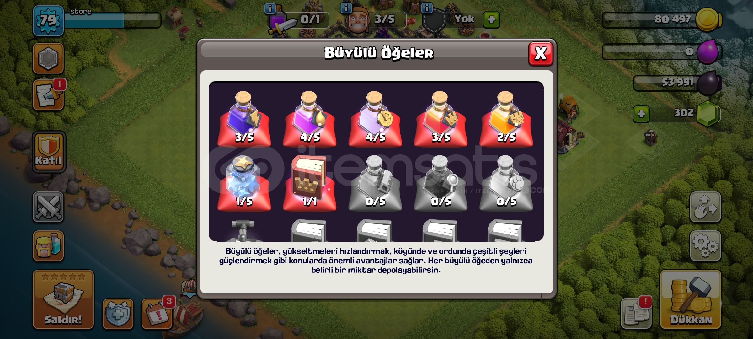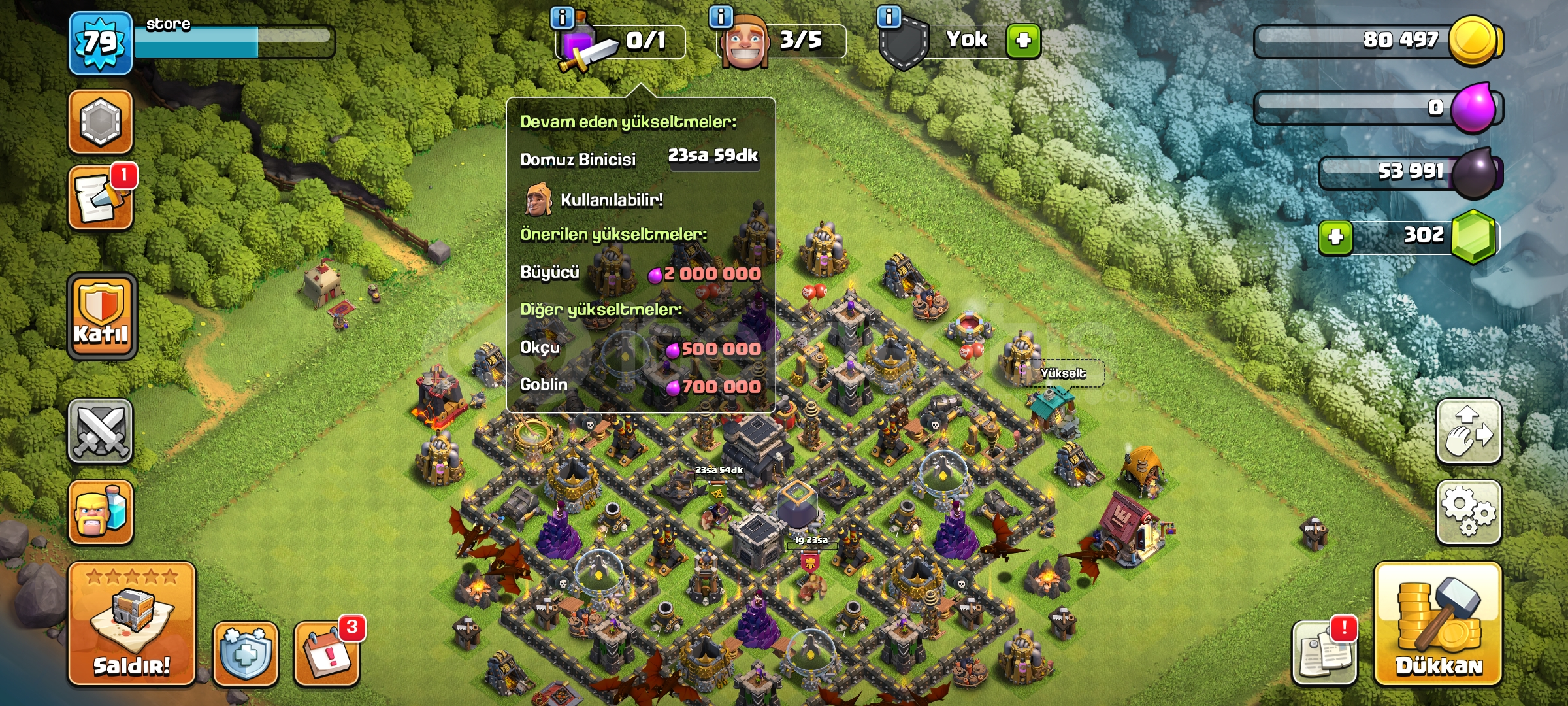 TH979lvl80 az kaldı1 tane kahramanlar kitapı321 elmasAna köyde Barbar,okçu kraliçe ve 4 tane yüksektme hariç herşey Max+maxBarbar kral 26lvl27 ye yükseliyorOkçu kraliçe 18 lvl19 yükseliyor yükseliyor Minyon prens 10 lvlMax 5 inşaatçı Telefon numarası bağlı değilE posta şifre verilecek